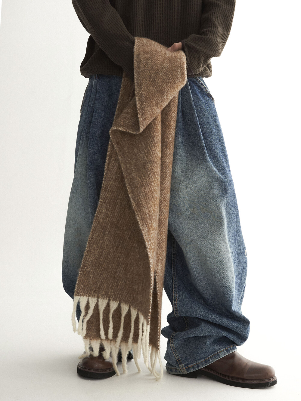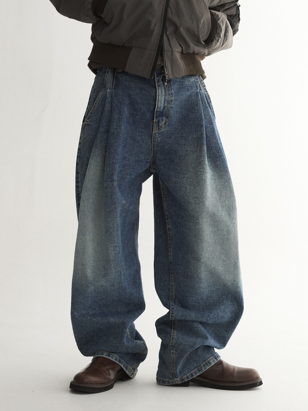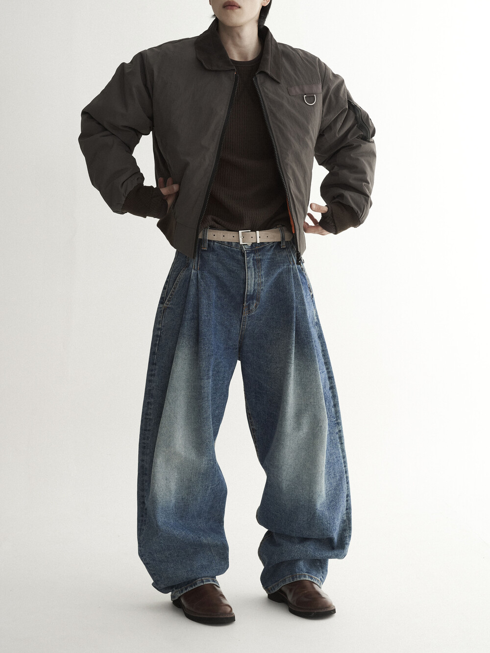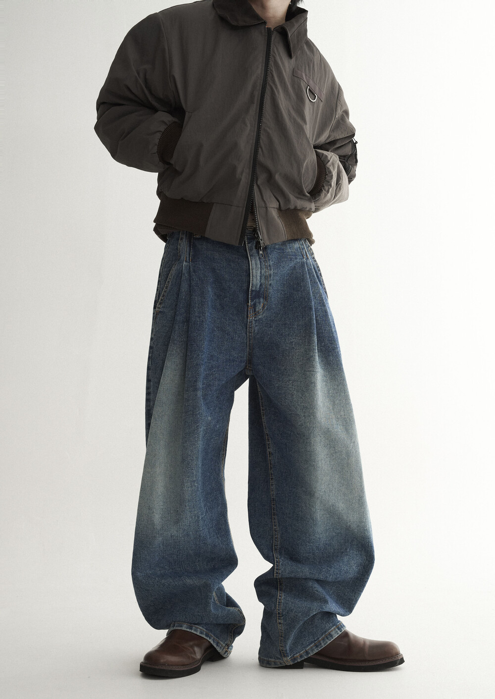 - 전면부 사이드 라인의 2핀턱 디테일로 제작된 와이드 데님팬츠