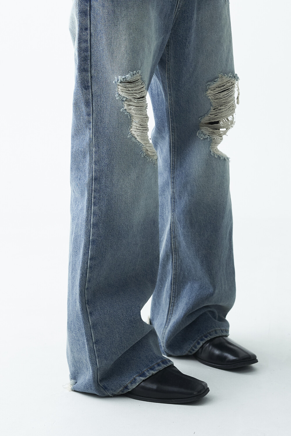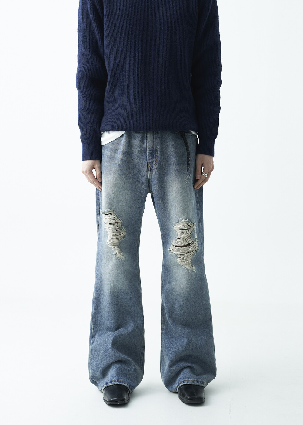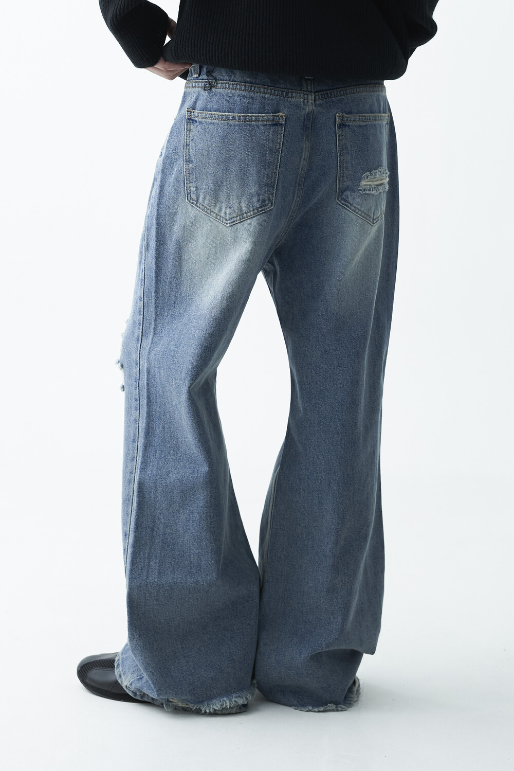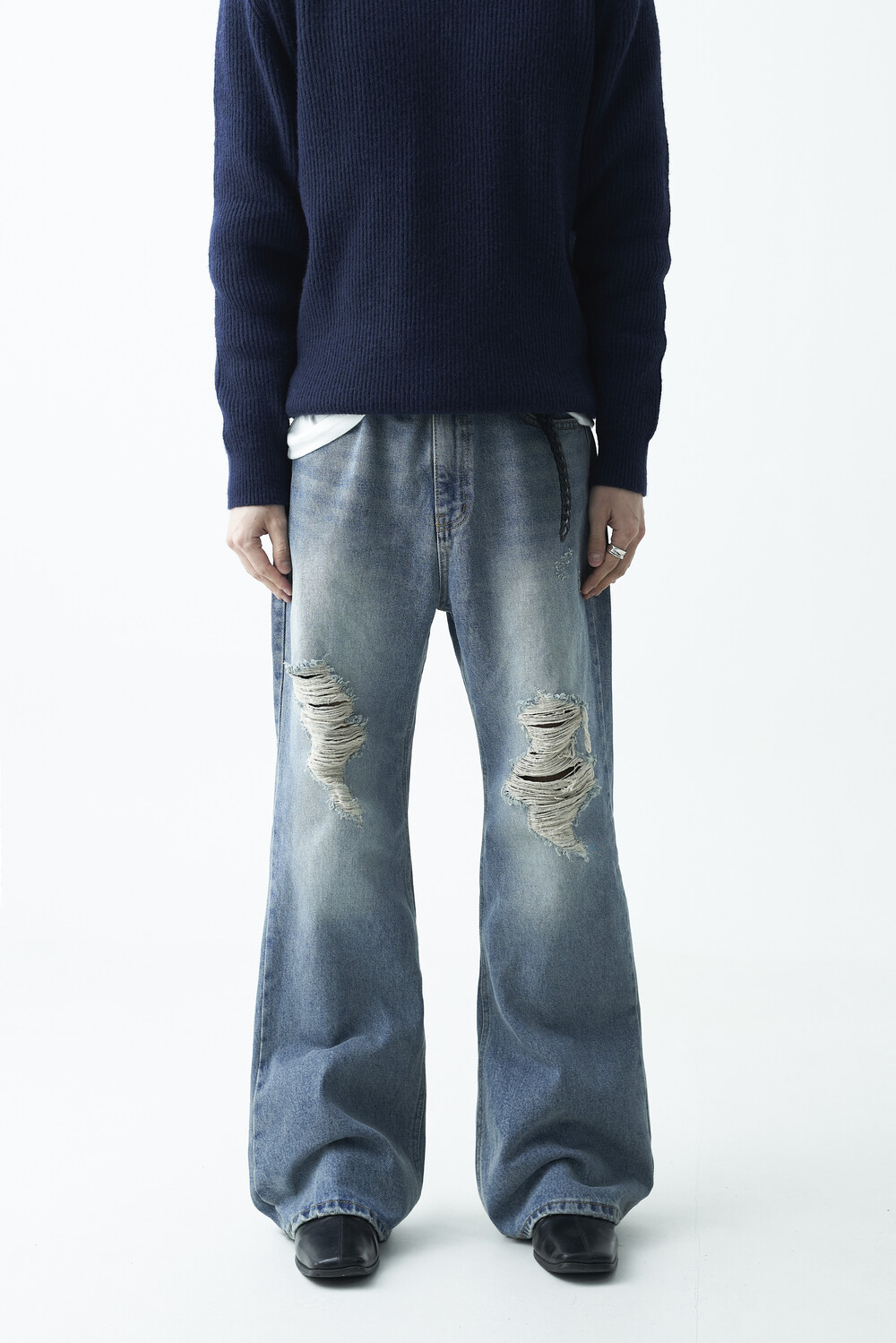 라이트블루 컬러의 연청데님 팬츠 제품으로 각 부분의 데미지 커팅이 디테일로 들어간 데님팬츠 입니다. 일반적인 빈티지 데님과 달리 부츠컷 플레어 핏으로 구성되어 그 유니크함이 잘 드러나는 제품입니다.