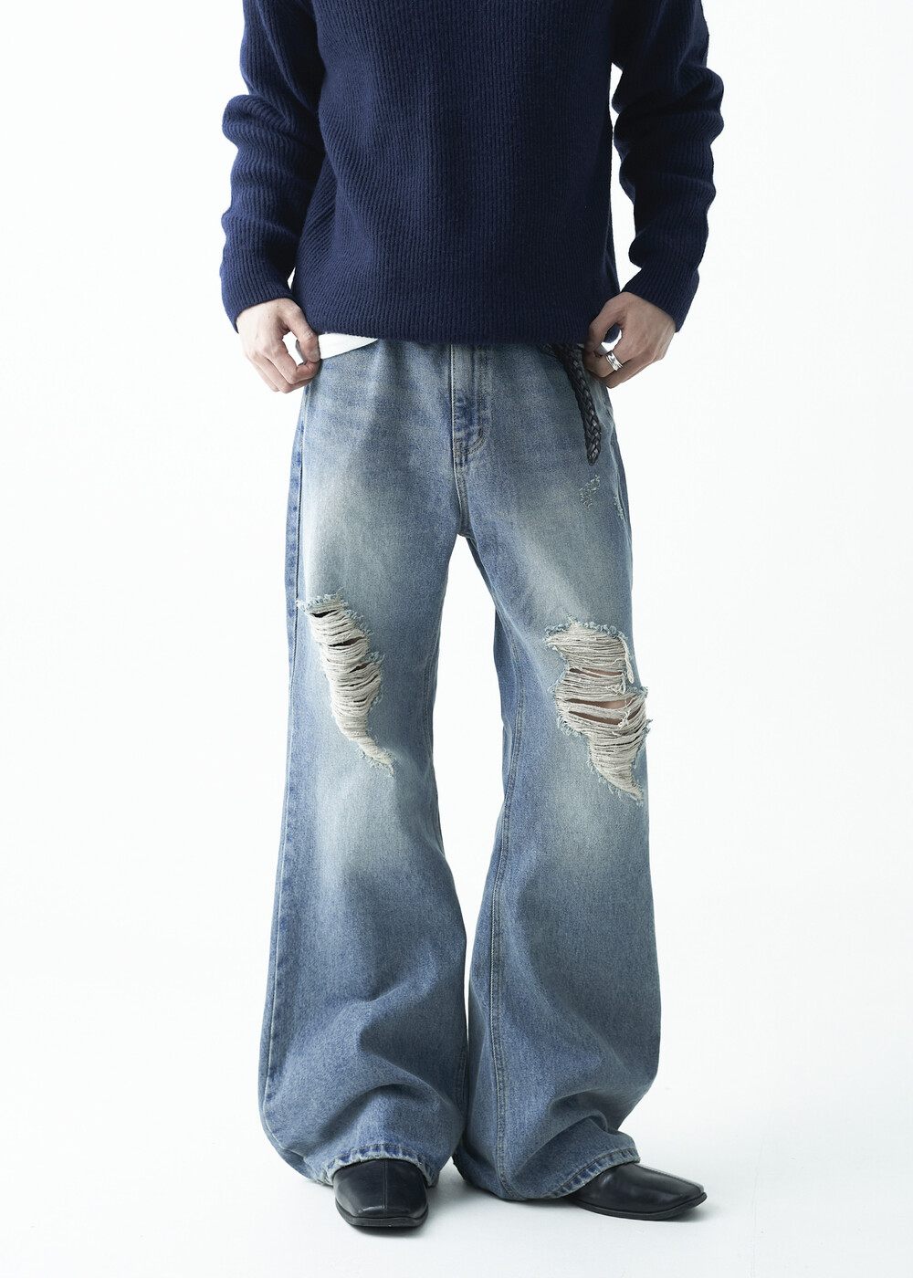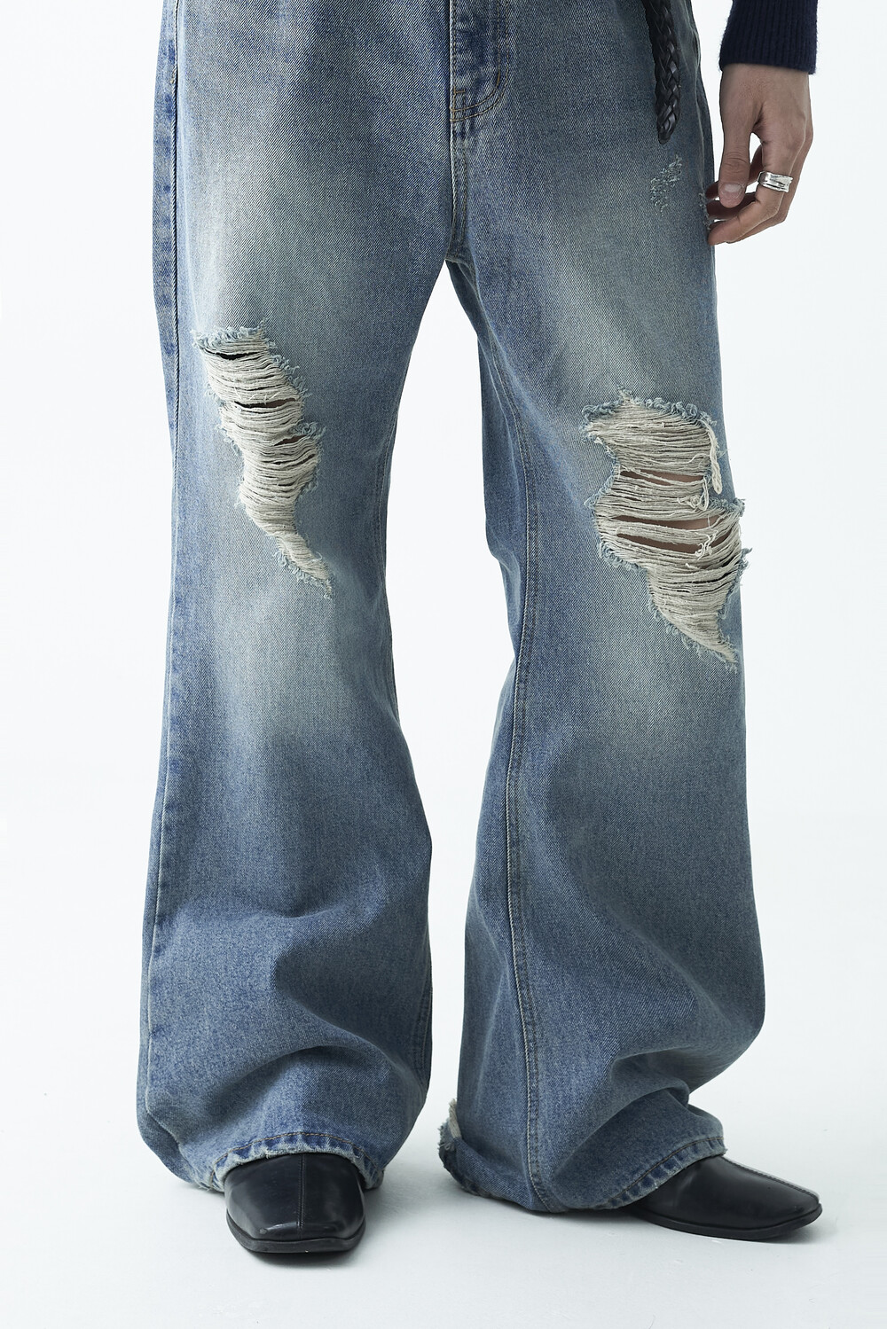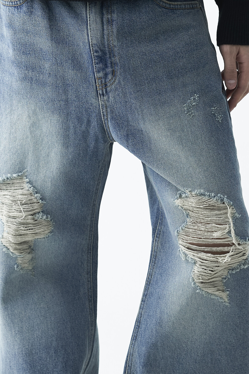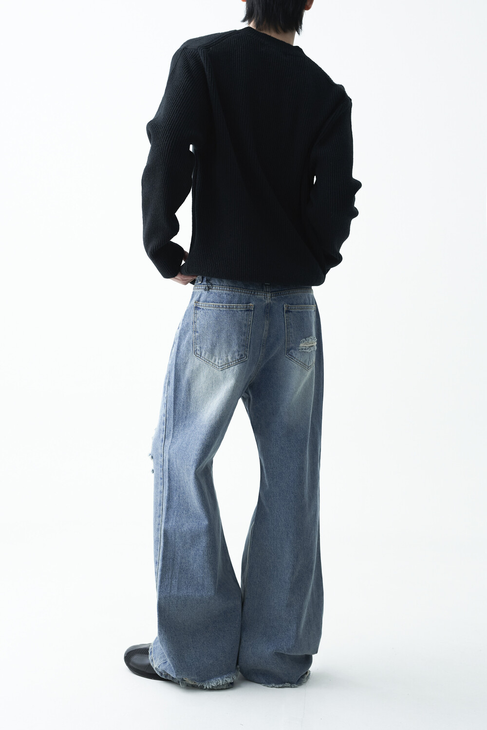 라이트블루 컬러의 연청데님 팬츠 제품으로 각 부분의 데미지 커팅이 디테일로 들어간 데님팬츠 입니다. 일반적인 빈티지 데님과 달리 부츠컷 플레어 핏으로 구성되어 그 유니크함이 잘 드러나는 제품입니다.