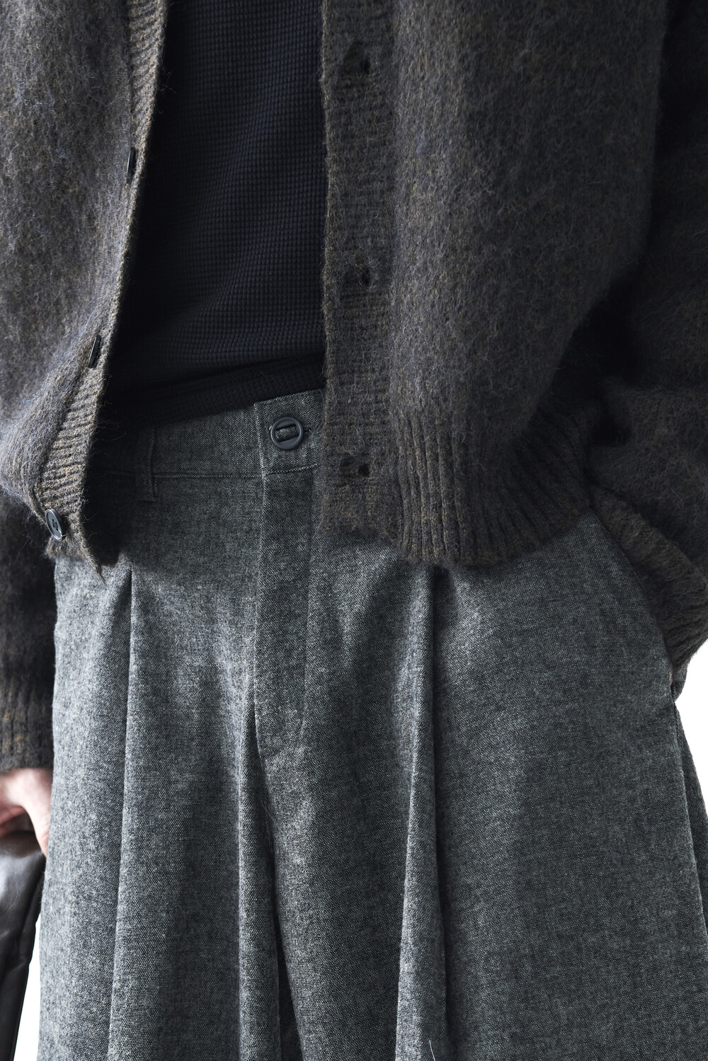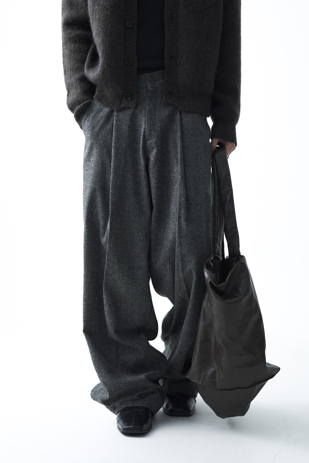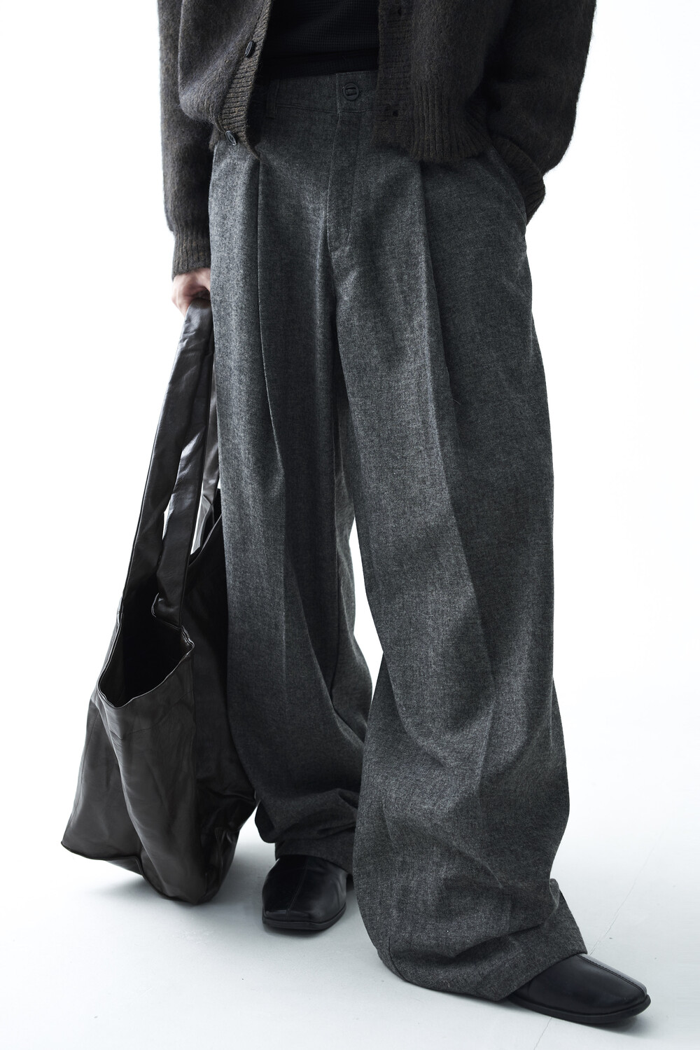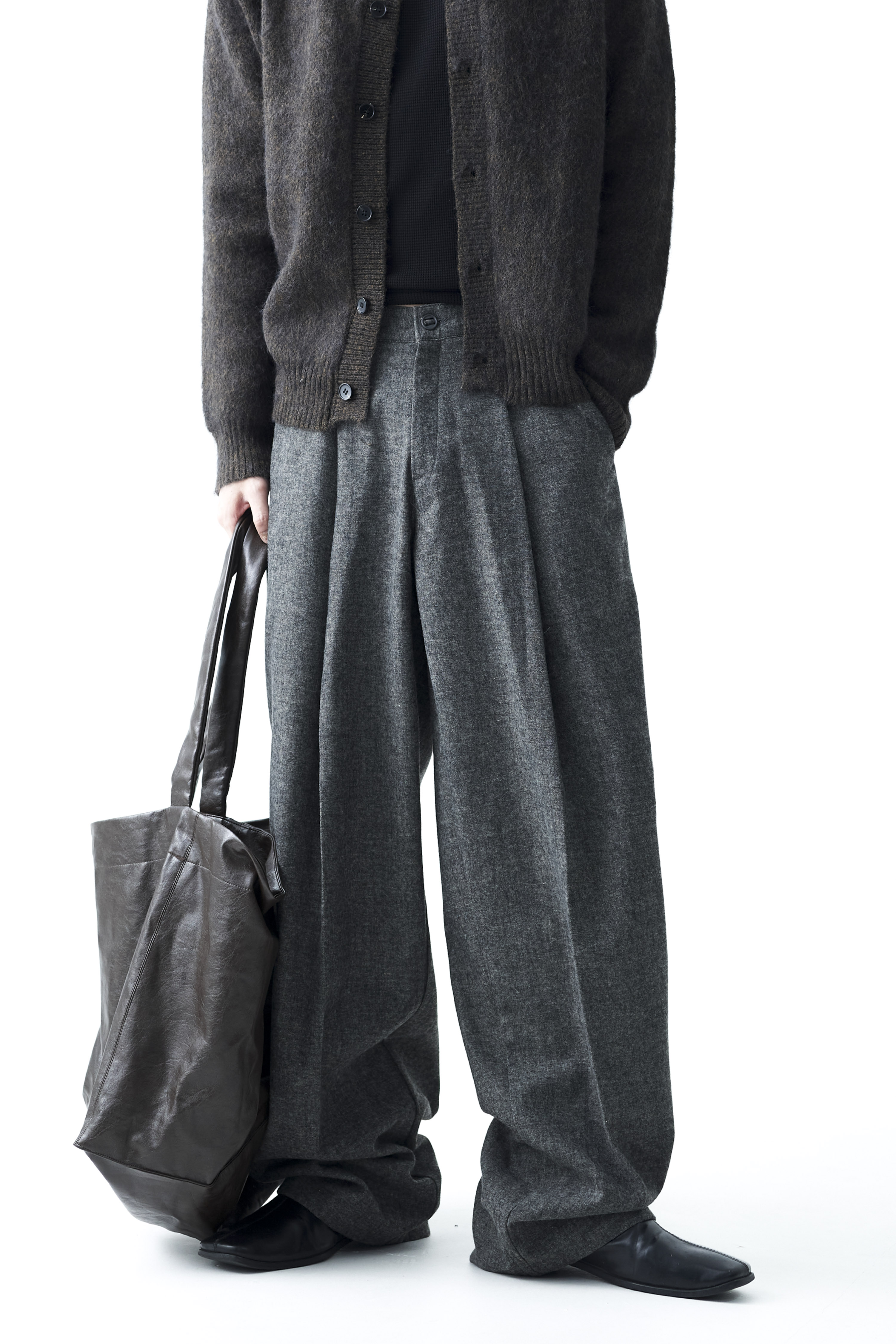 - 전면부 1개의 고정된 핀턱 스타일의 와이드 울 슬렉스 제품입니다. 미니멀한 비죠 버튼이 적용되어 있으며 자연스럽게 찰랑이는 와이드 실루엣이 가장 매력적인 슬렉스입니다.