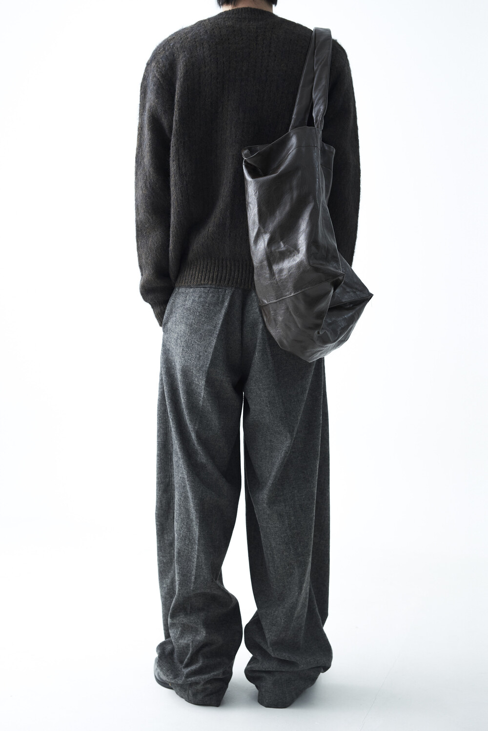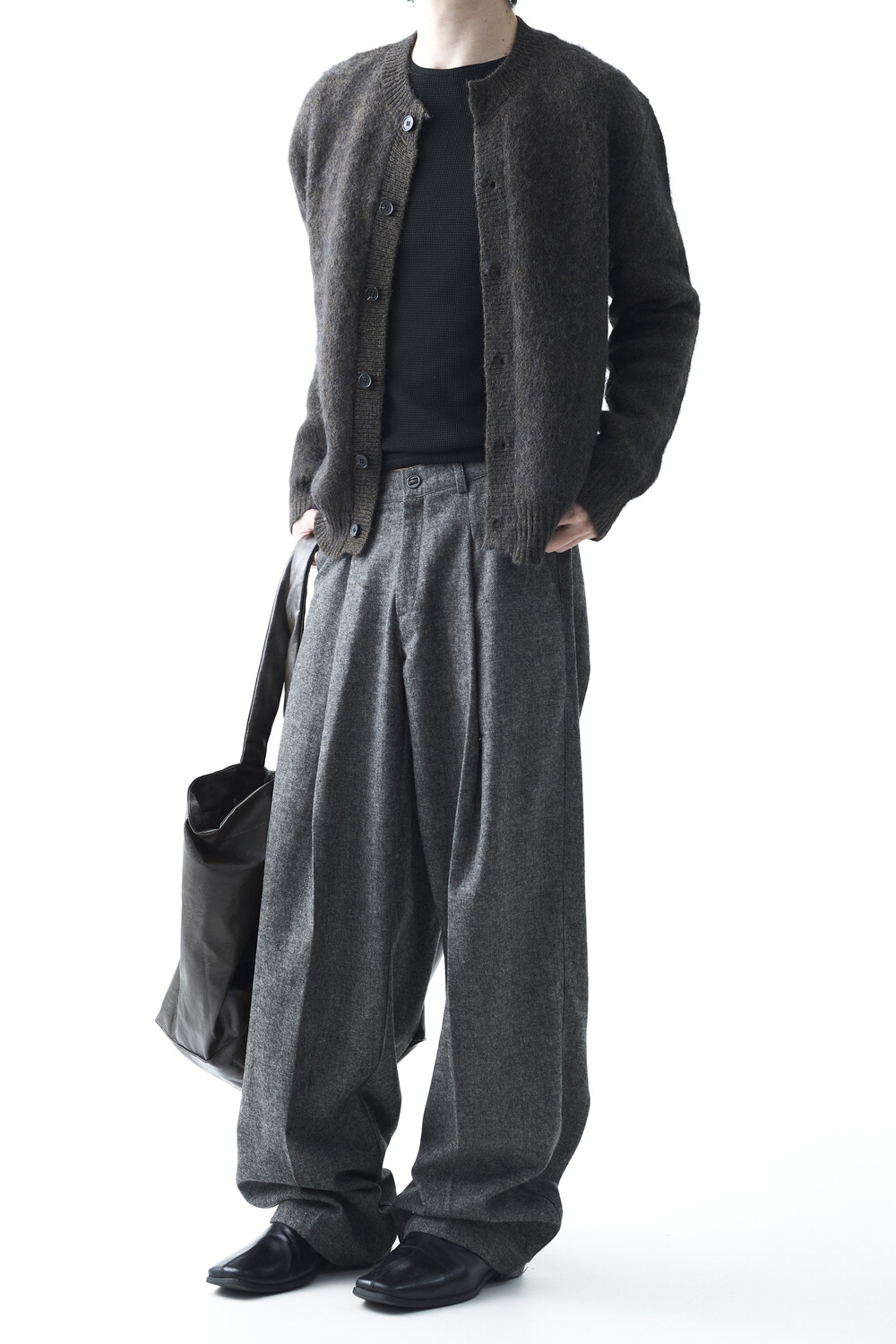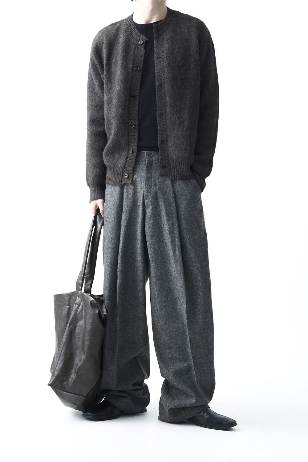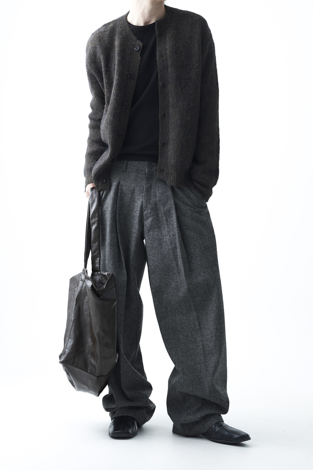 - 전면부 1개의 고정된 핀턱 스타일의 와이드 울 슬렉스 제품입니다. 미니멀한 비죠 버튼이 적용되어 있으며 자연스럽게 찰랑이는 와이드 실루엣이 가장 매력적인 슬렉스입니다.