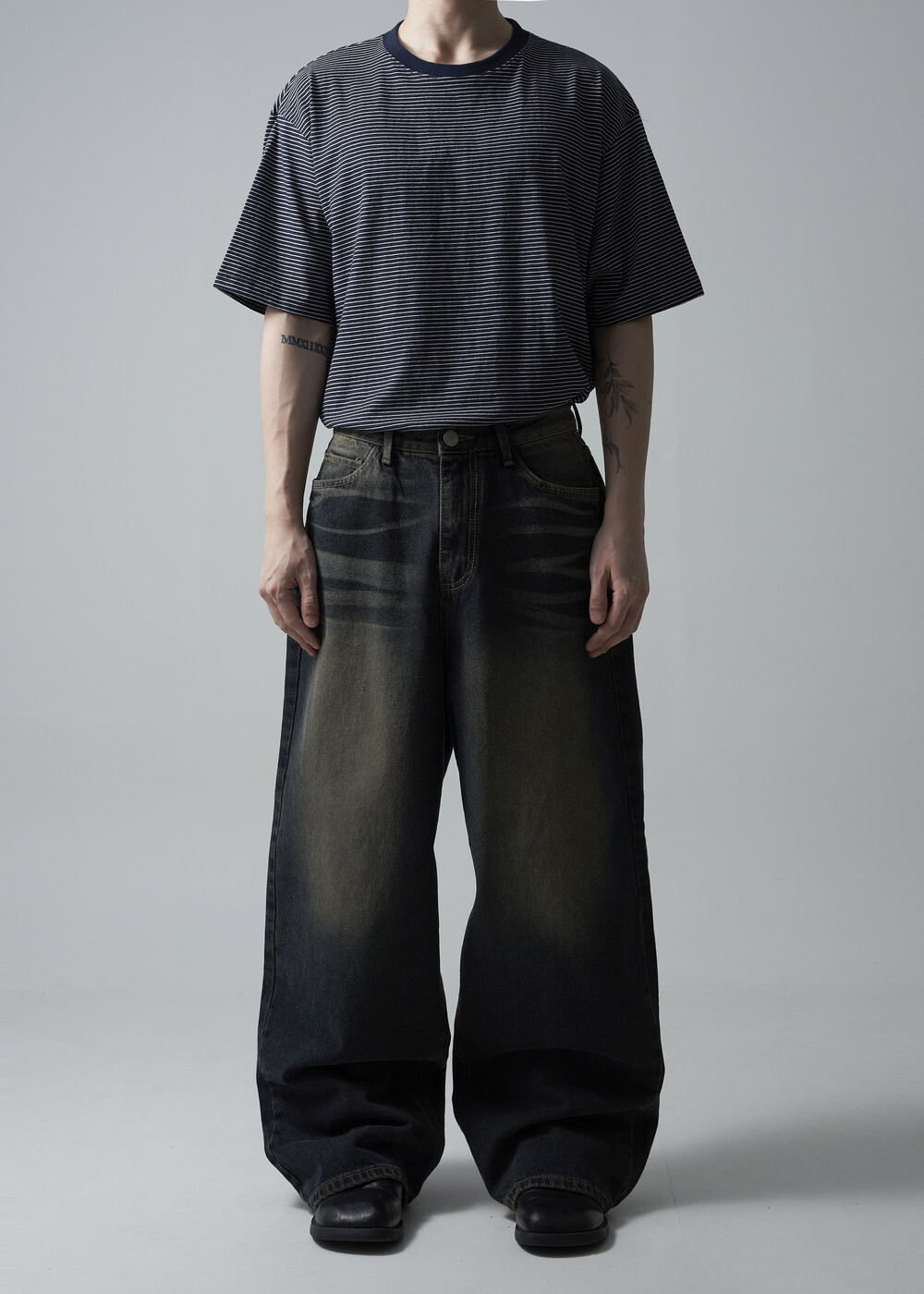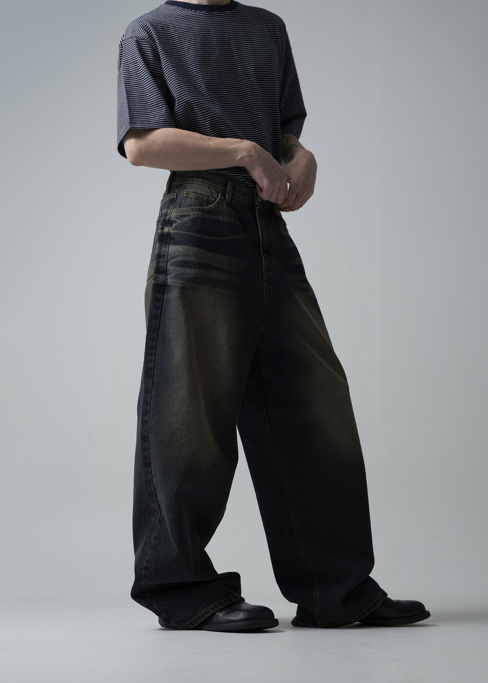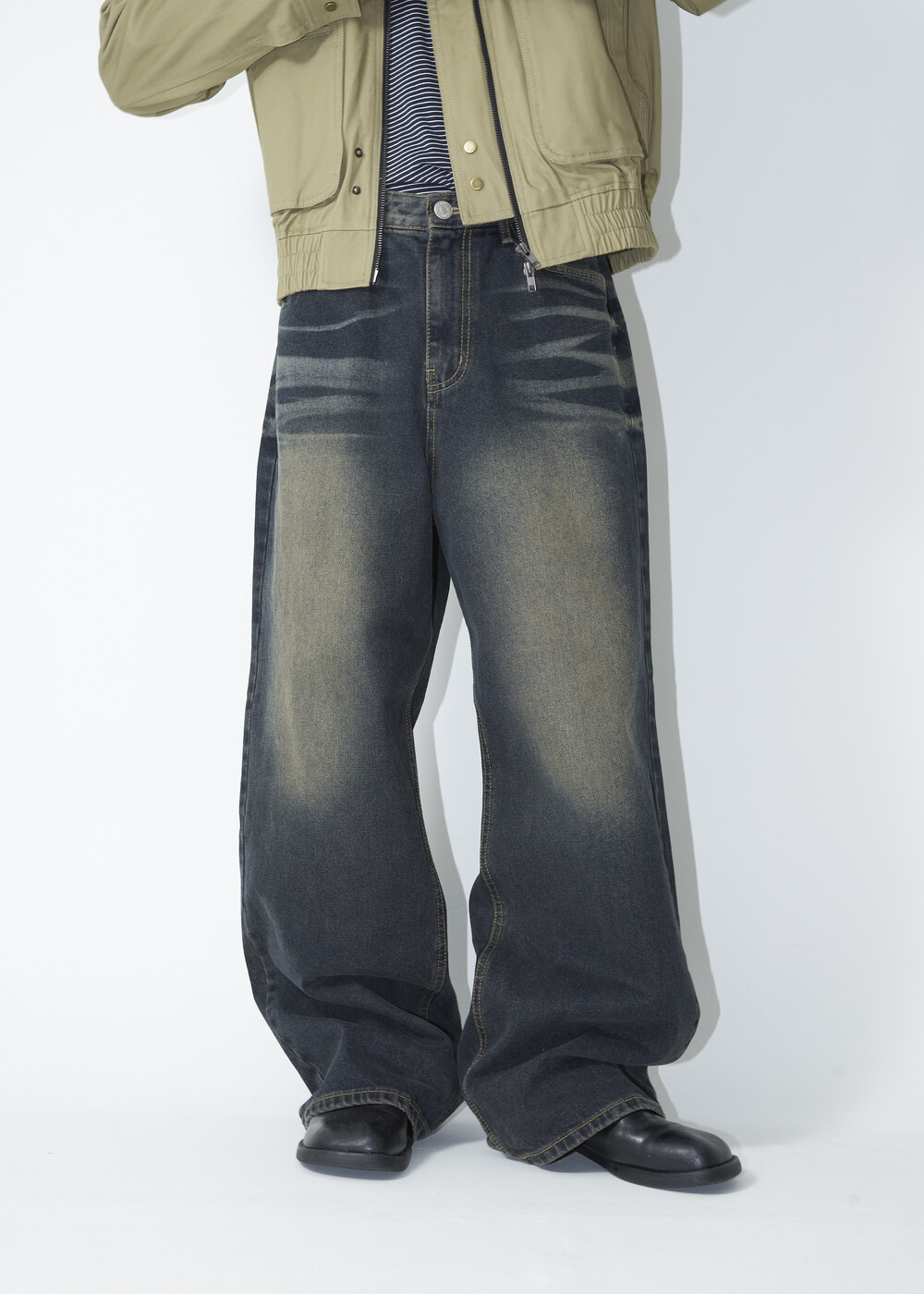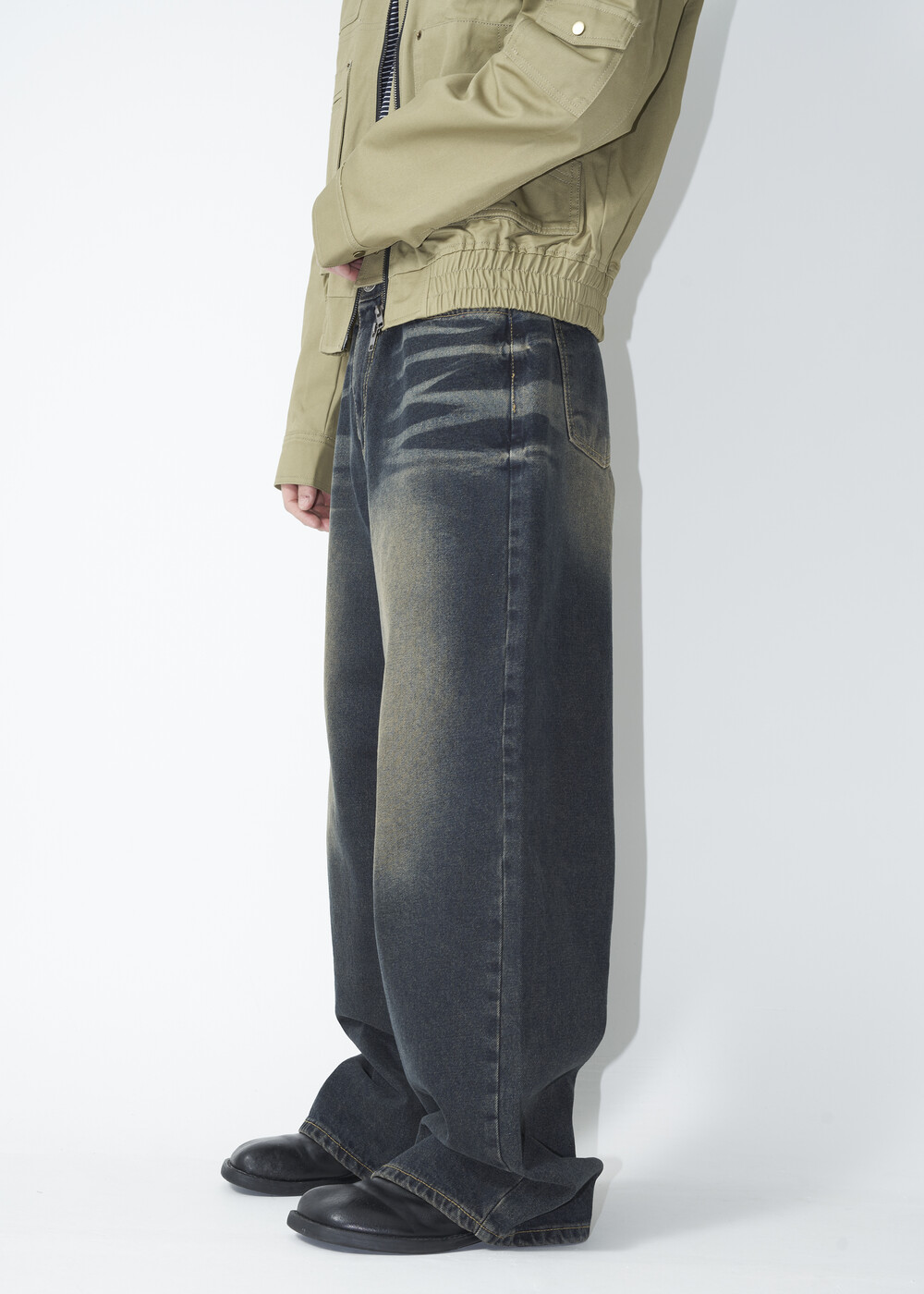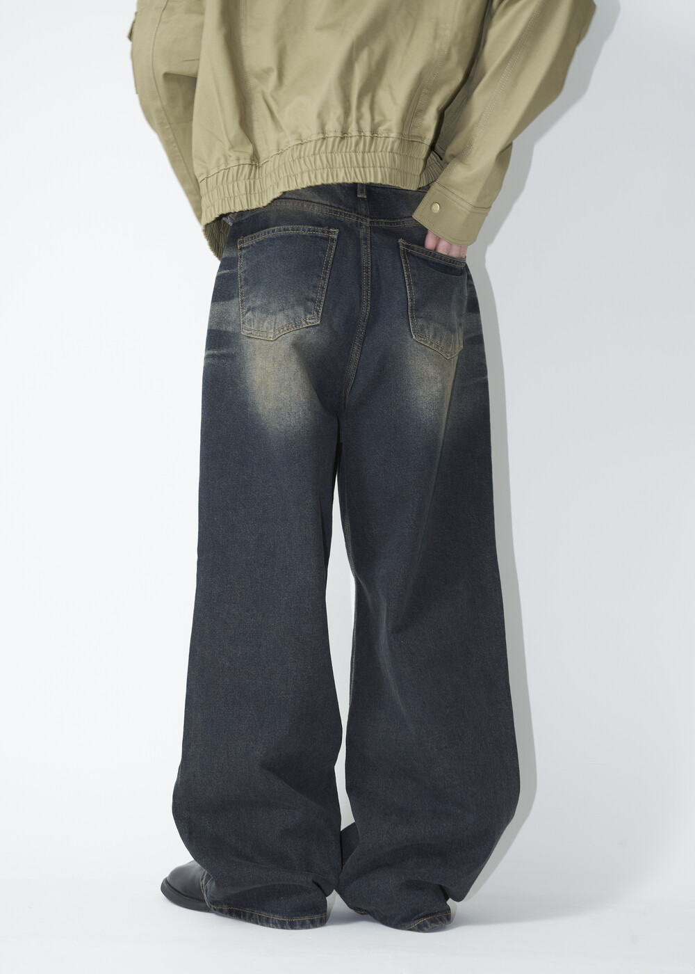 - 입체적인 캣워싱 가공 작업을 통해 볼드한 실루엣의 워싱 와이드 데님팬츠 제품