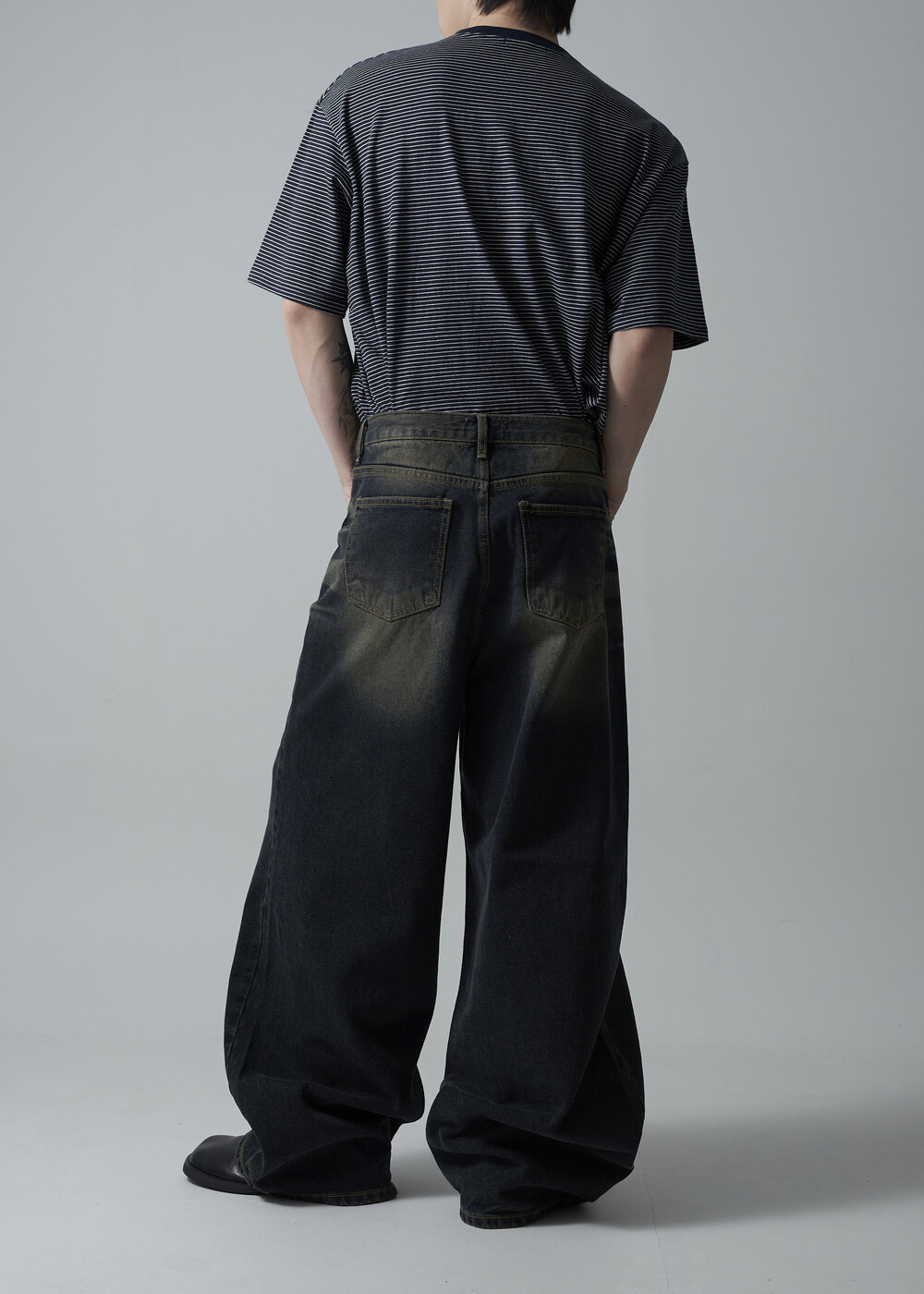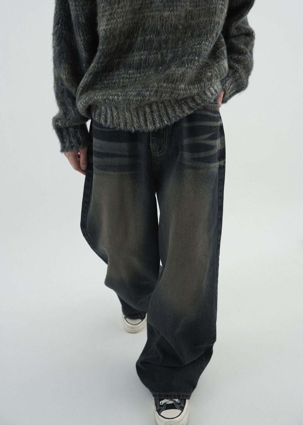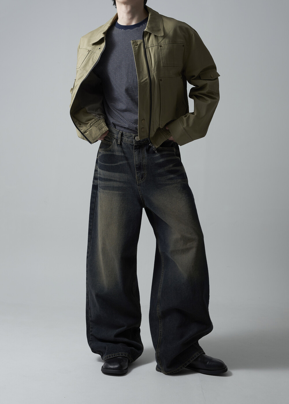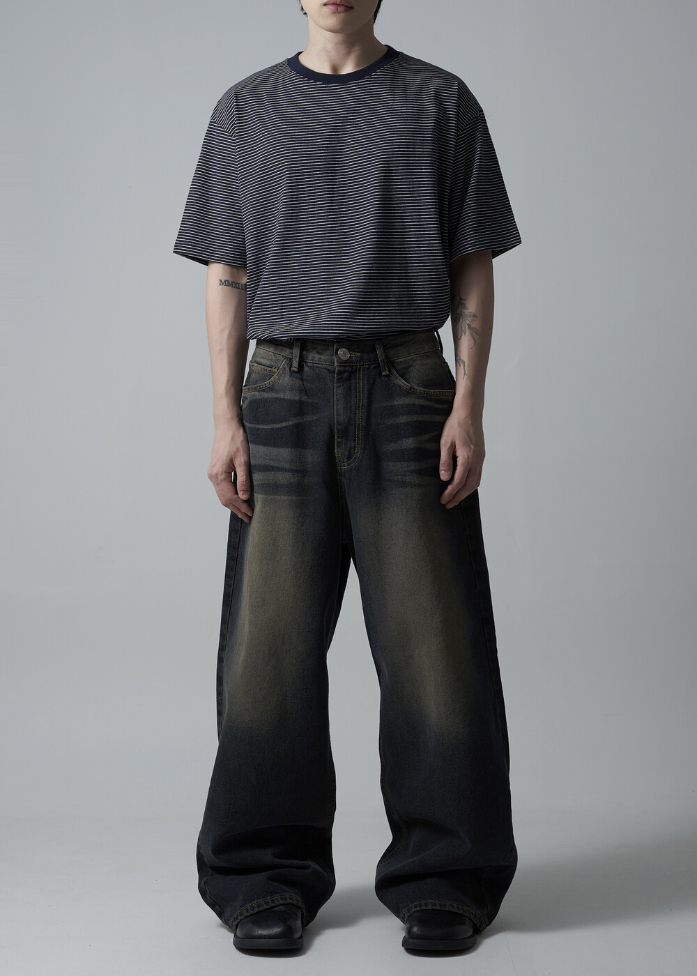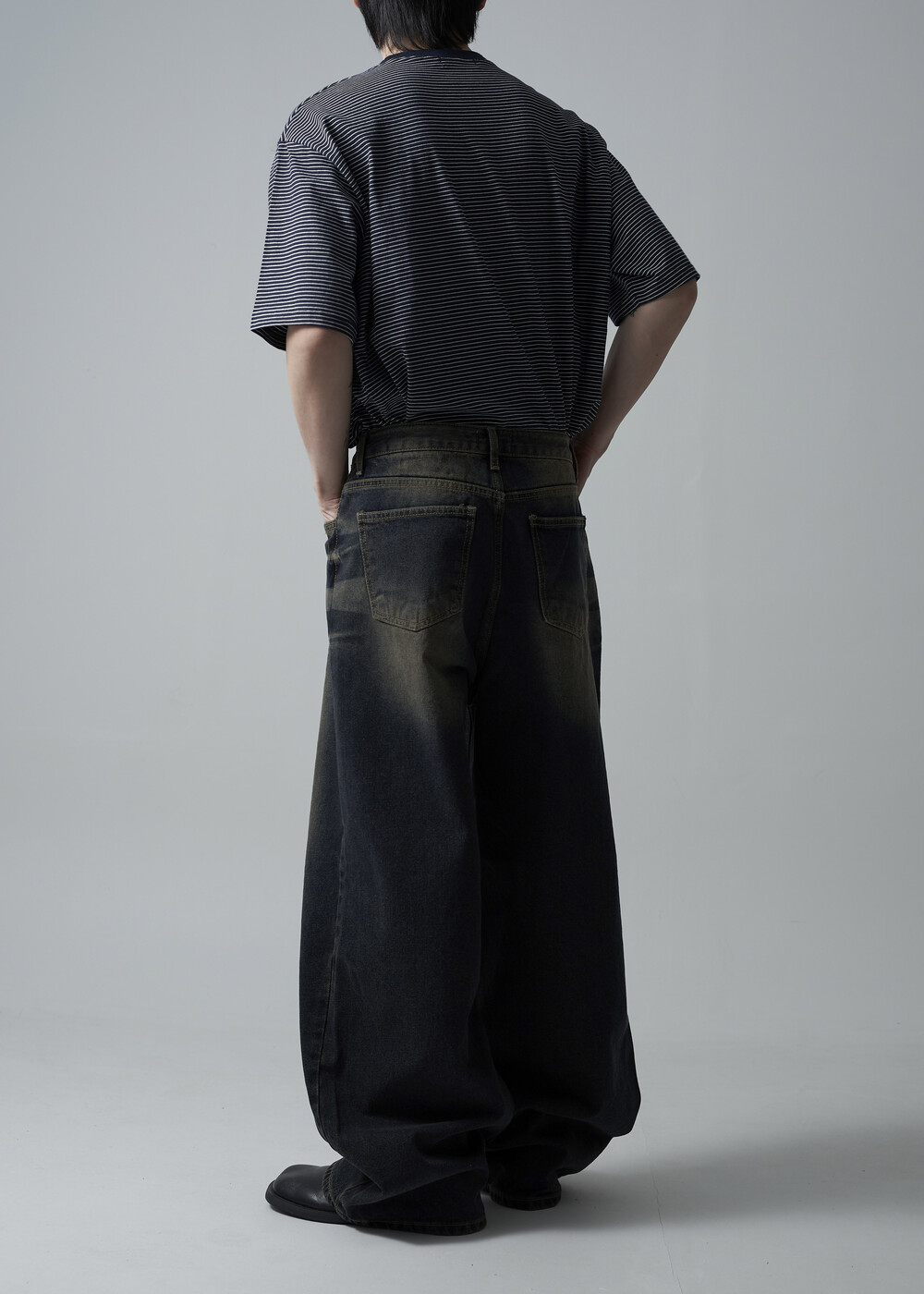 - 입체적인 캣워싱 가공 작업을 통해 볼드한 실루엣의 워싱 와이드 데님팬츠 제품