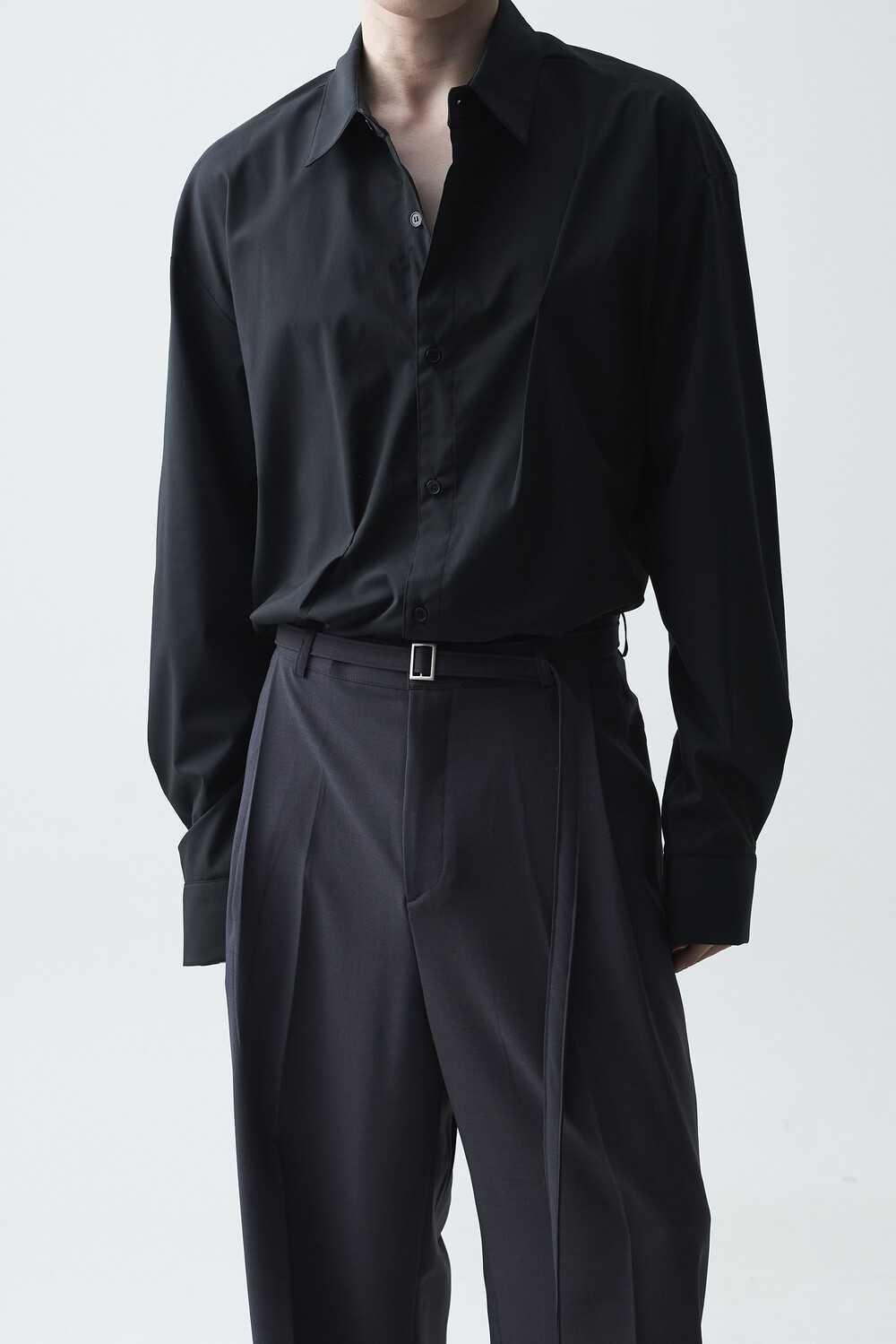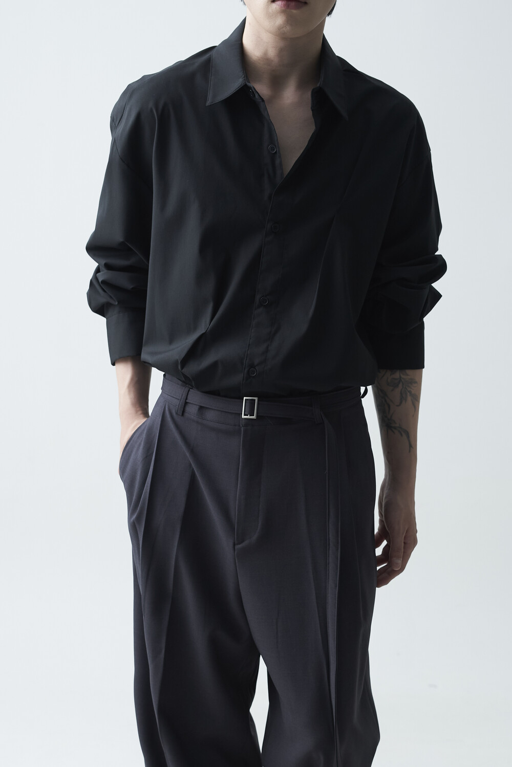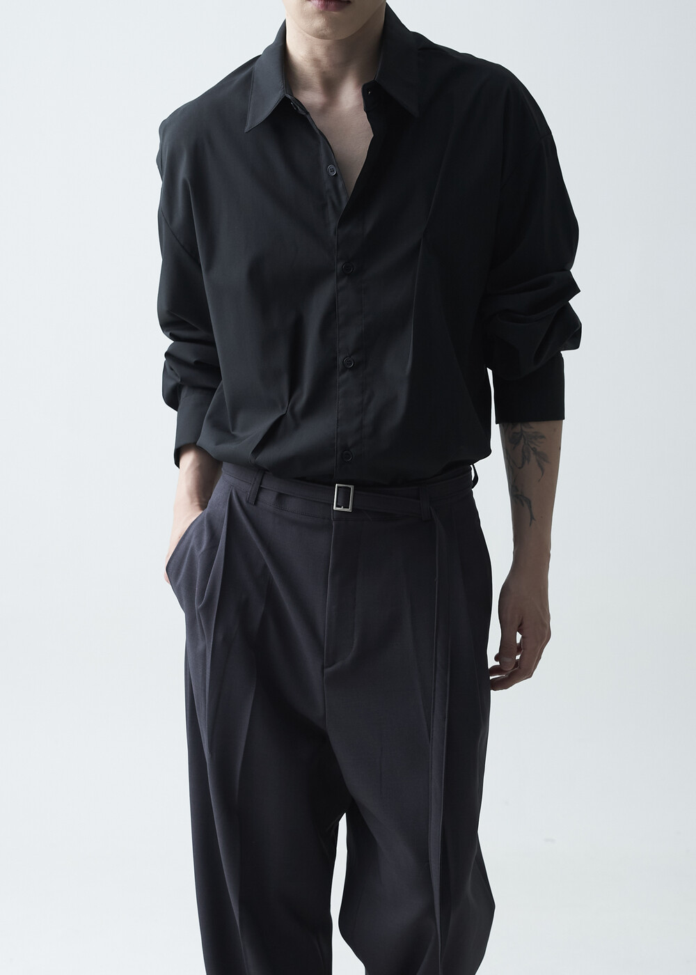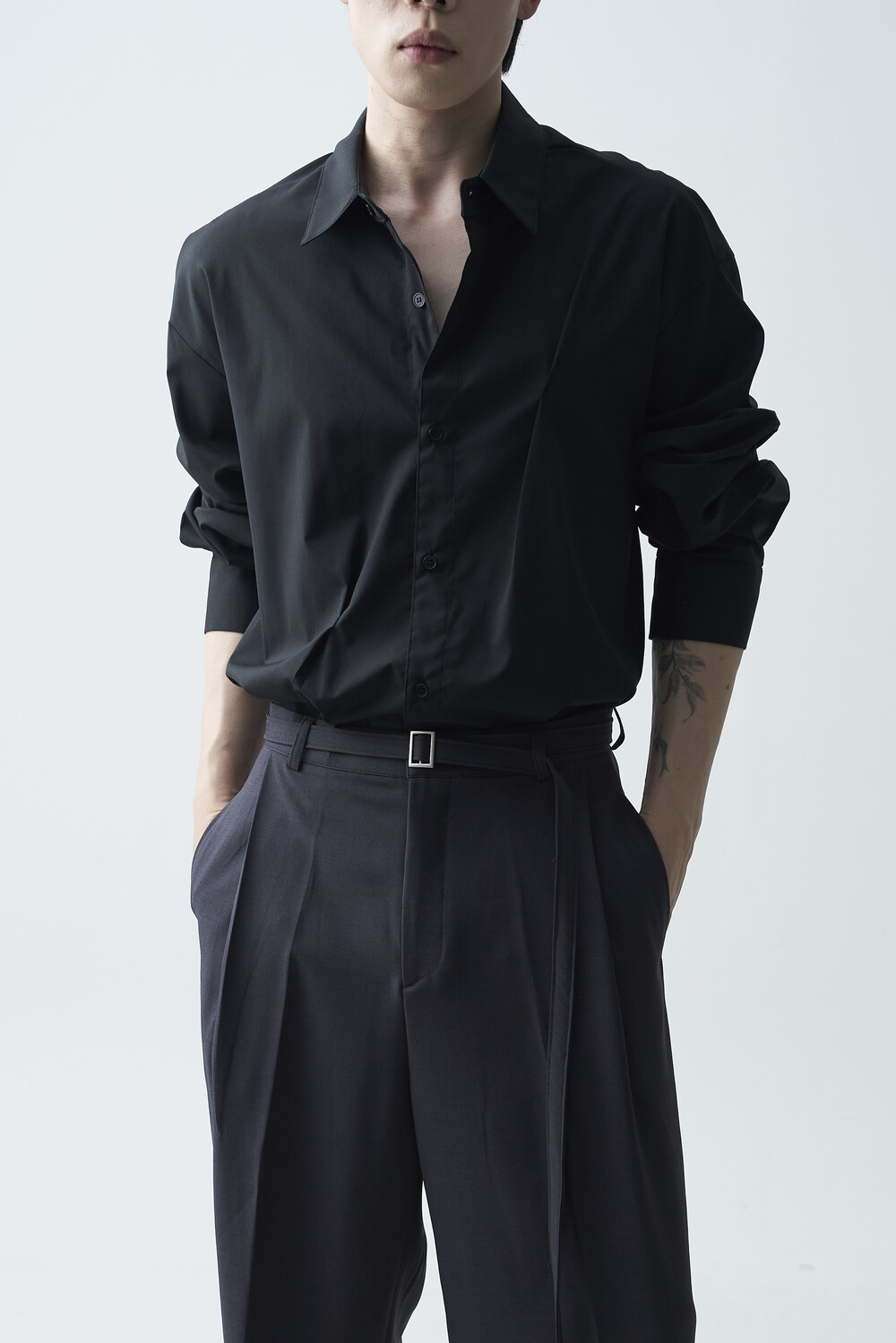 포멀한 블랙 컬러감으로 미니멀한 무드 연출을 표현하는 셔츠 제품입니다. 전면부의 바텍(핀턱) 디테일이 적용되어 유니크한 포인트를 자아내며, 깔끔한 아웃핏을 표현합니다.