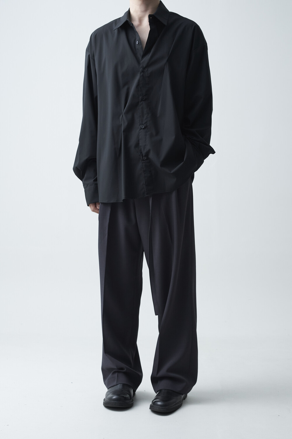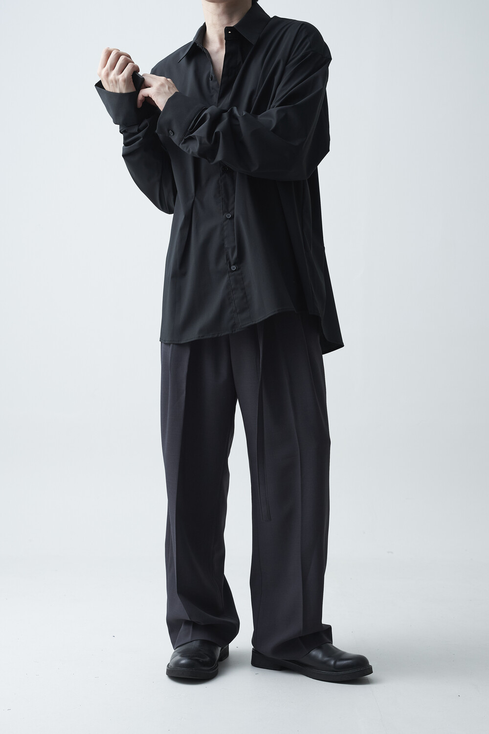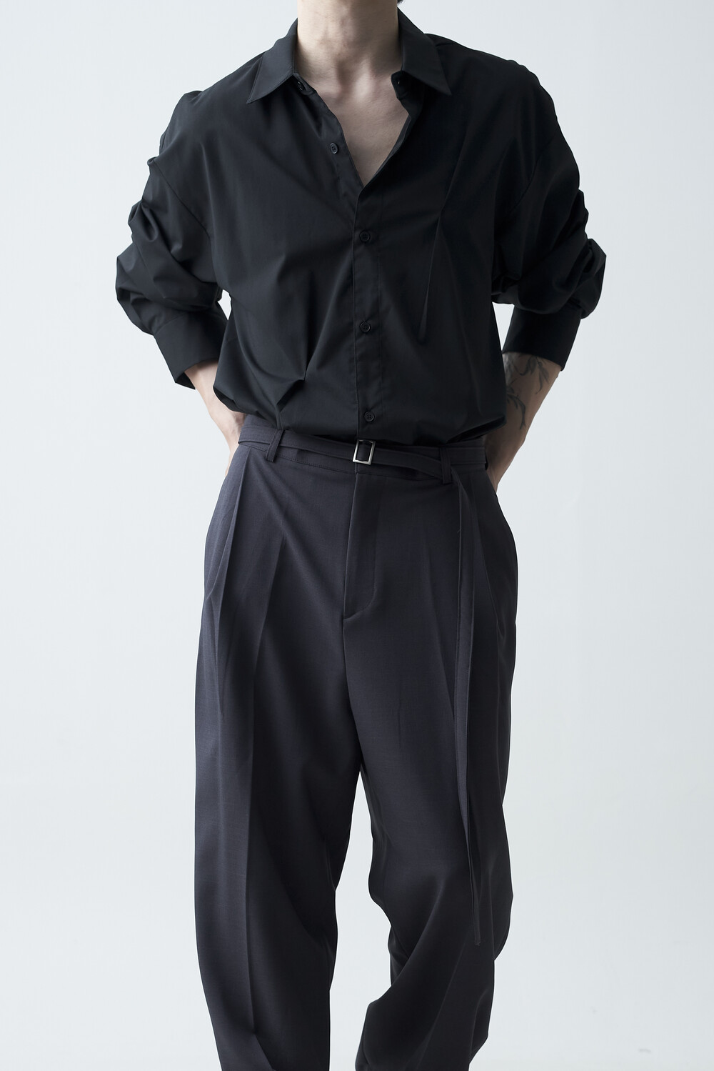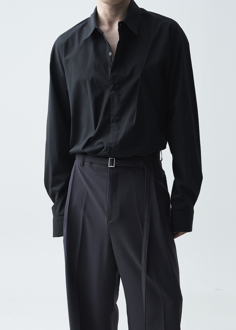 포멀한 블랙 컬러감으로 미니멀한 무드 연출을 표현하는 셔츠 제품입니다. 전면부의 바텍(핀턱) 디테일이 적용되어 유니크한 포인트를 자아내며, 깔끔한 아웃핏을 표현합니다.