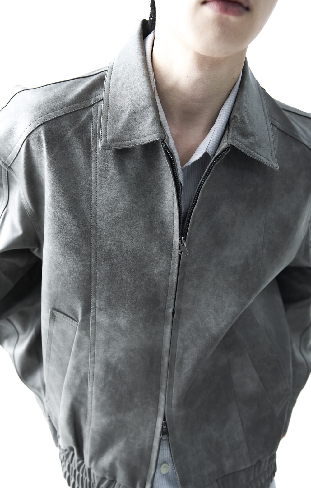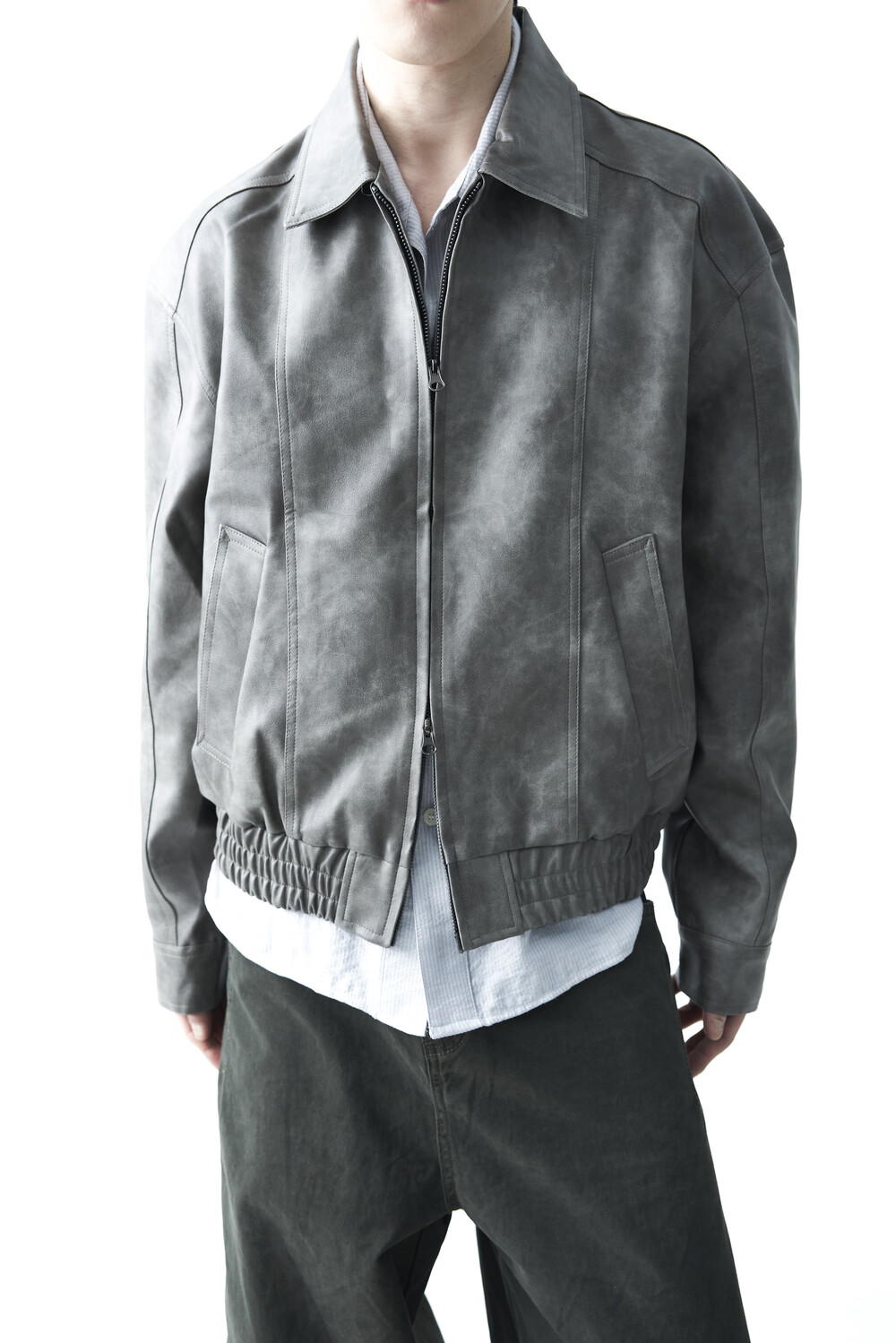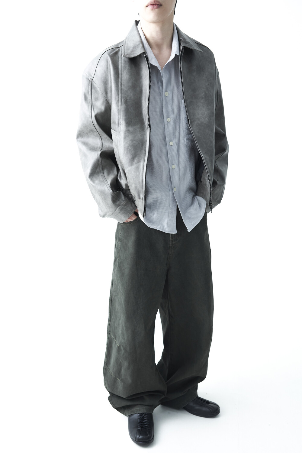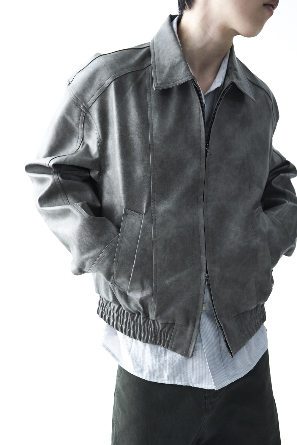 - 유니크한 크랙워싱 패턴이 매력적인 레더 자켓, 클래식에 충실한 라펠과 포켓 라이닝이 적용되었으며, 크롭한 기장감과 함께 볼드한 밴디드 밑단으로 구성되었습니다.
