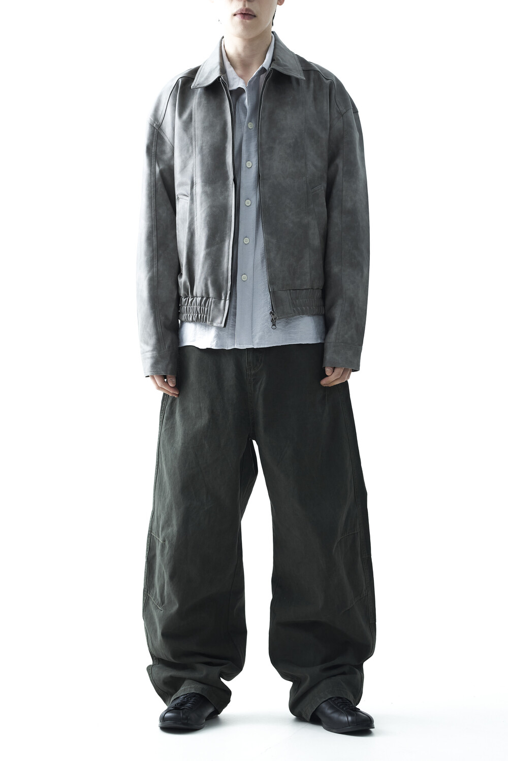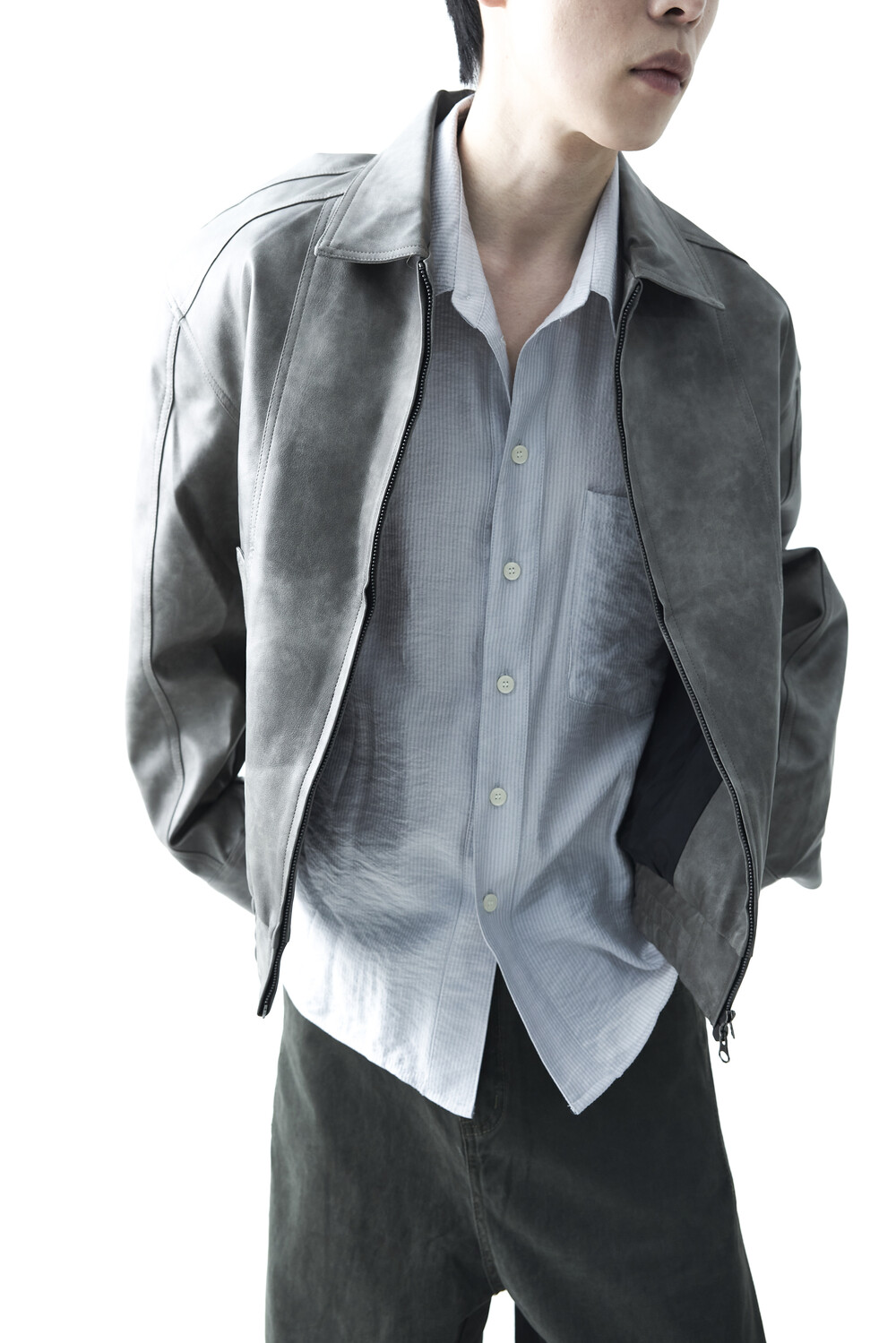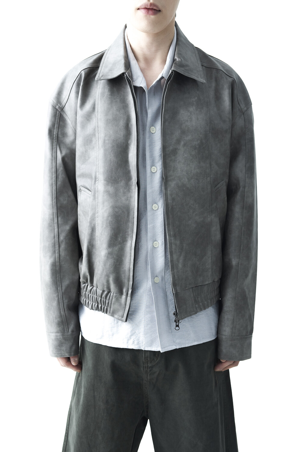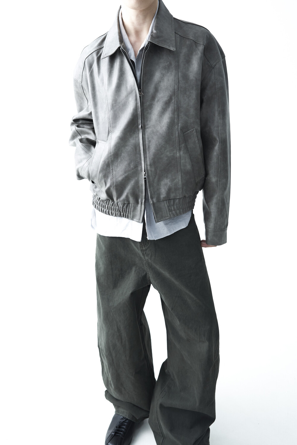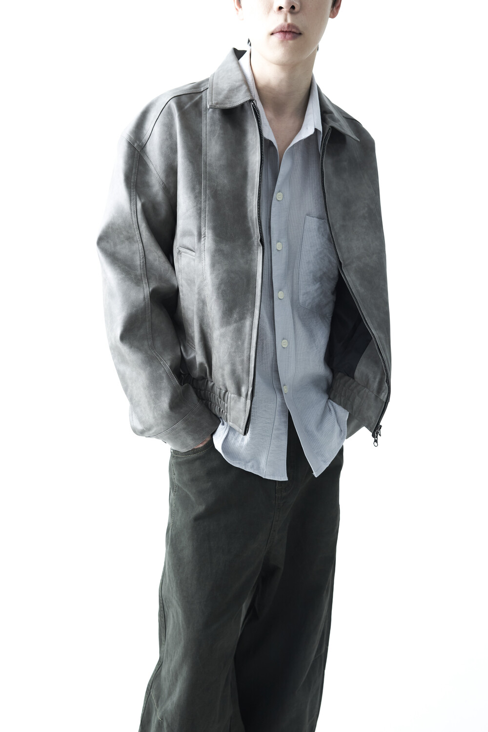 - 유니크한 크랙워싱 패턴이 매력적인 레더 자켓, 클래식에 충실한 라펠과 포켓 라이닝이 적용되었으며, 크롭한 기장감과 함께 볼드한 밴디드 밑단으로 구성되었습니다.