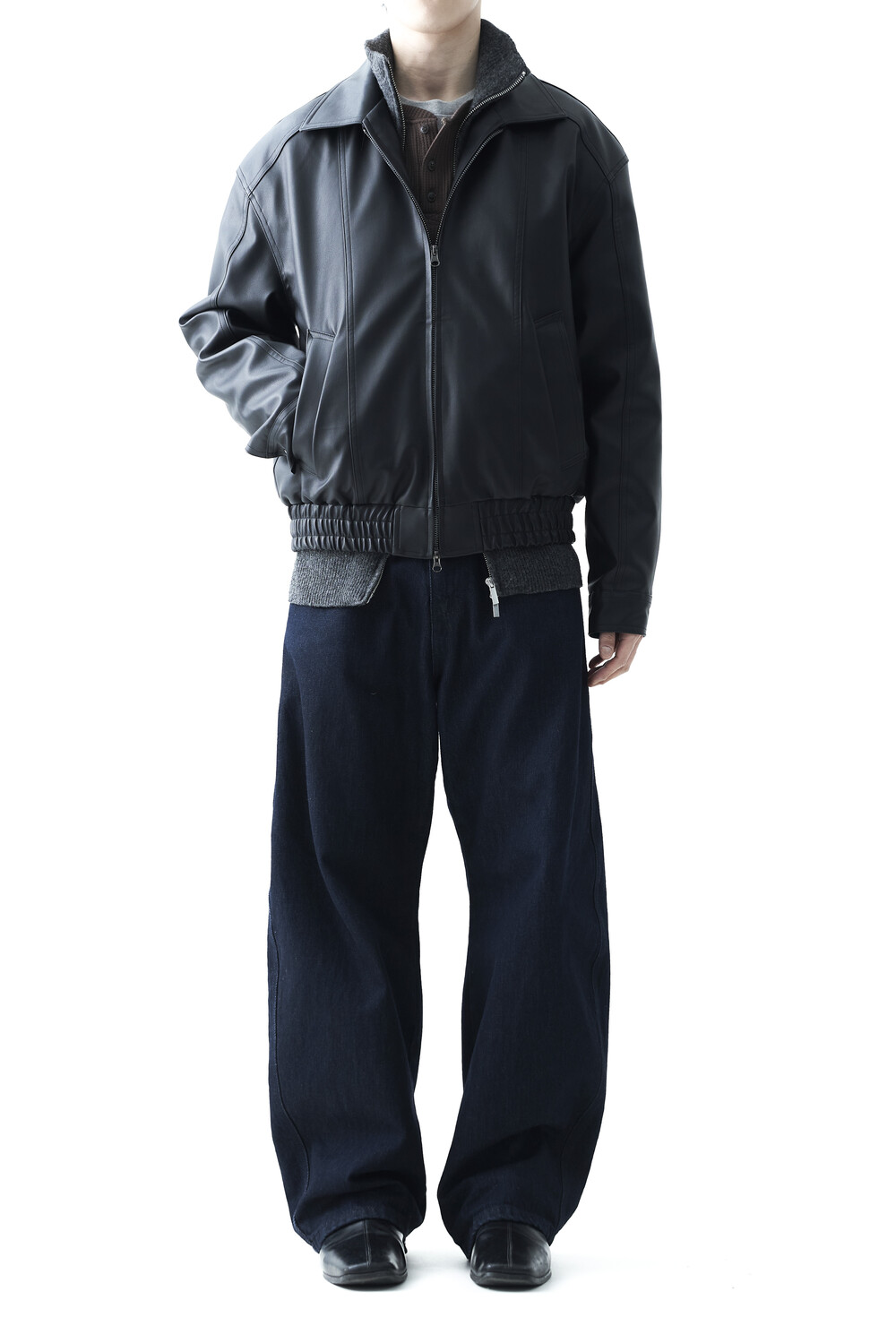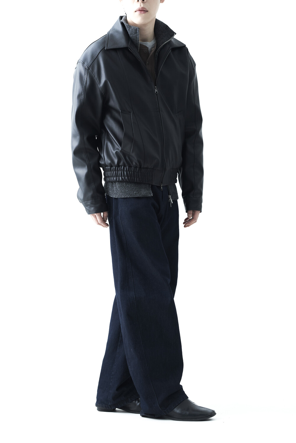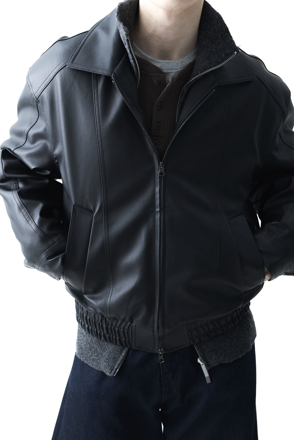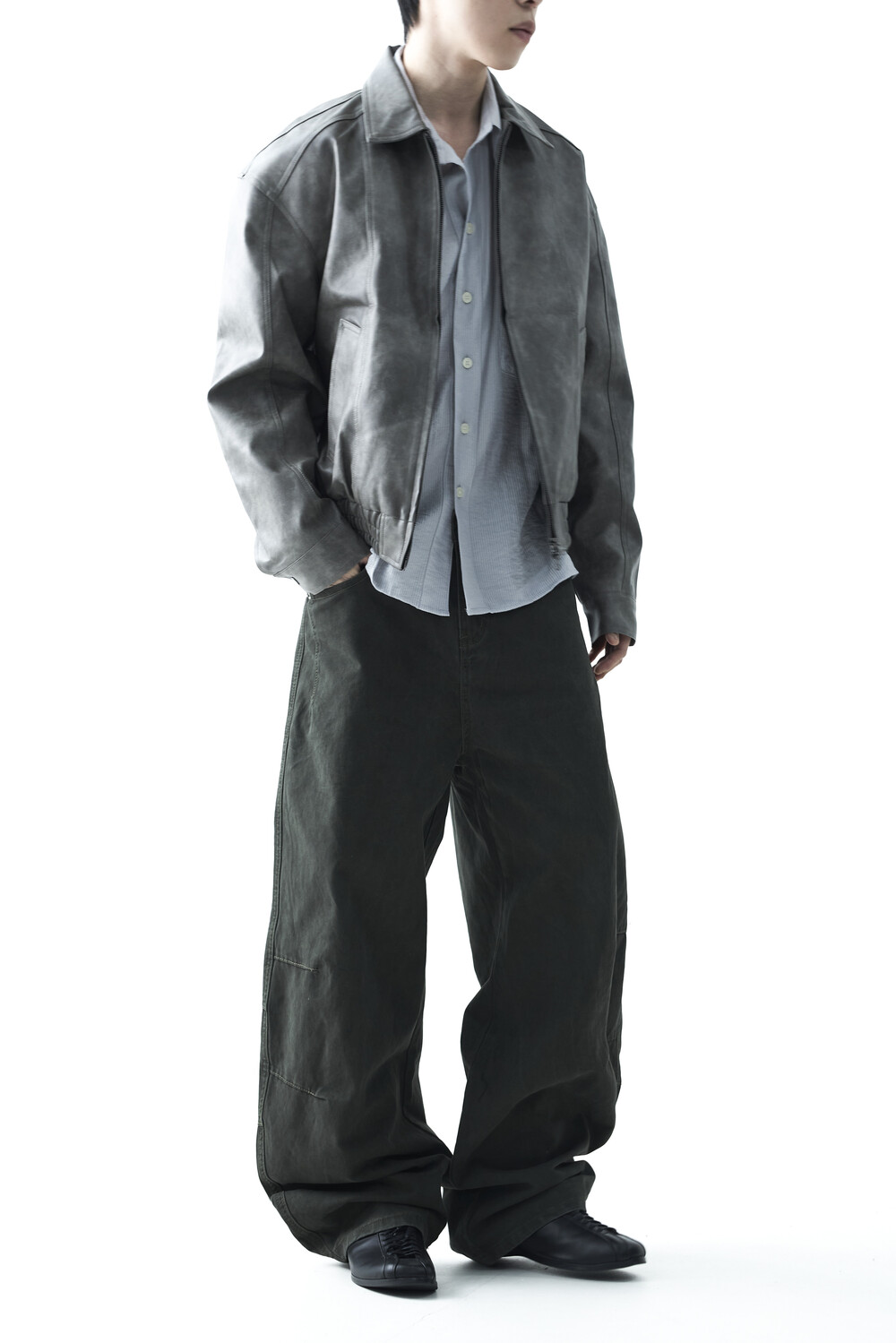 - 유니크한 크랙워싱 패턴이 매력적인 레더 자켓, 클래식에 충실한 라펠과 포켓 라이닝이 적용되었으며, 크롭한 기장감과 함께 볼드한 밴디드 밑단으로 구성되었습니다.