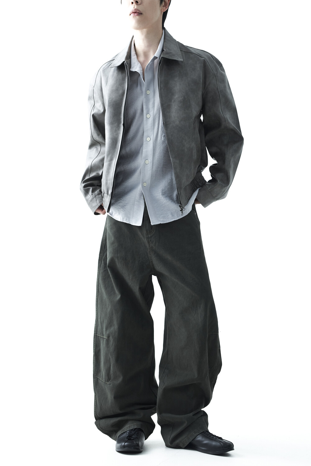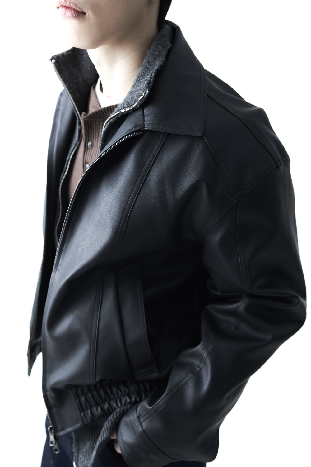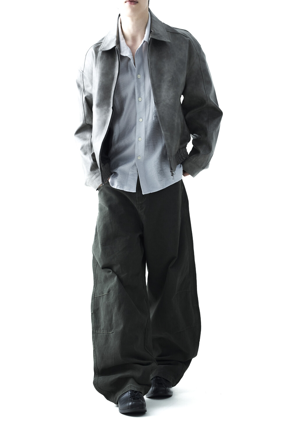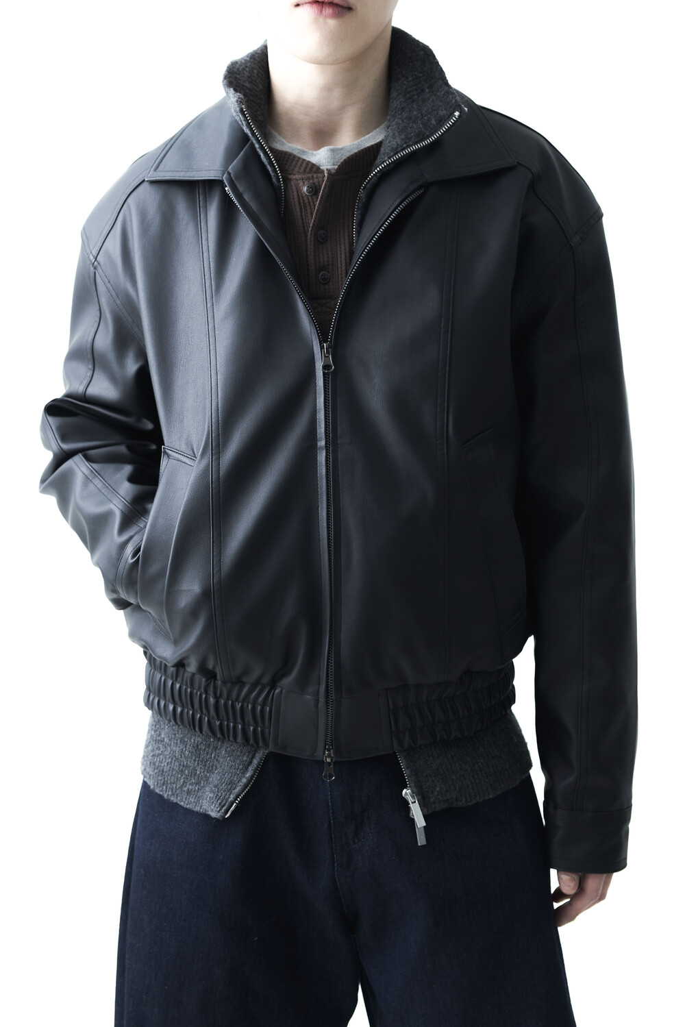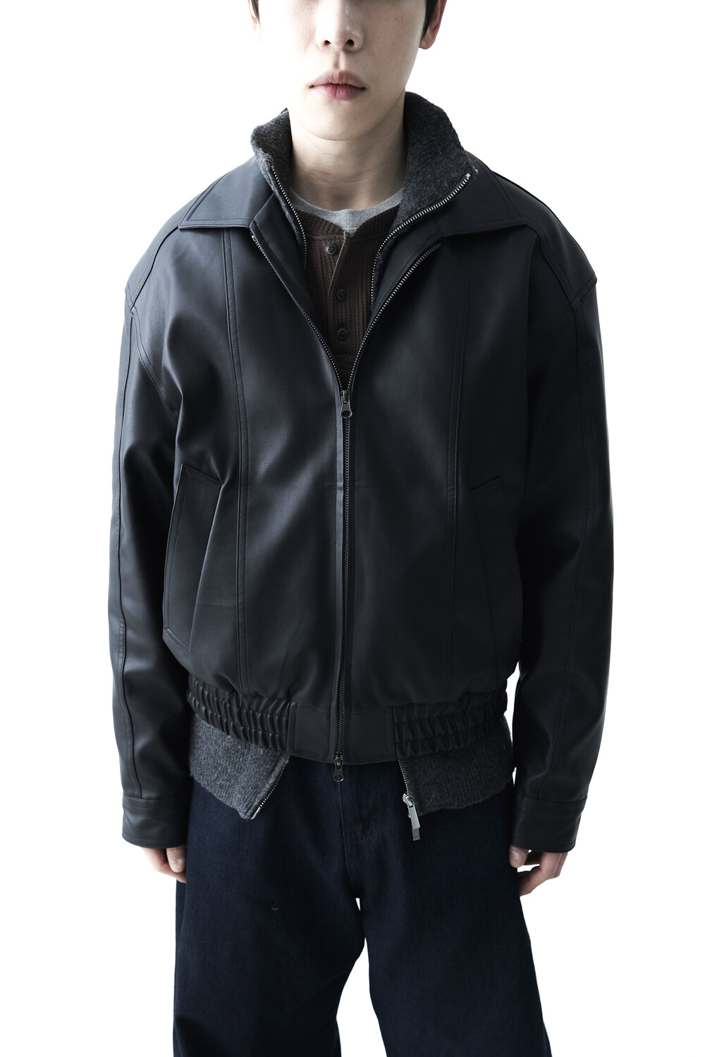 - 유니크한 크랙워싱 패턴이 매력적인 레더 자켓, 클래식에 충실한 라펠과 포켓 라이닝이 적용되었으며, 크롭한 기장감과 함께 볼드한 밴디드 밑단으로 구성되었습니다.