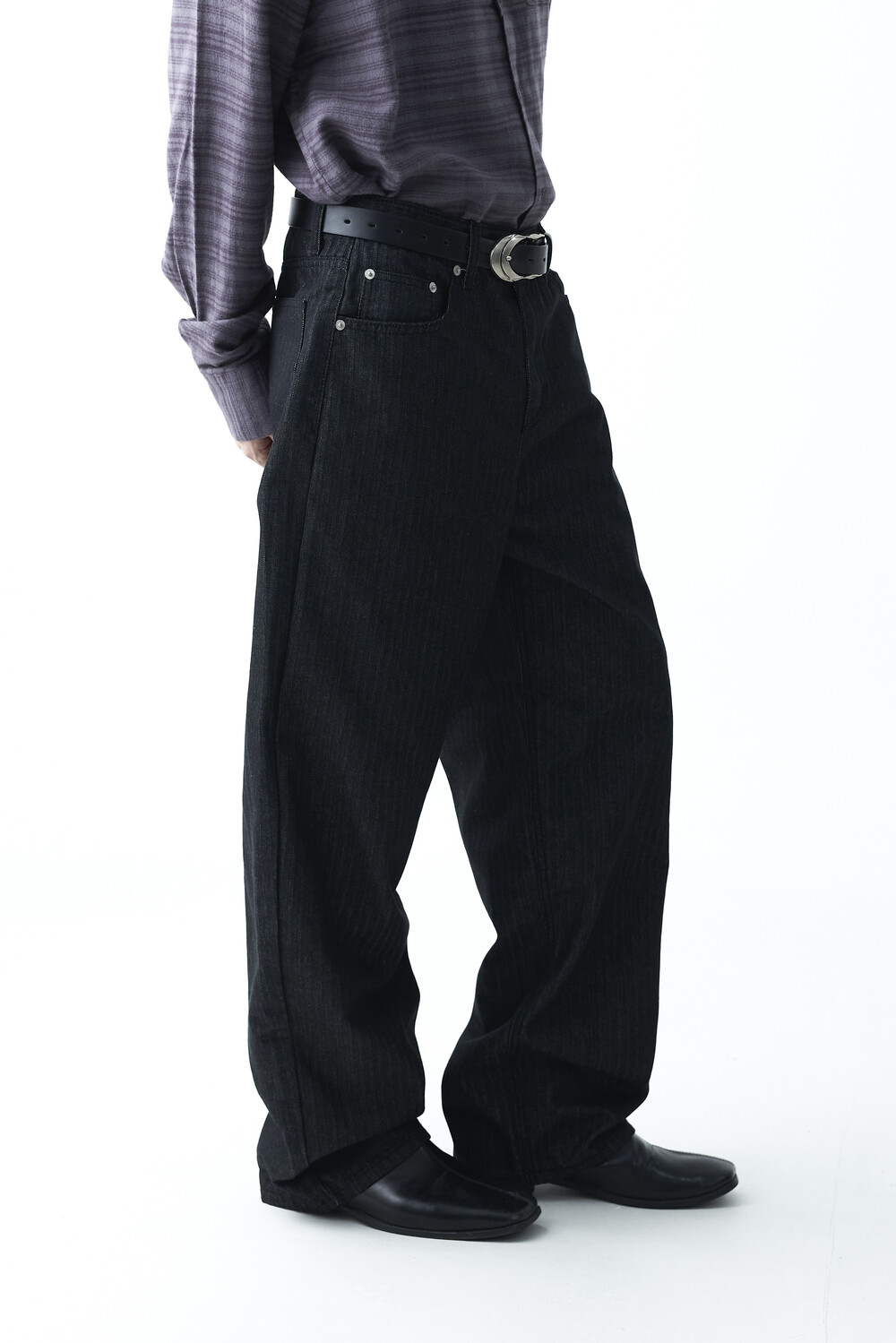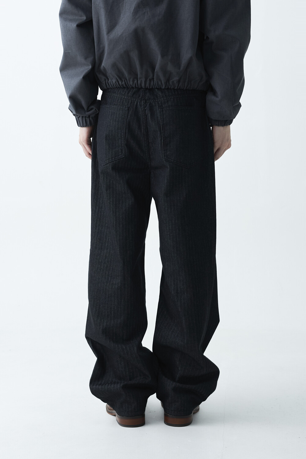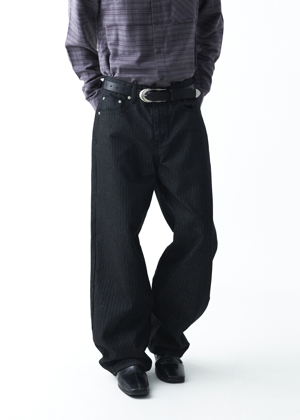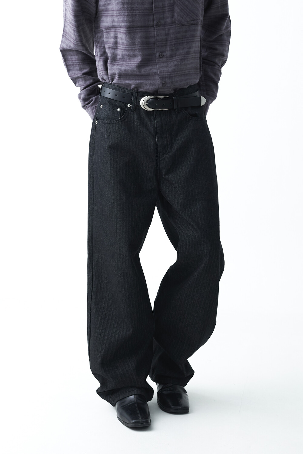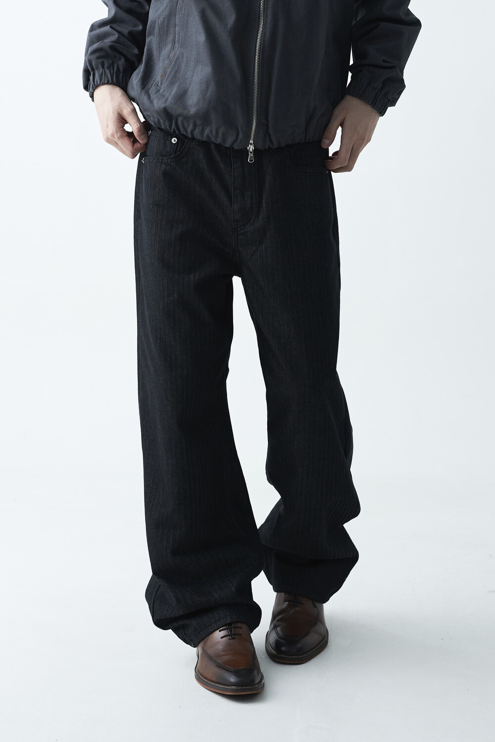 헤링본 패턴의 세로 줄지 텍스쳐 실루엣이 가미된 와이드 데님팬츠 제품으로 이염이 없는 논페이드 팬츠 제품입니다. 안정적인 와이드 핏 실루엣과 탄탄한 착용감으로 다양한 코디에 높은 활용도를 가지는 팬츠 제품입니다.