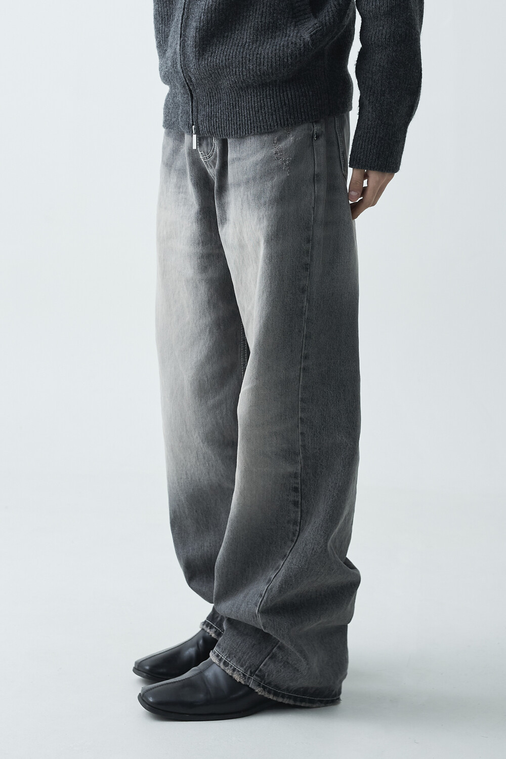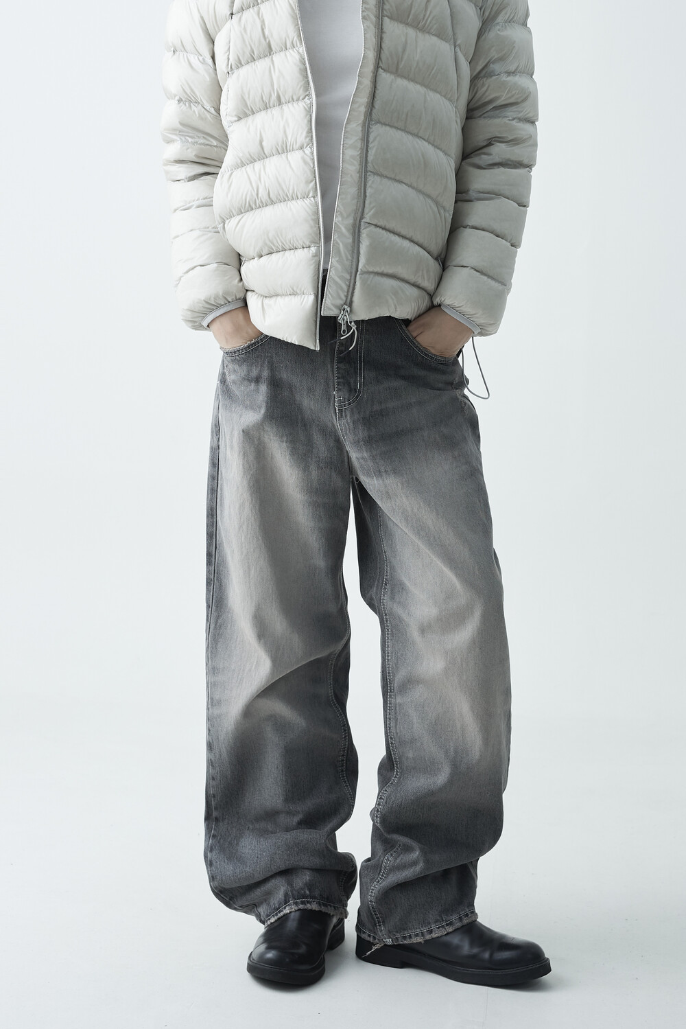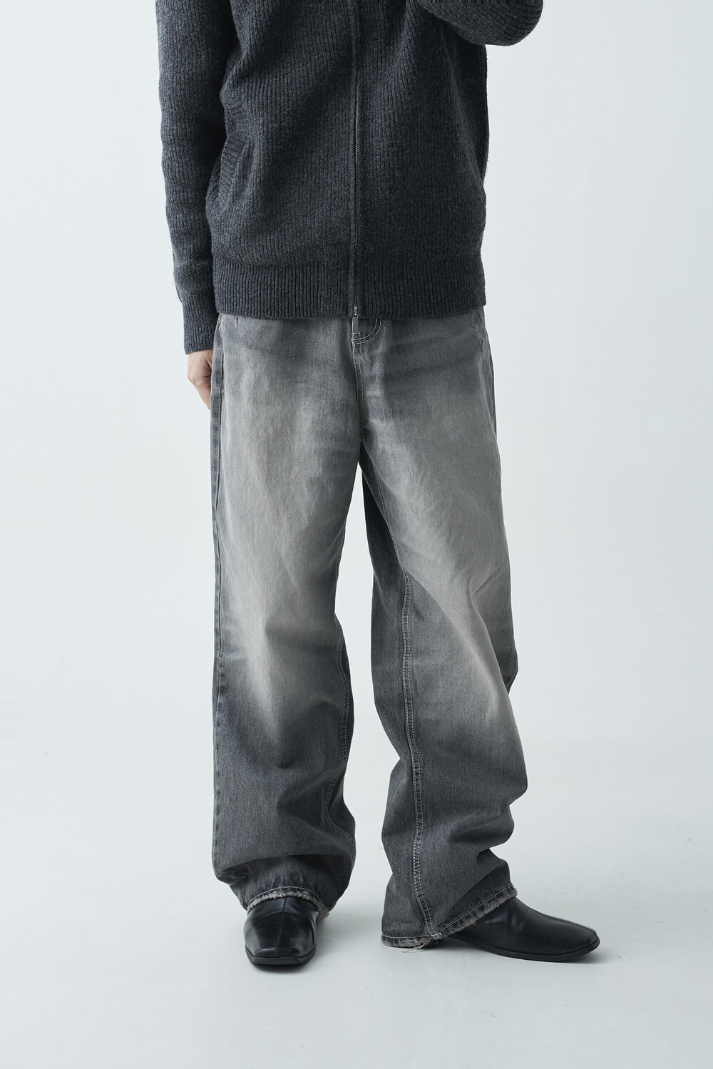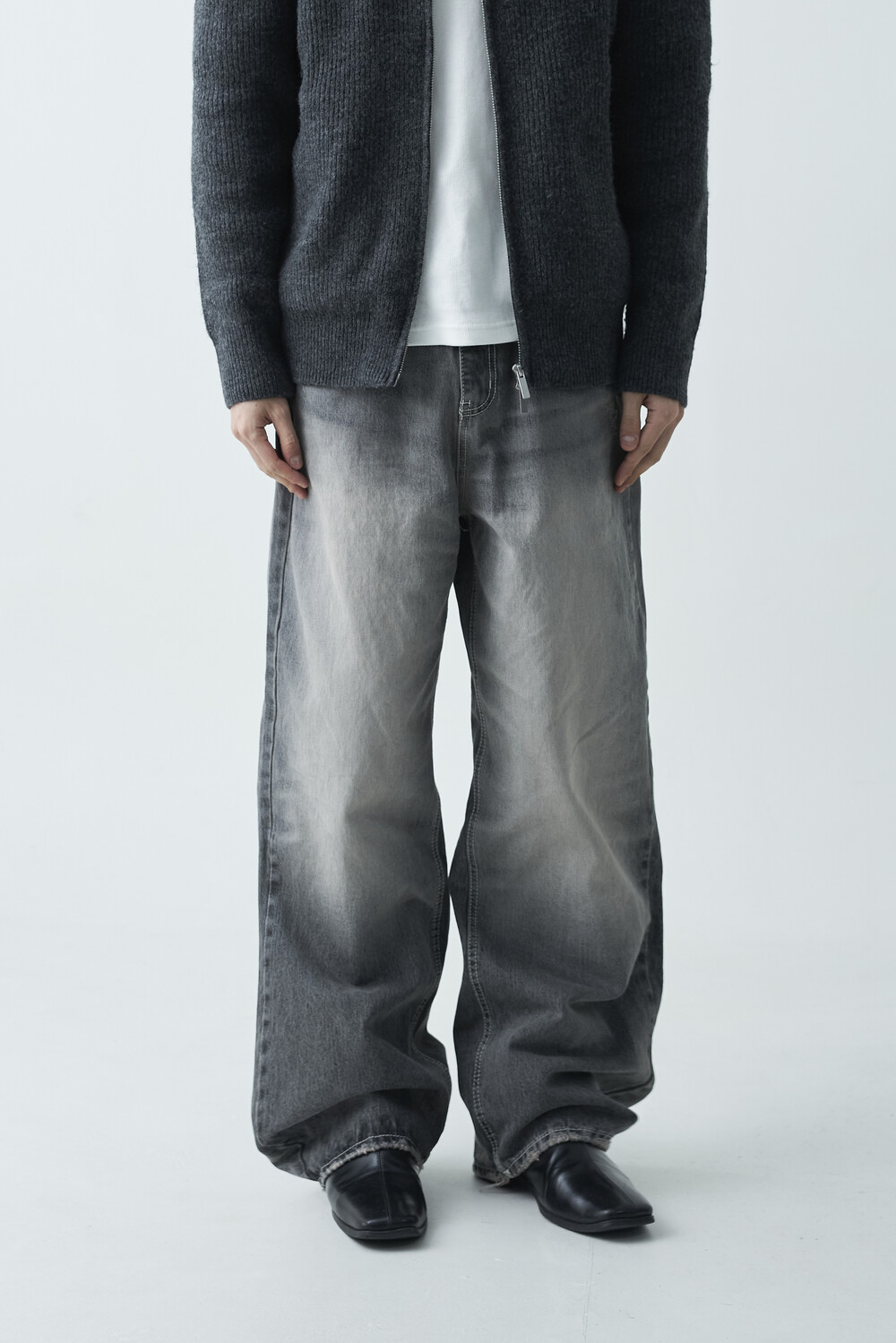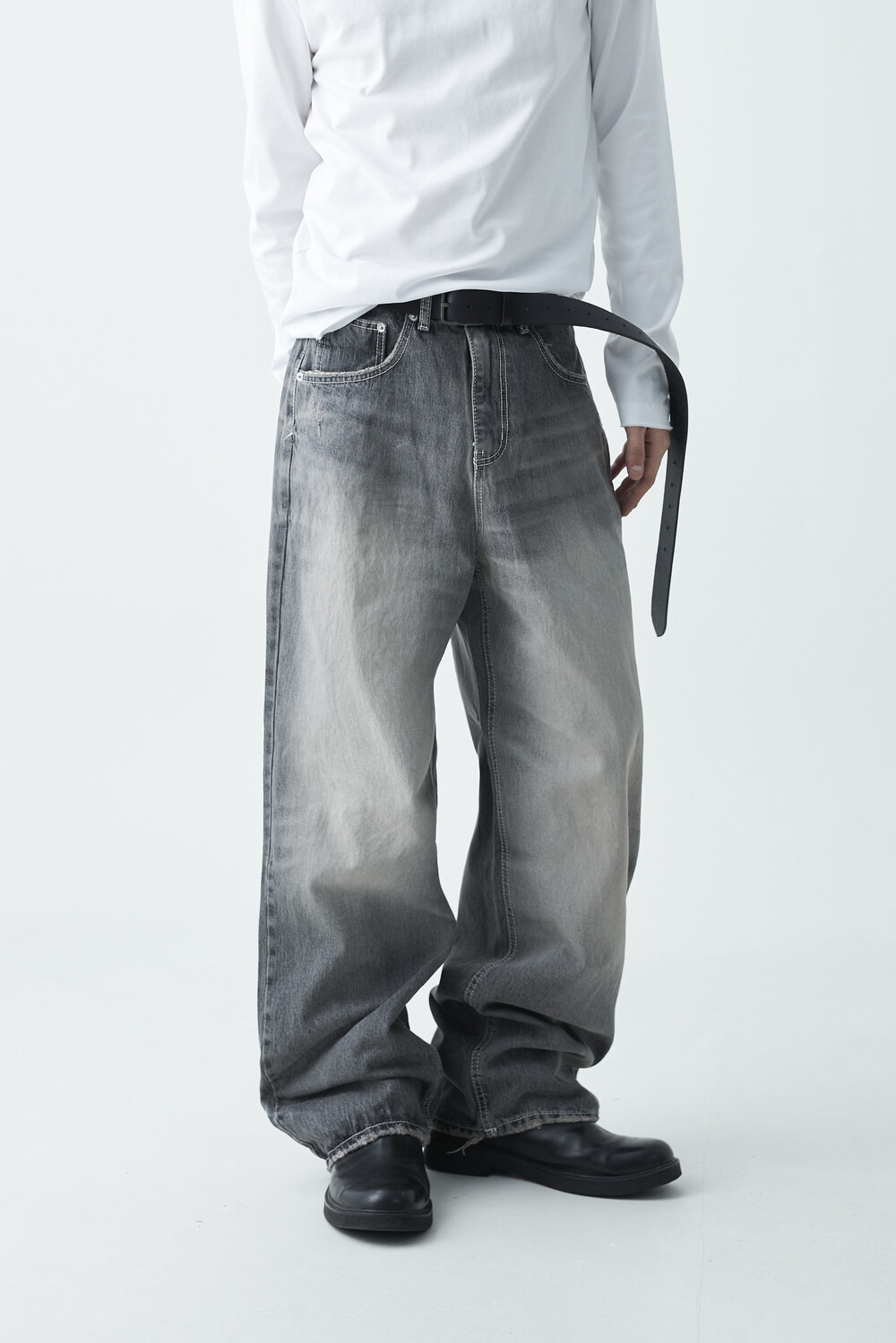 유니크한 그레이청 컬러감의 와이드 데님팬츠 제품으로 각 밑단의 빈티지 데미지 디테일이 적용되어 그 매력을 더합니다. 벌룬핏 보다 오버와이드 핏을 선호하는 분들에게 적극 추천드립니다.