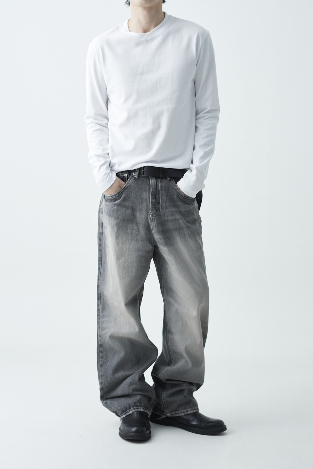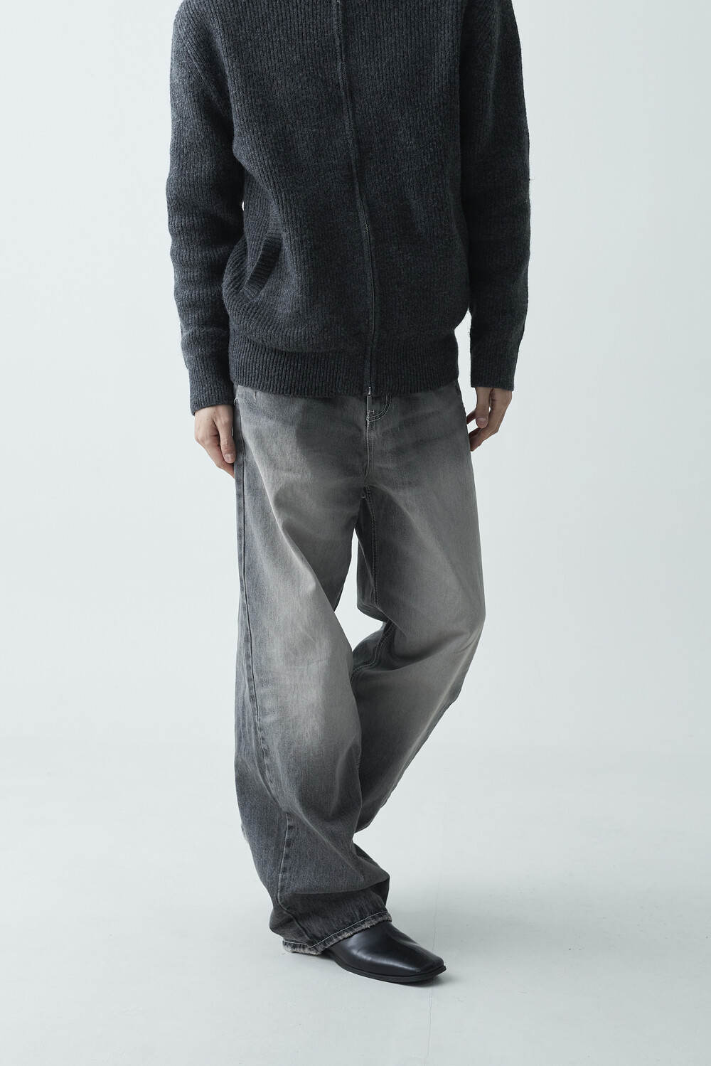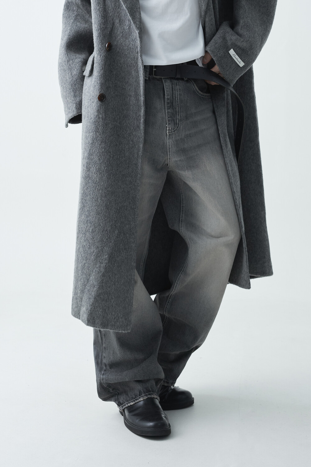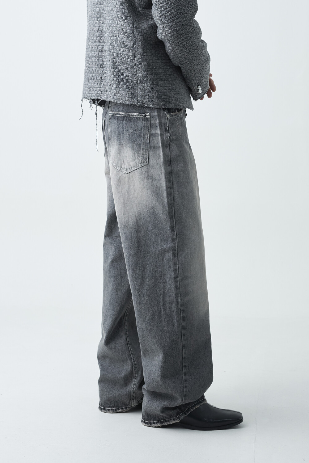 유니크한 그레이청 컬러감의 와이드 데님팬츠 제품으로 각 밑단의 빈티지 데미지 디테일이 적용되어 그 매력을 더합니다. 벌룬핏 보다 오버와이드 핏을 선호하는 분들에게 적극 추천드립니다.