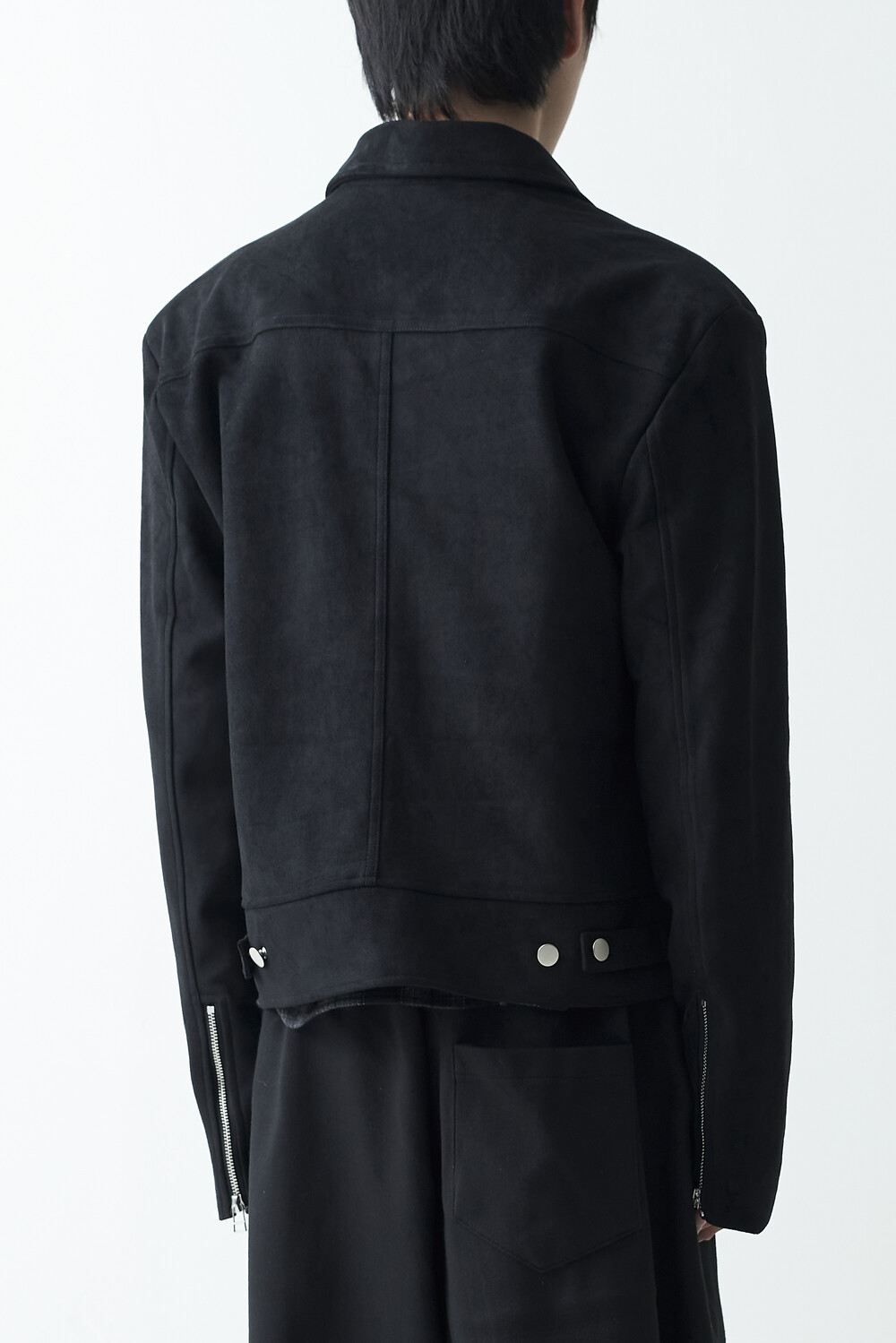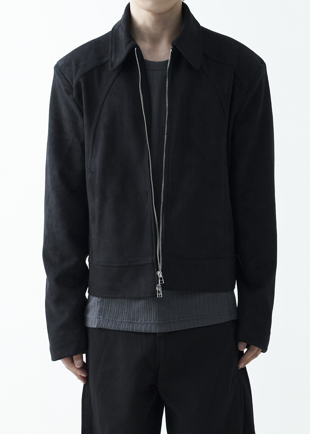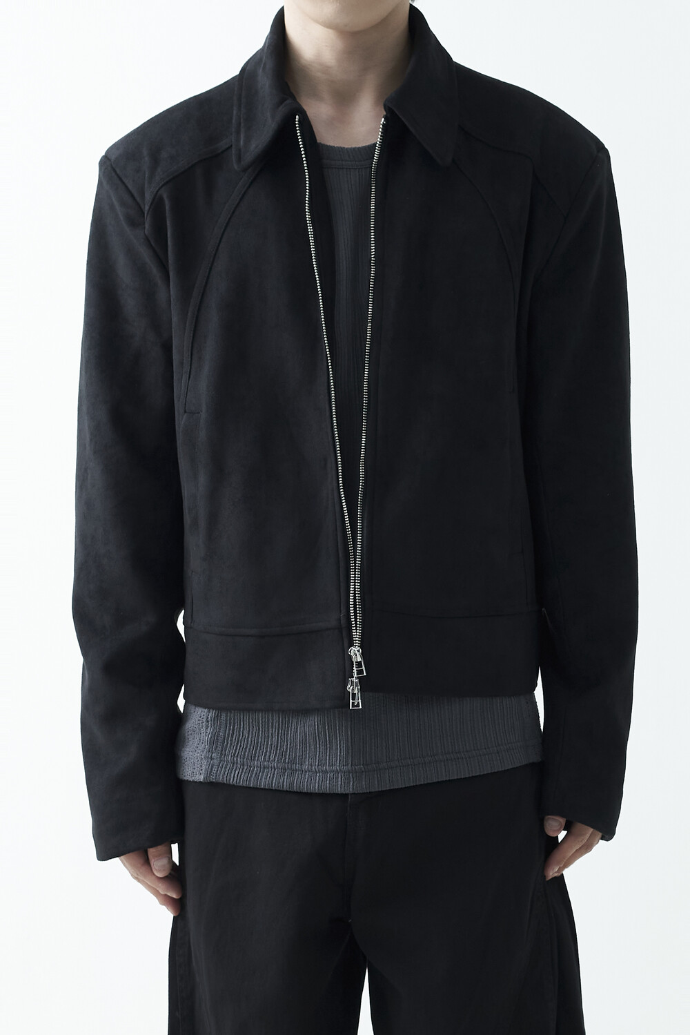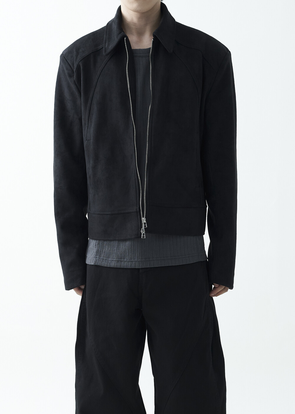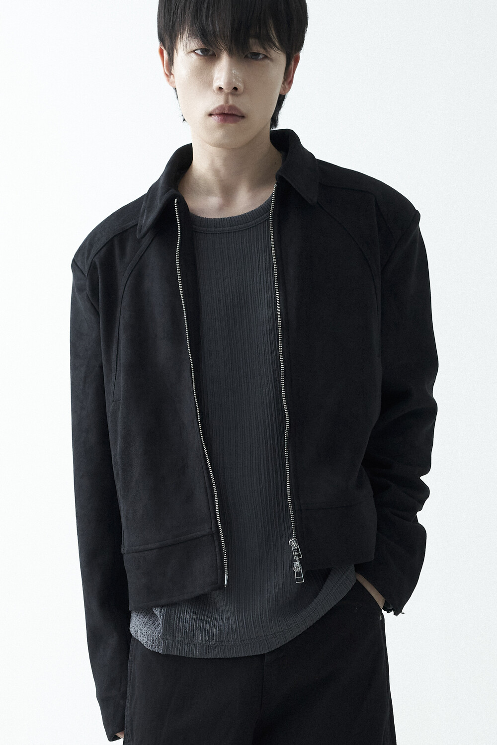 유니크한 스웨이드 소재감으로 구성된 숏-크롭 자켓 제품입니다. 투웨이 지퍼 적용으로 다양한 실루엣 연출이 가능하며, 전면부에 위치한 다트 디테일과 히든 사이드 포켓으로 더욱 미니멀한 무드를 표현합니다.