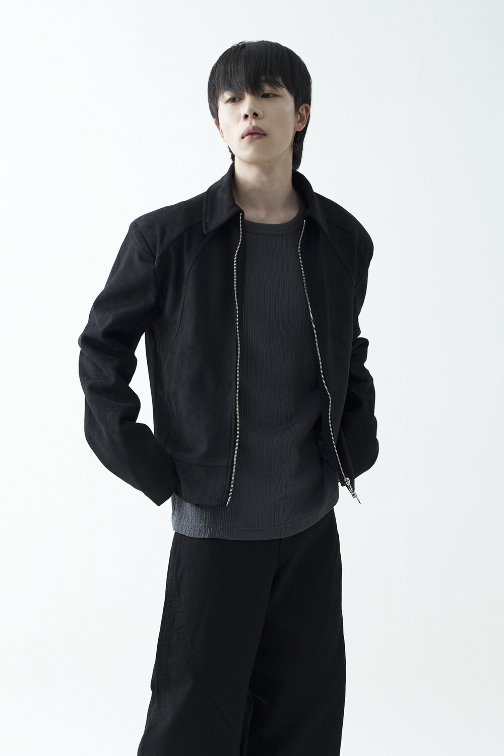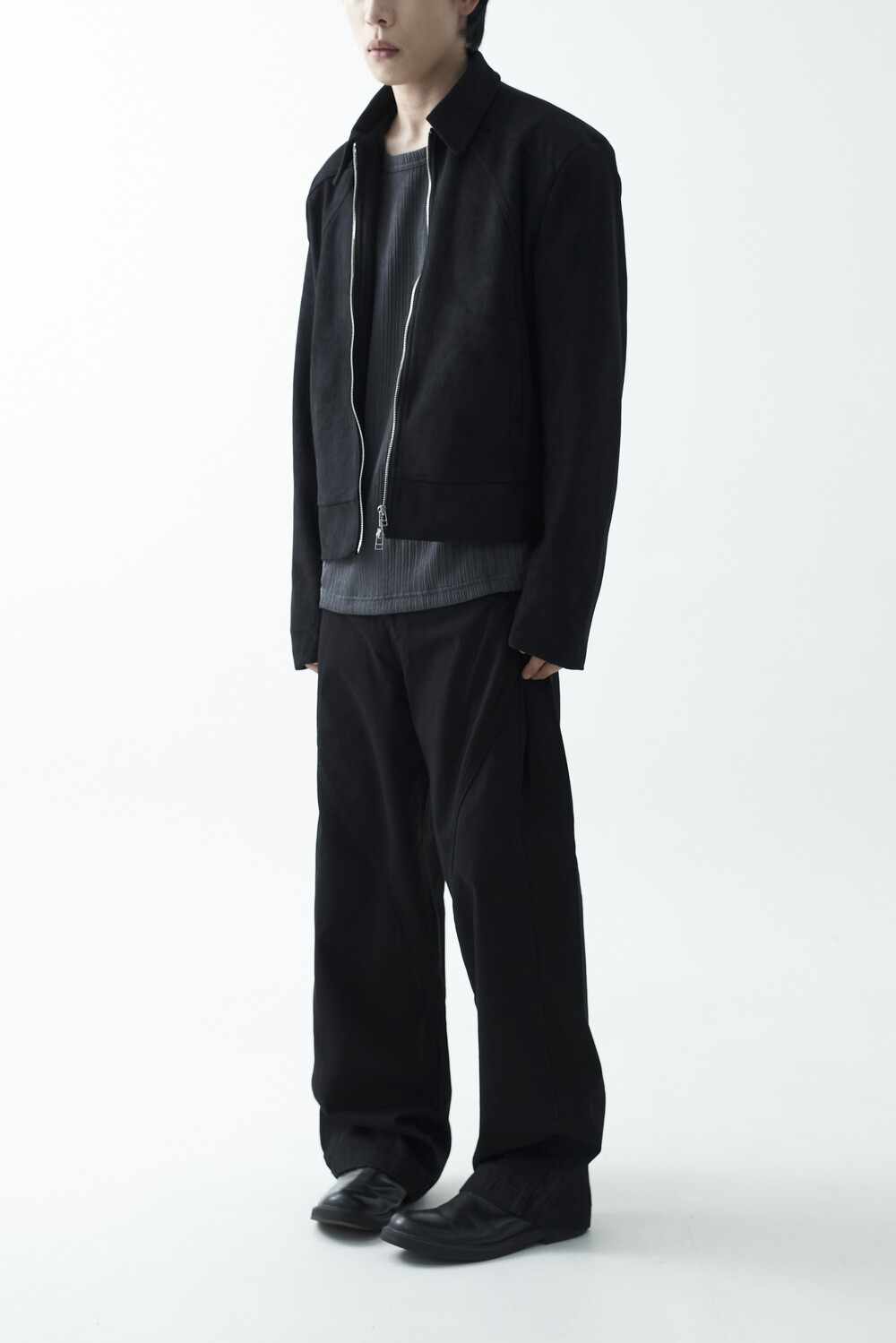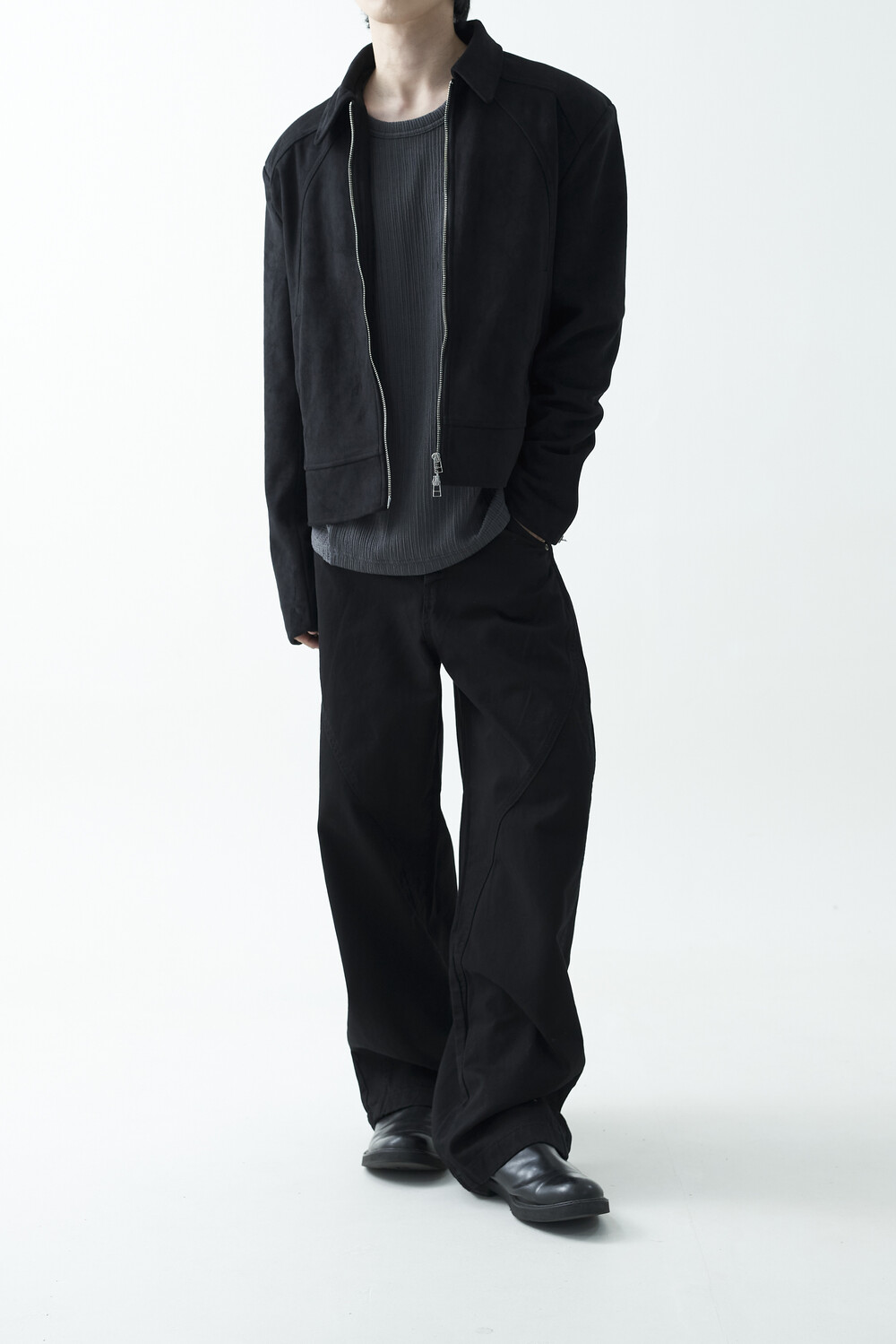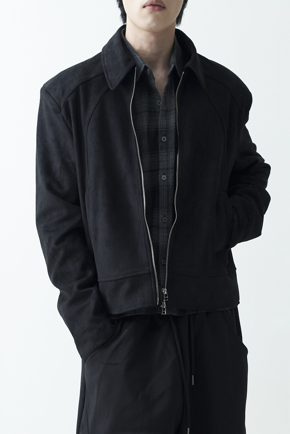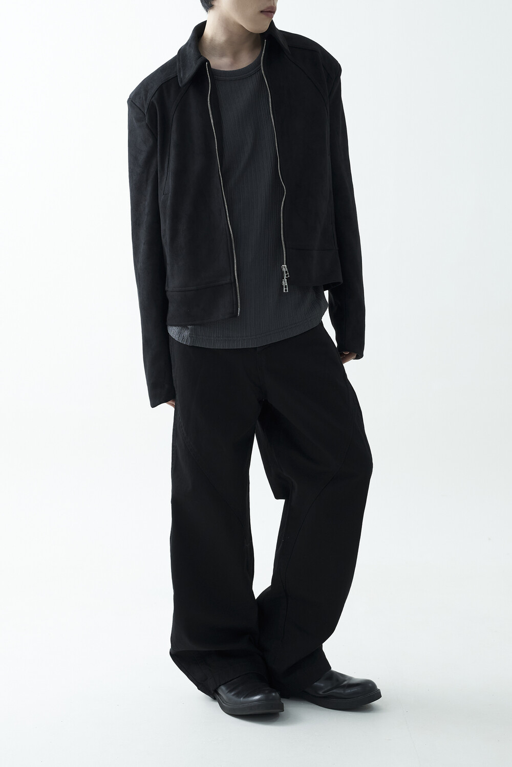 유니크한 스웨이드 소재감으로 구성된 숏-크롭 자켓 제품입니다. 투웨이 지퍼 적용으로 다양한 실루엣 연출이 가능하며, 전면부에 위치한 다트 디테일과 히든 사이드 포켓으로 더욱 미니멀한 무드를 표현합니다.