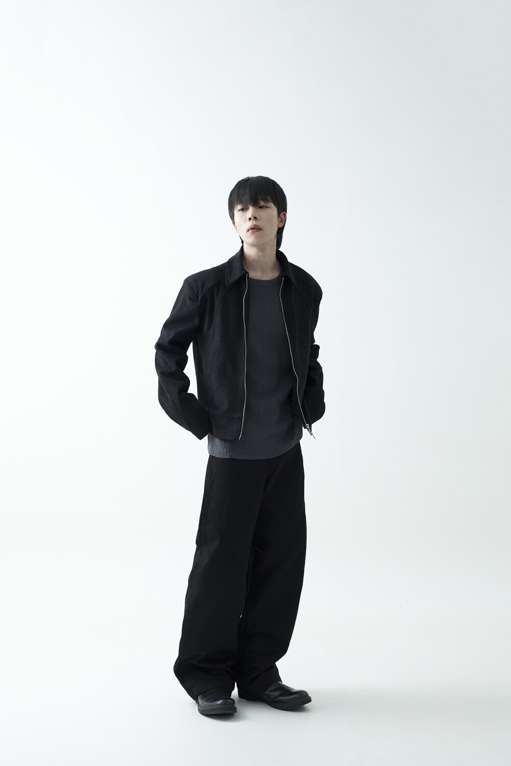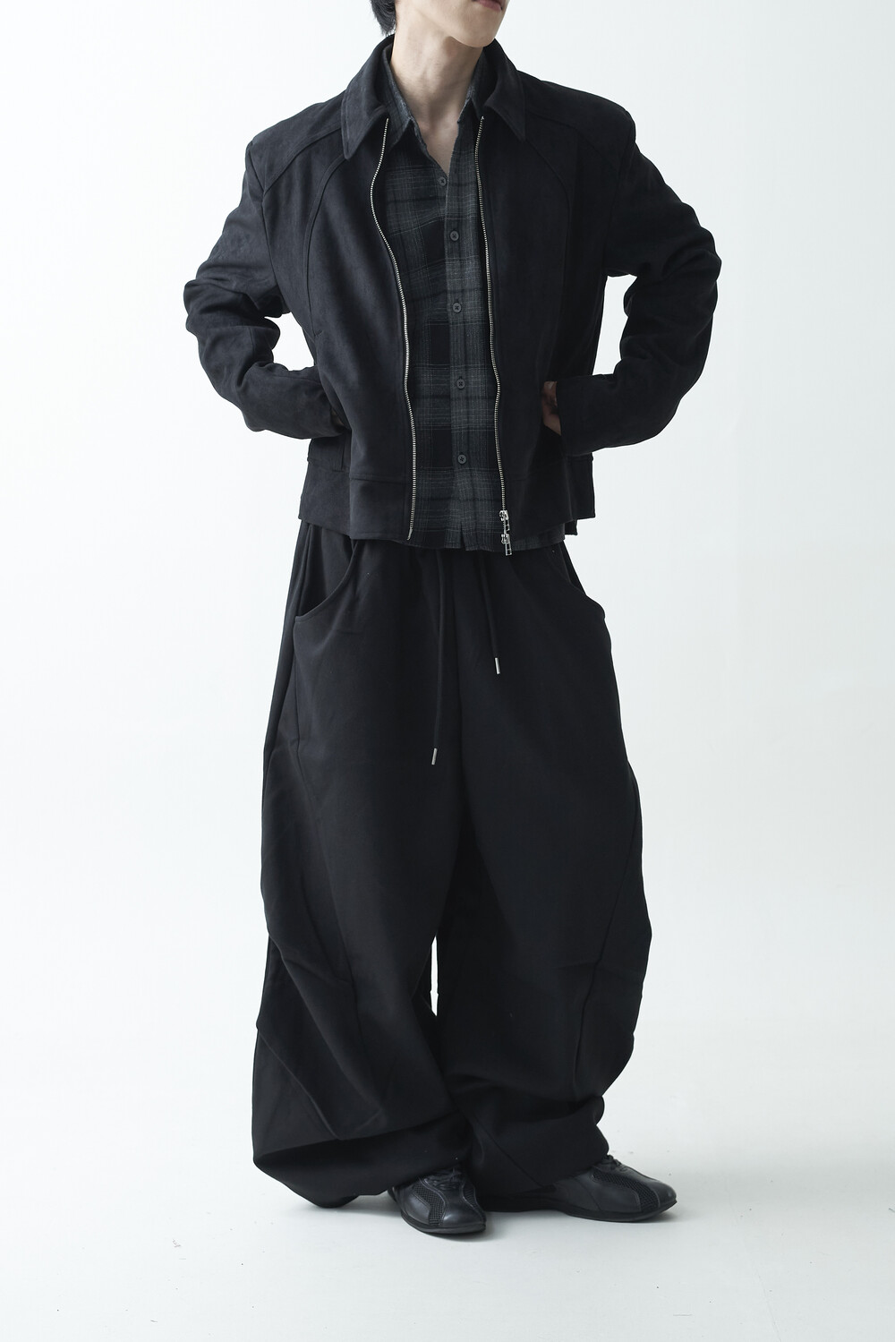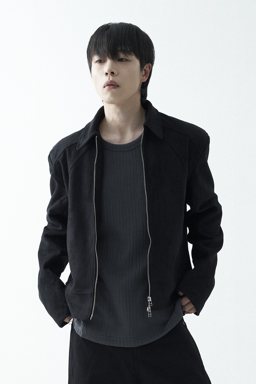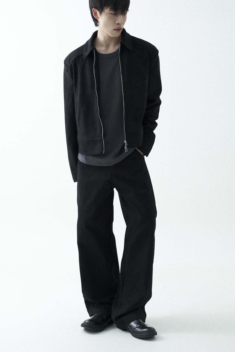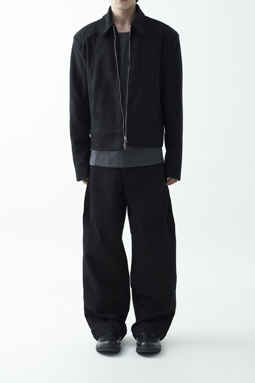 유니크한 스웨이드 소재감으로 구성된 숏-크롭 자켓 제품입니다. 투웨이 지퍼 적용으로 다양한 실루엣 연출이 가능하며, 전면부에 위치한 다트 디테일과 히든 사이드 포켓으로 더욱 미니멀한 무드를 표현합니다.