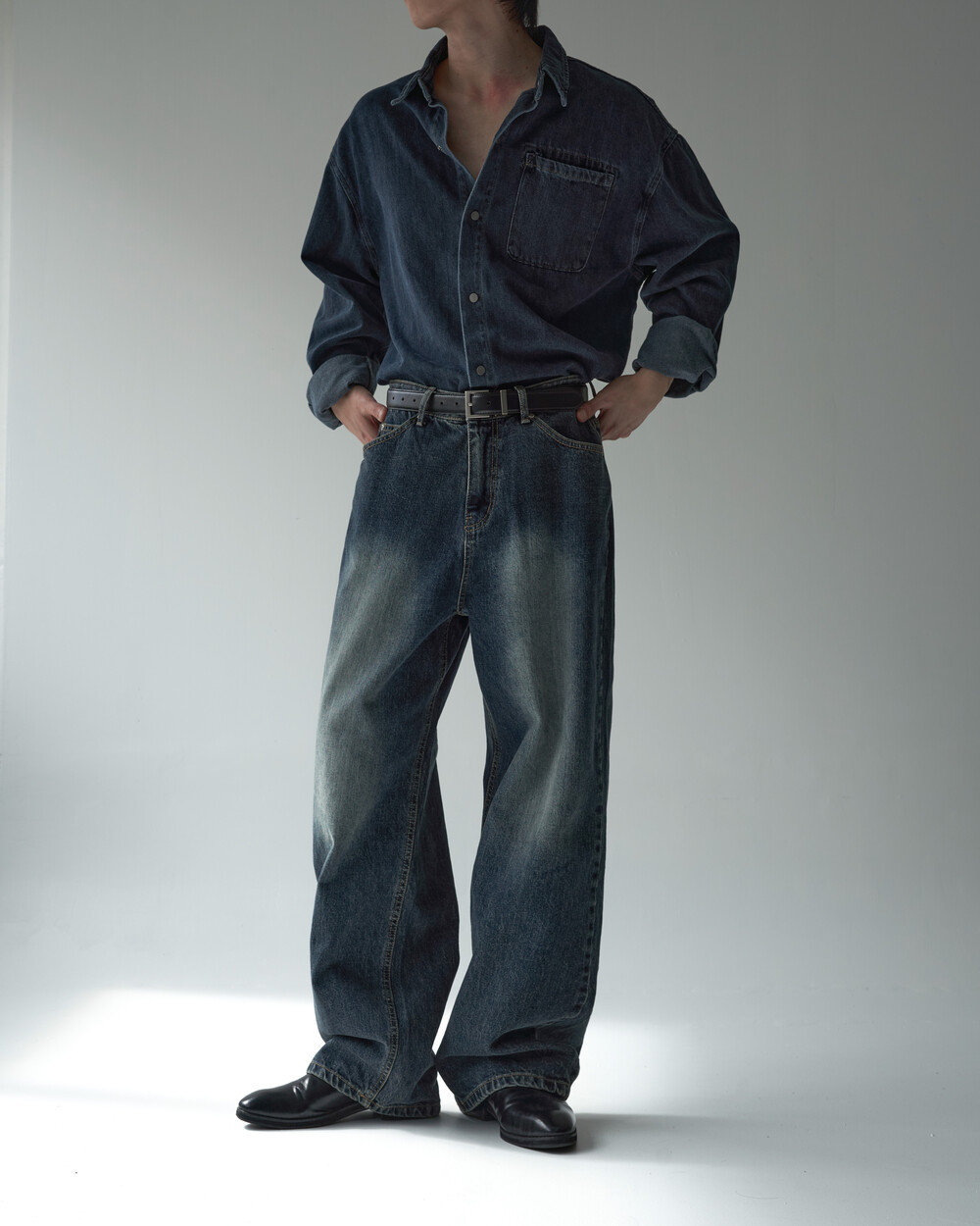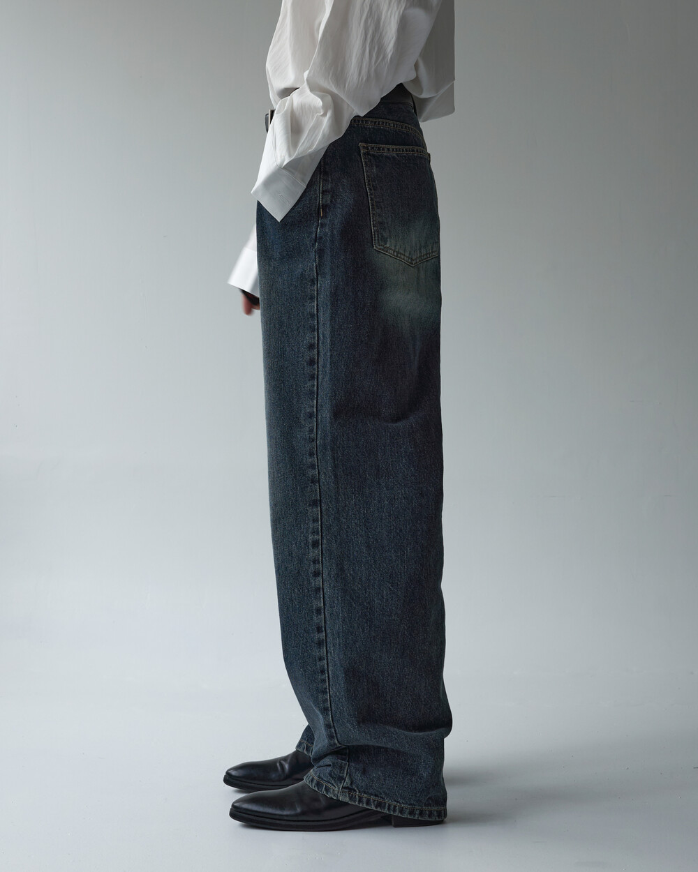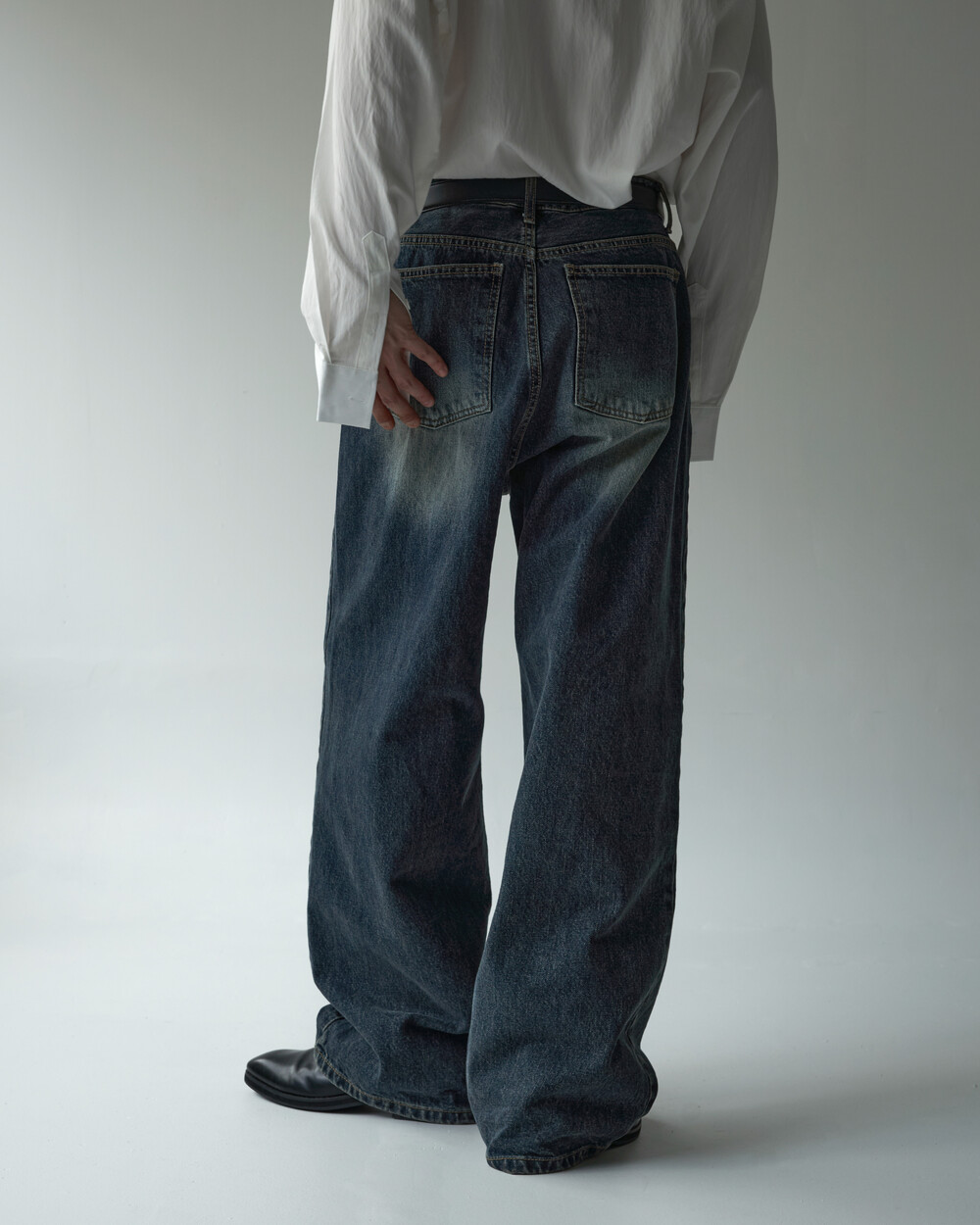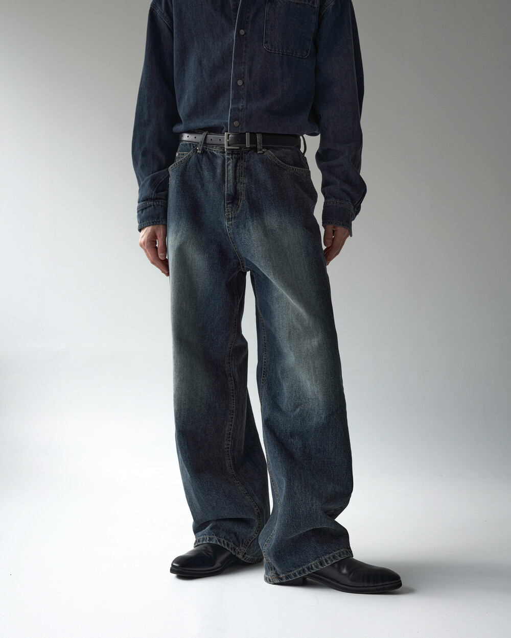 블루컬러감을 베이스로 브러쉬 워싱처리가 가미된 와이드 데님팬츠 제품