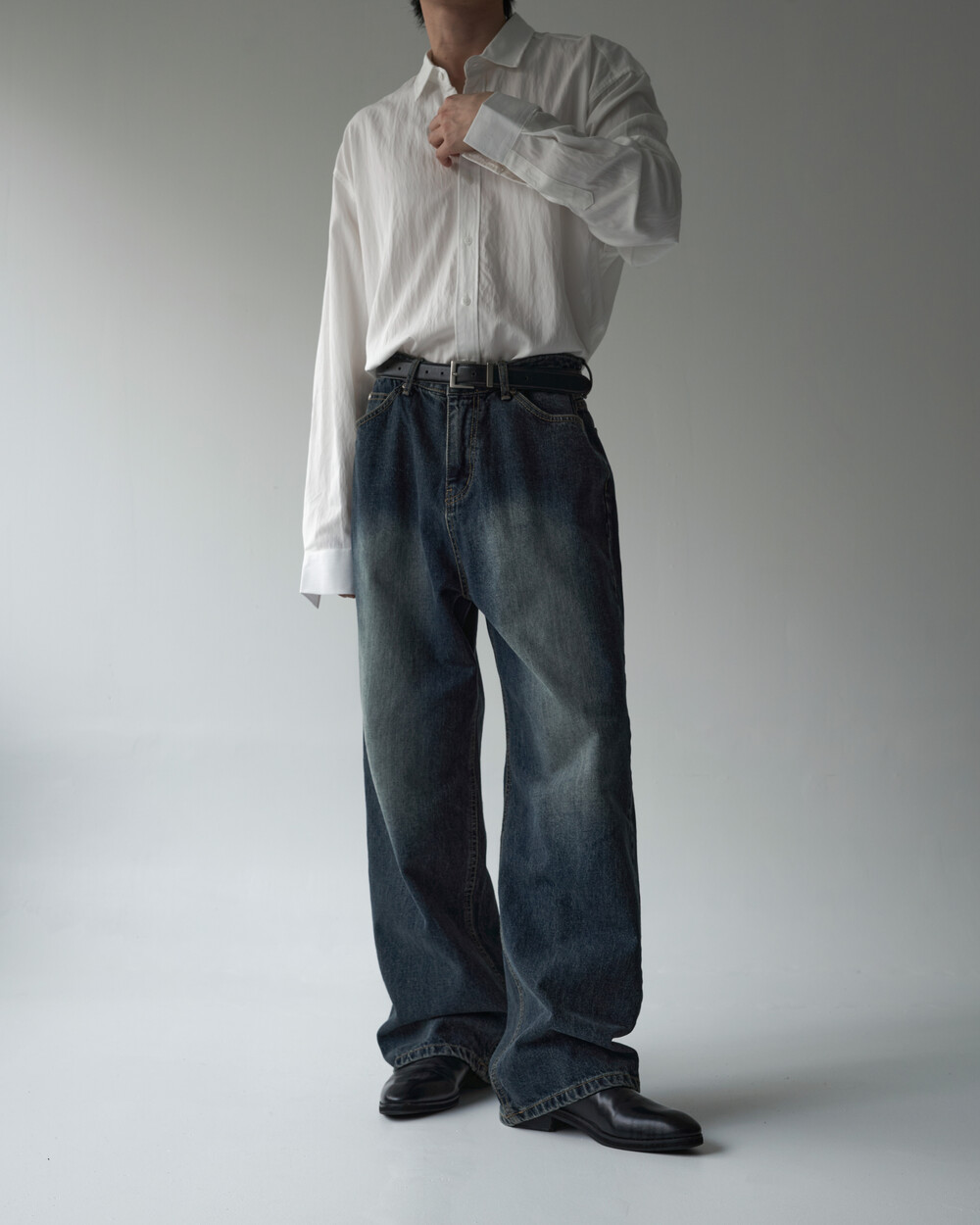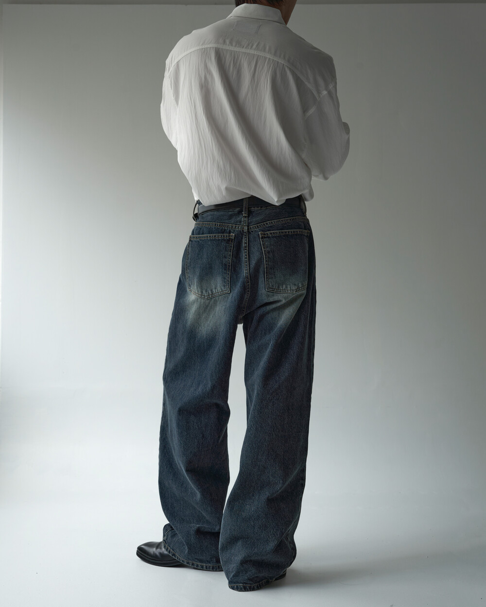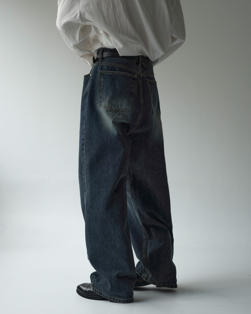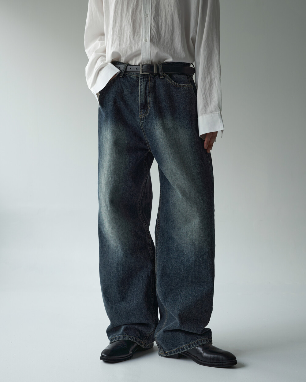 블루컬러감을 베이스로 브러쉬 워싱처리가 가미된 와이드 데님팬츠 제품