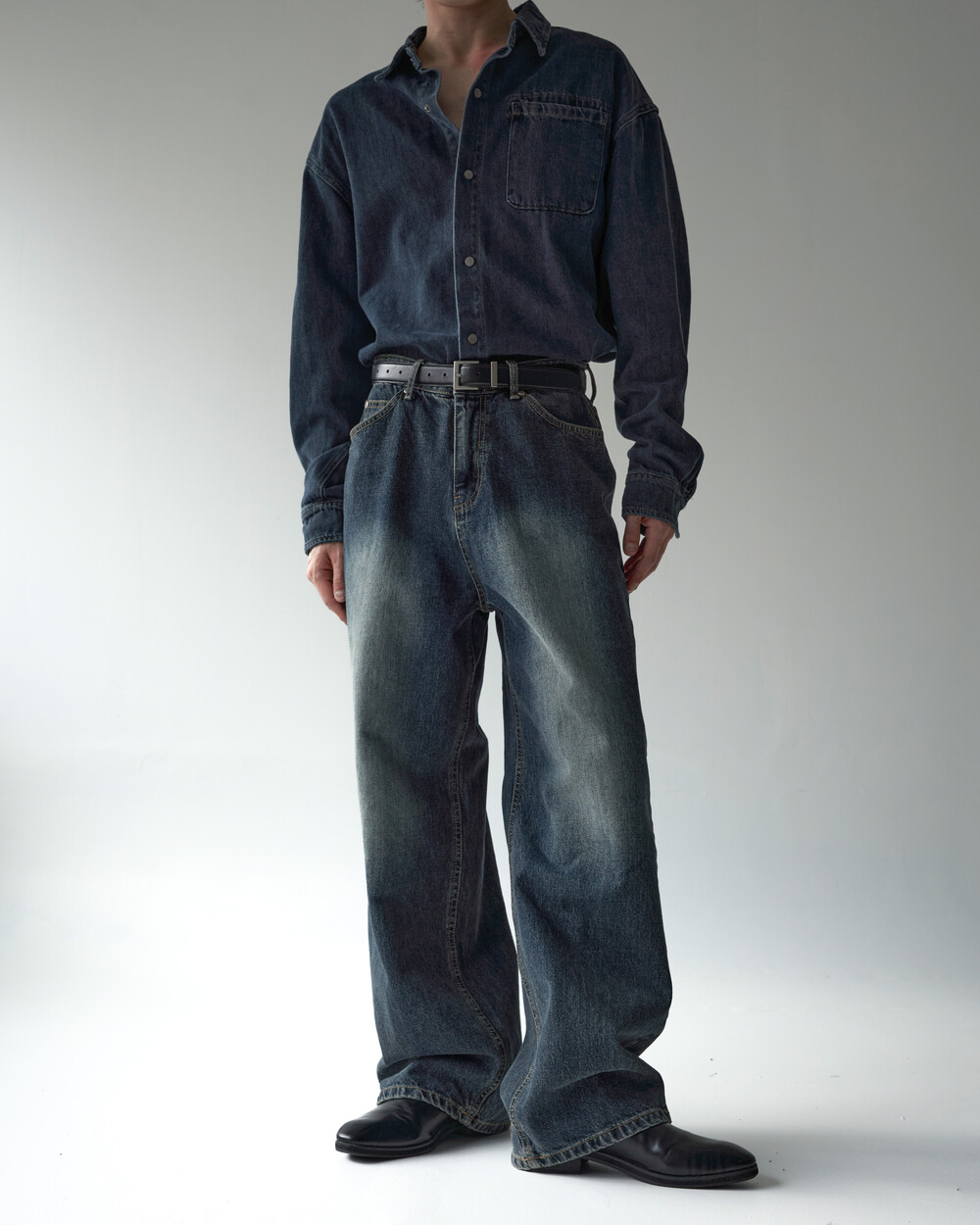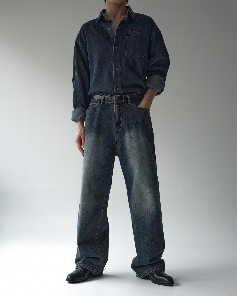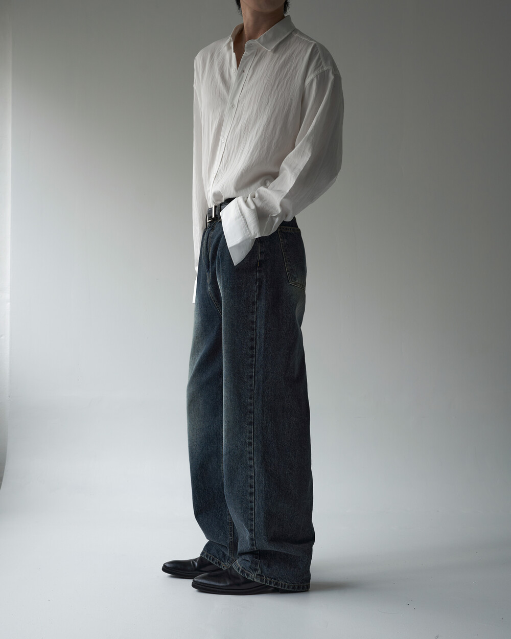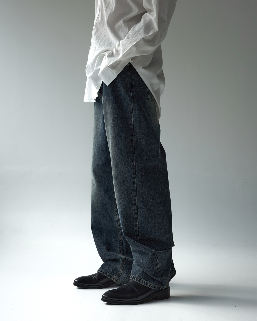 블루컬러감을 베이스로 브러쉬 워싱처리가 가미된 와이드 데님팬츠 제품