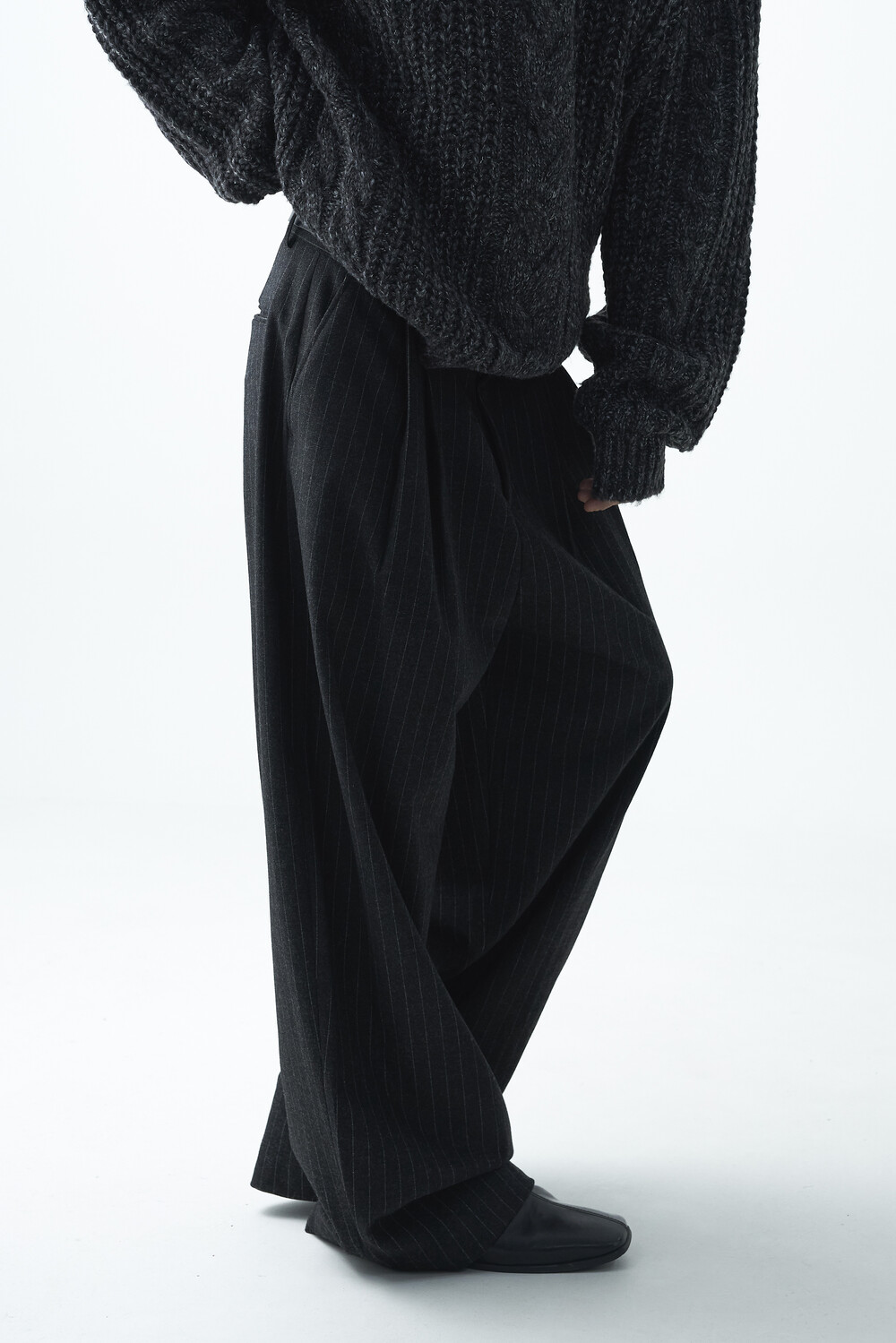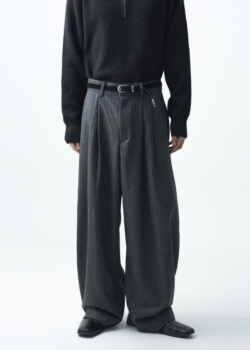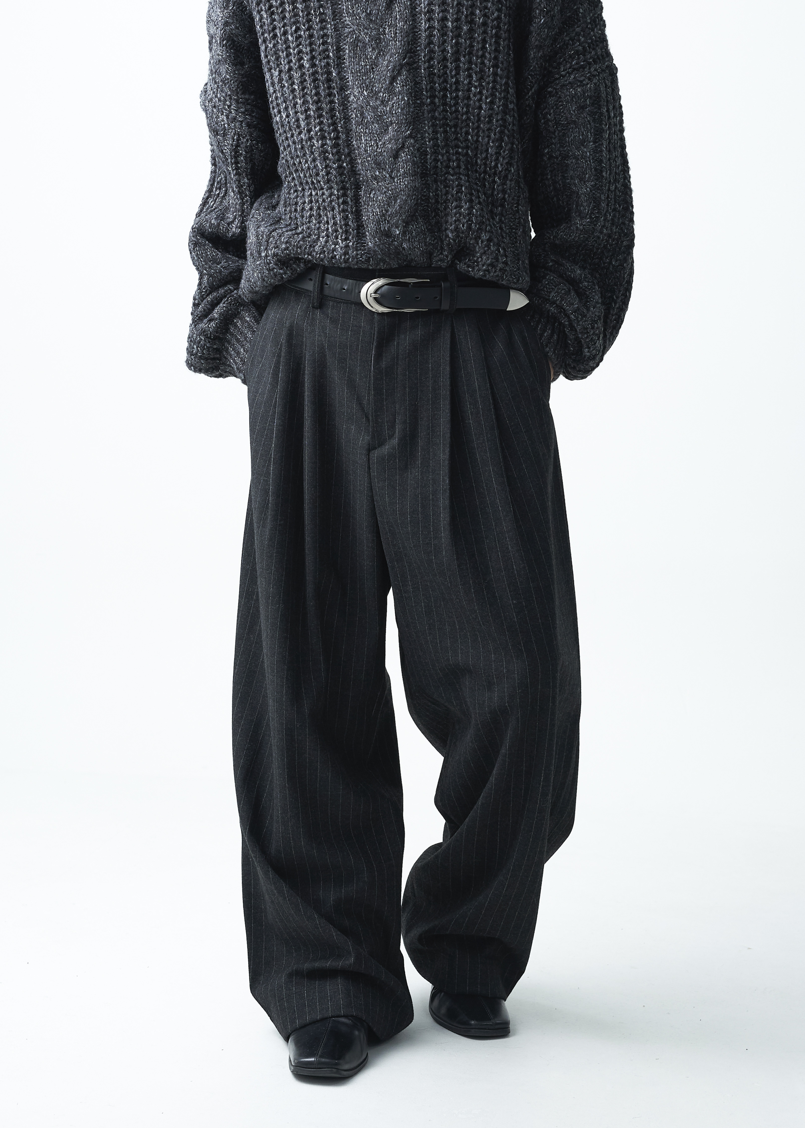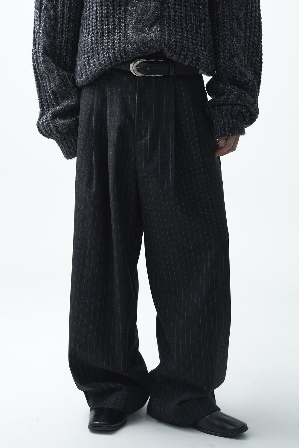 - 스트라이프 패턴과 2핀턱 디테일이 적용된 오버와이드 울 슬렉스 제품입니다.