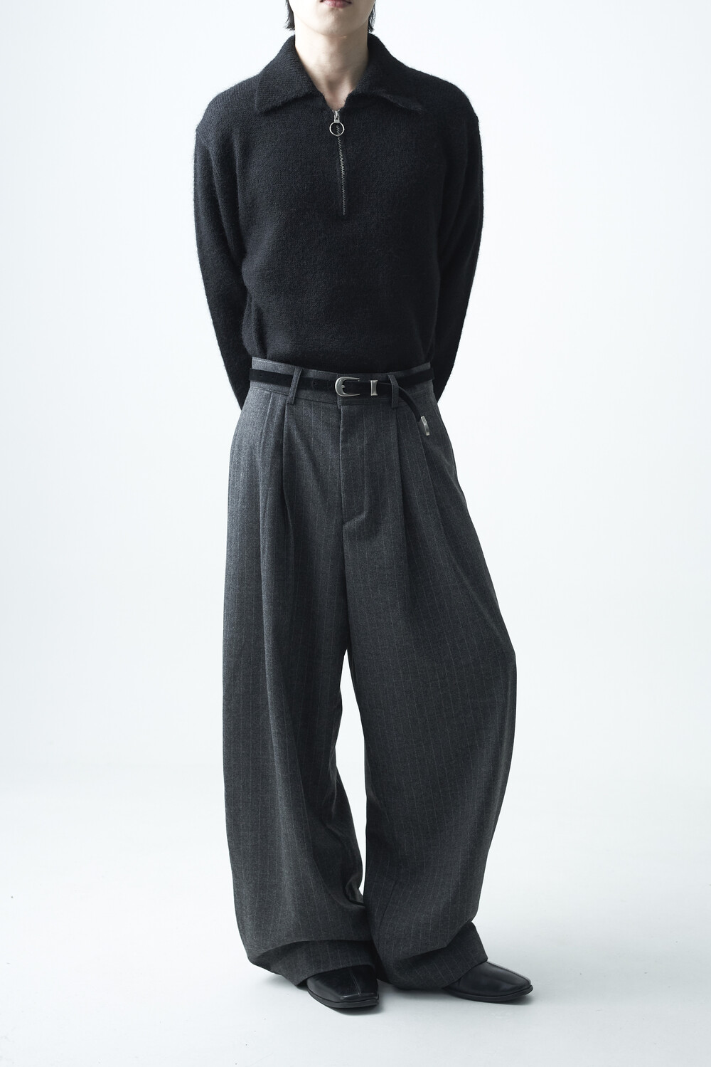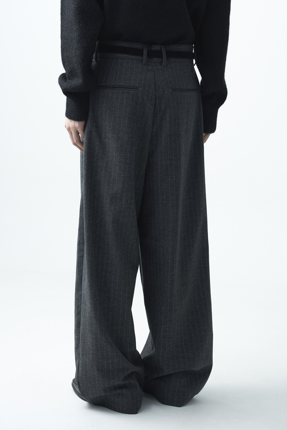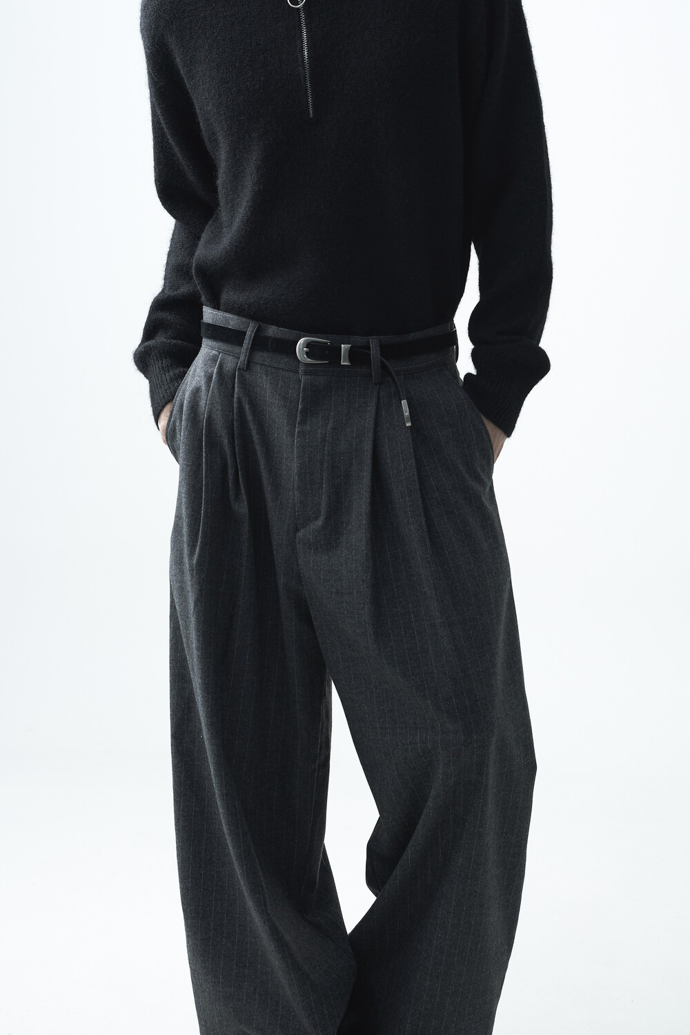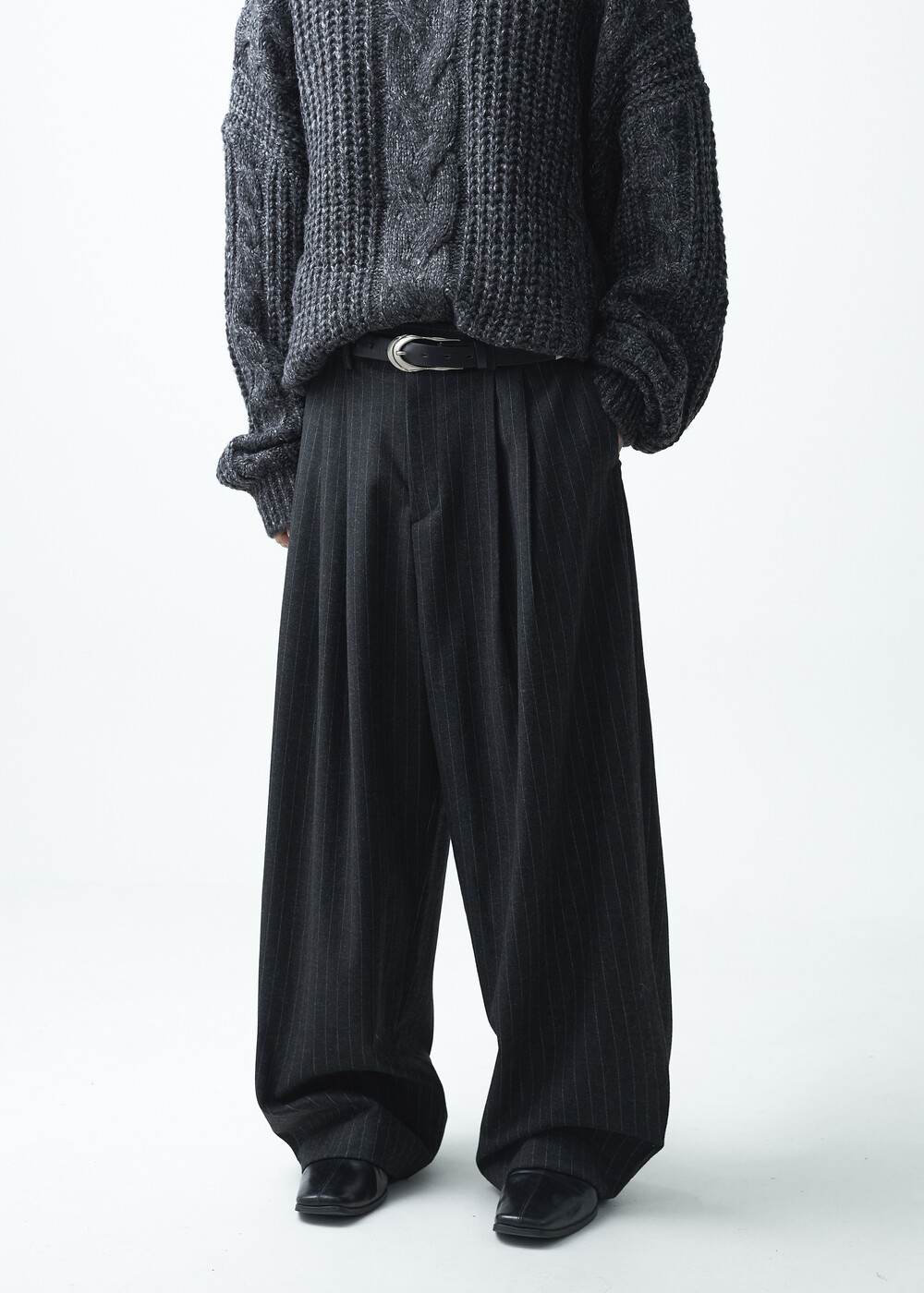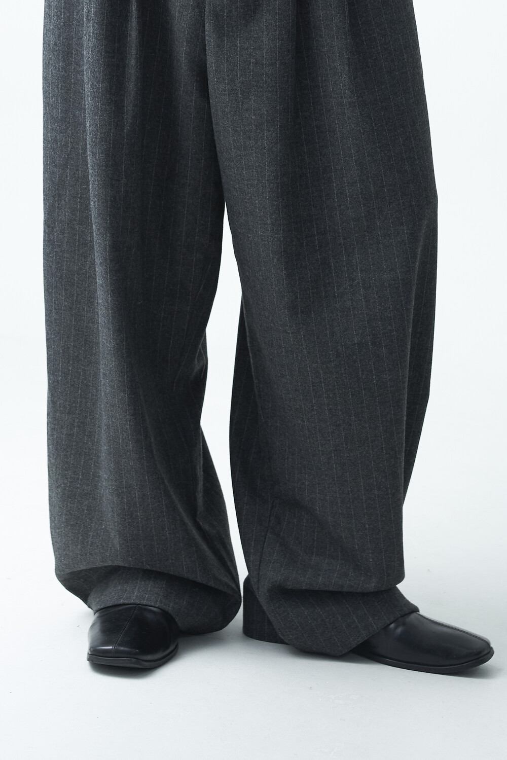 - 스트라이프 패턴과 2핀턱 디테일이 적용된 오버와이드 울 슬렉스 제품입니다.