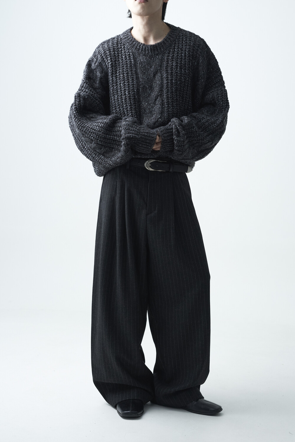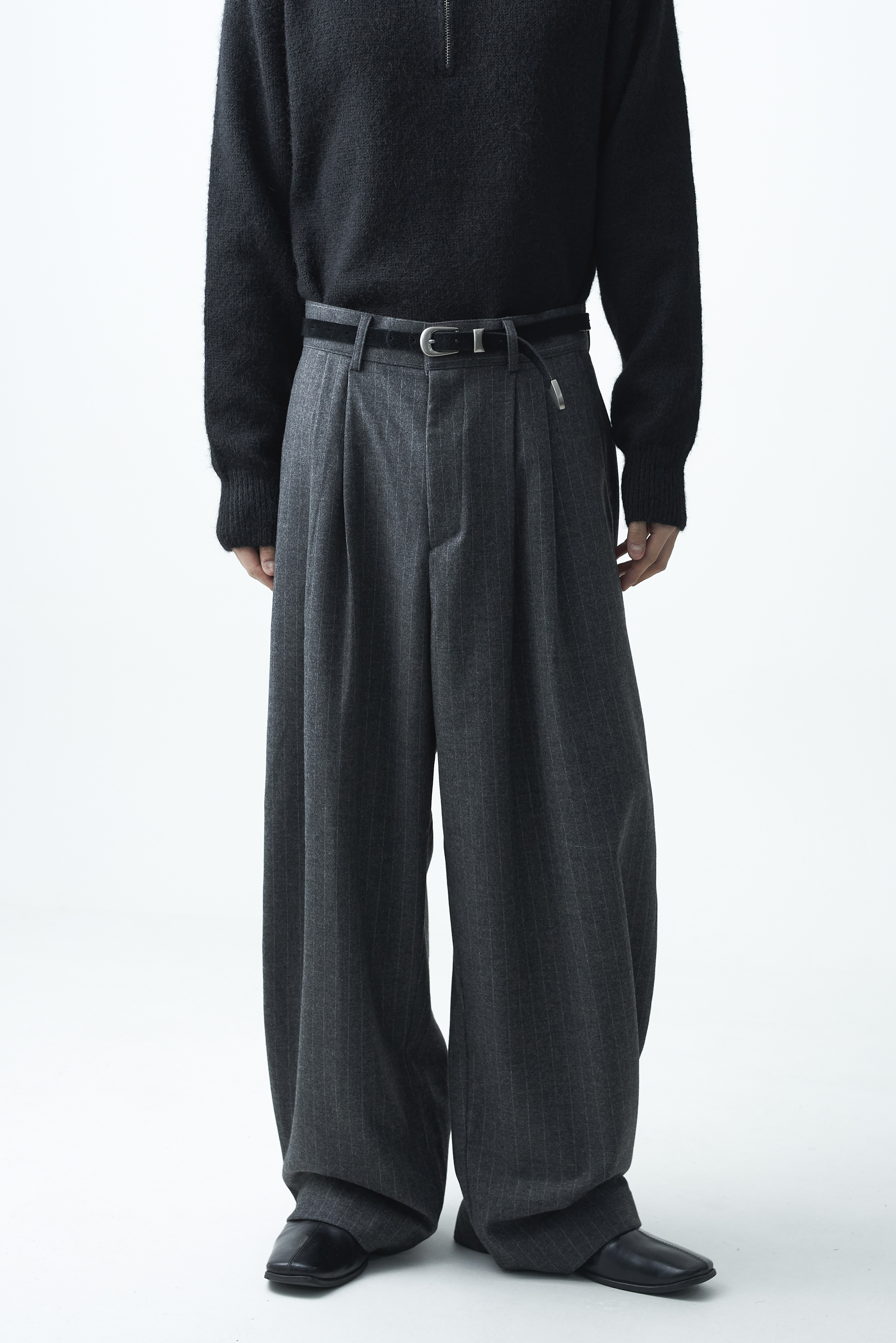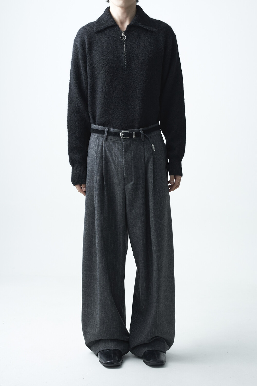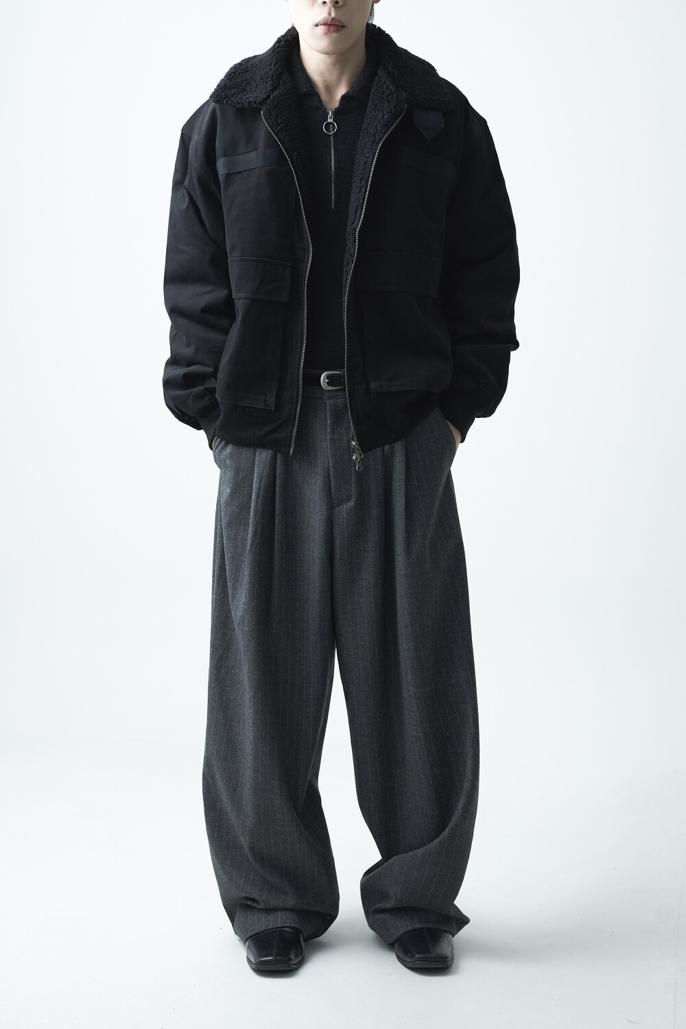 - 스트라이프 패턴과 2핀턱 디테일이 적용된 오버와이드 울 슬렉스 제품입니다.