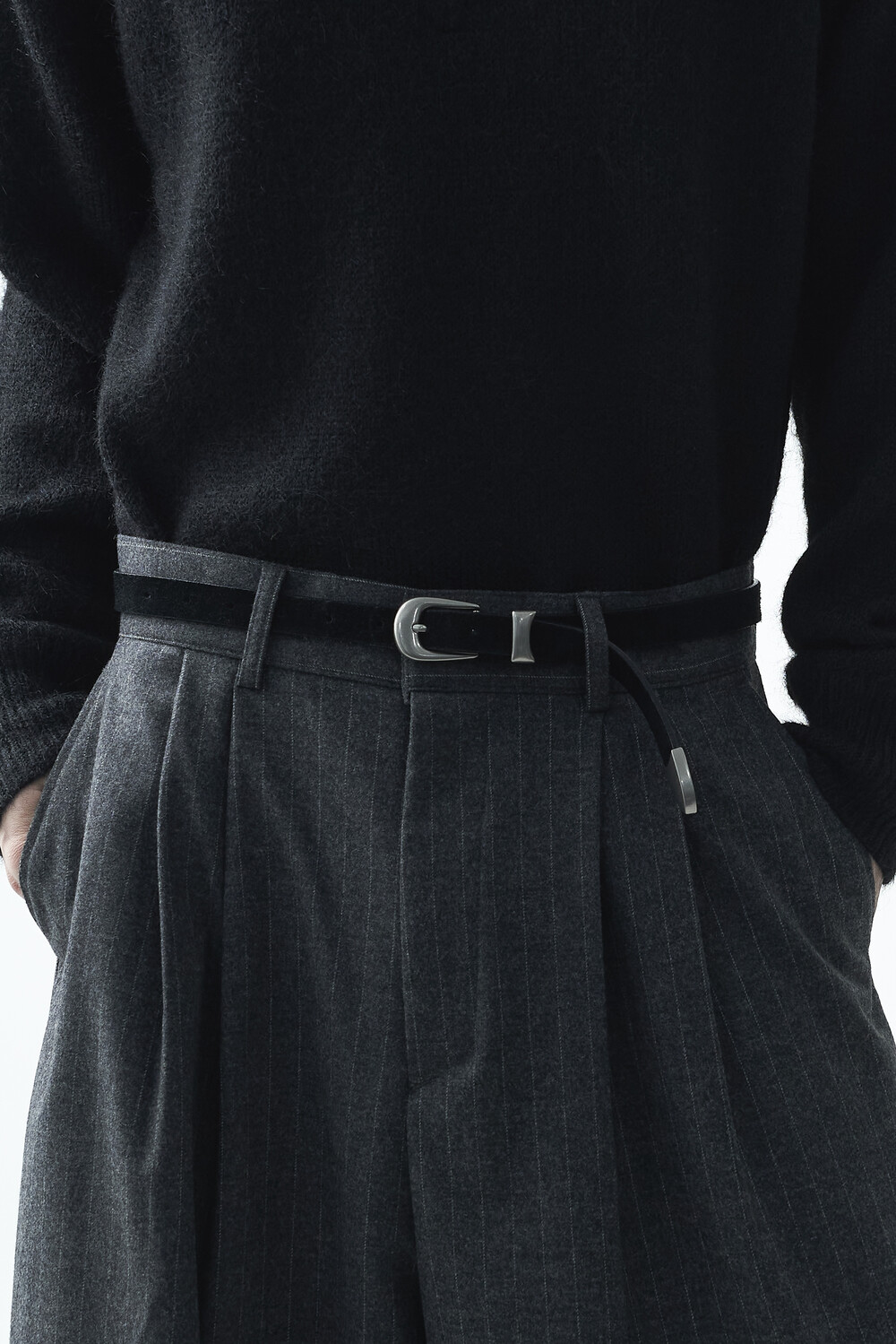 울/모직 소재가 가장 매력적으로 표현된 슬렉스로서 차분한 컬러감으로 다양한 제품군들과 높은 코디력을 갖춘 제품으로 25FW시즌 모두 착용하기 좋은 두께감으로 구성되었으며,울 소재감의 중량감을 통해 무게감이 느껴지는 찰랑거리는 실루엣과 와이드 핏을 구현합니다.
