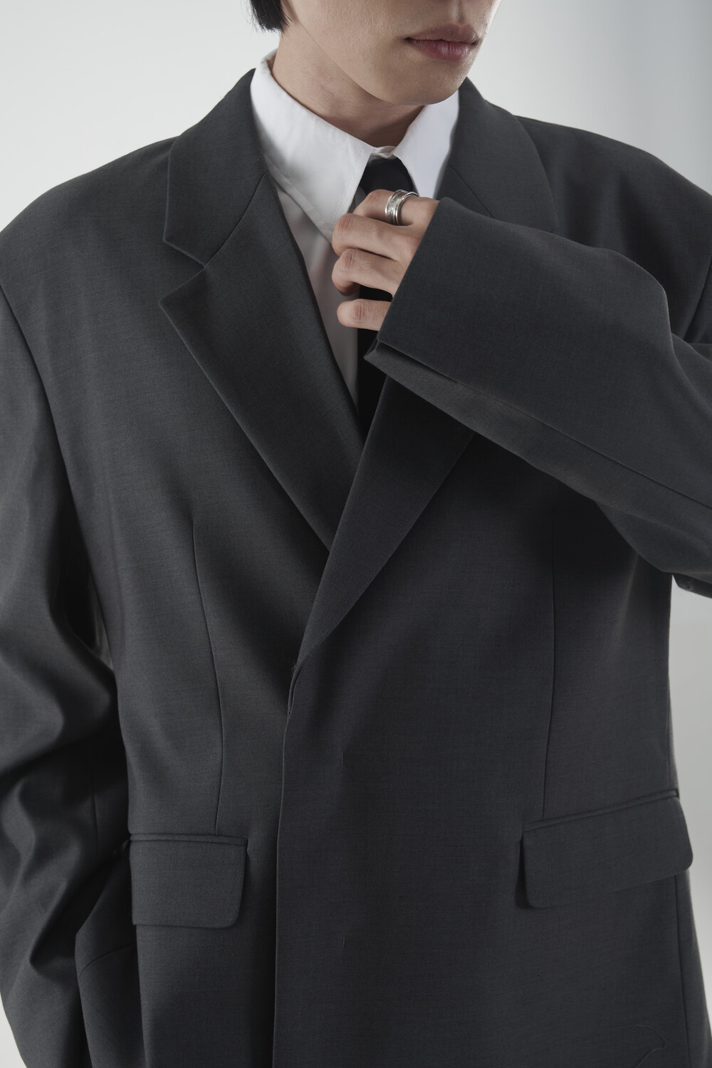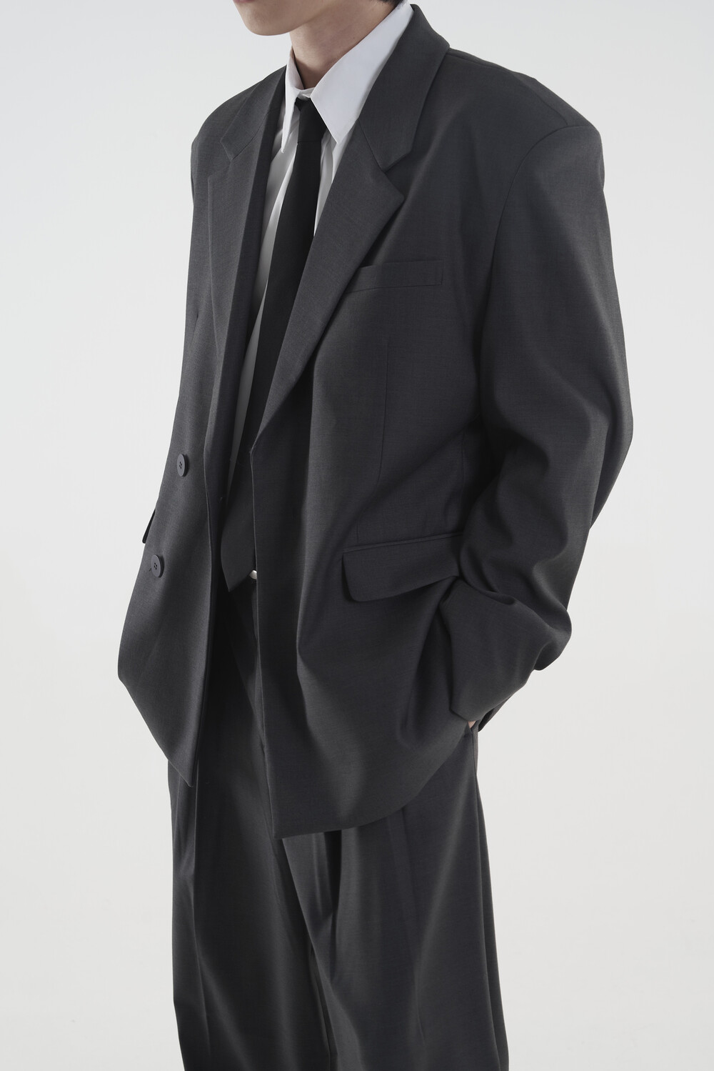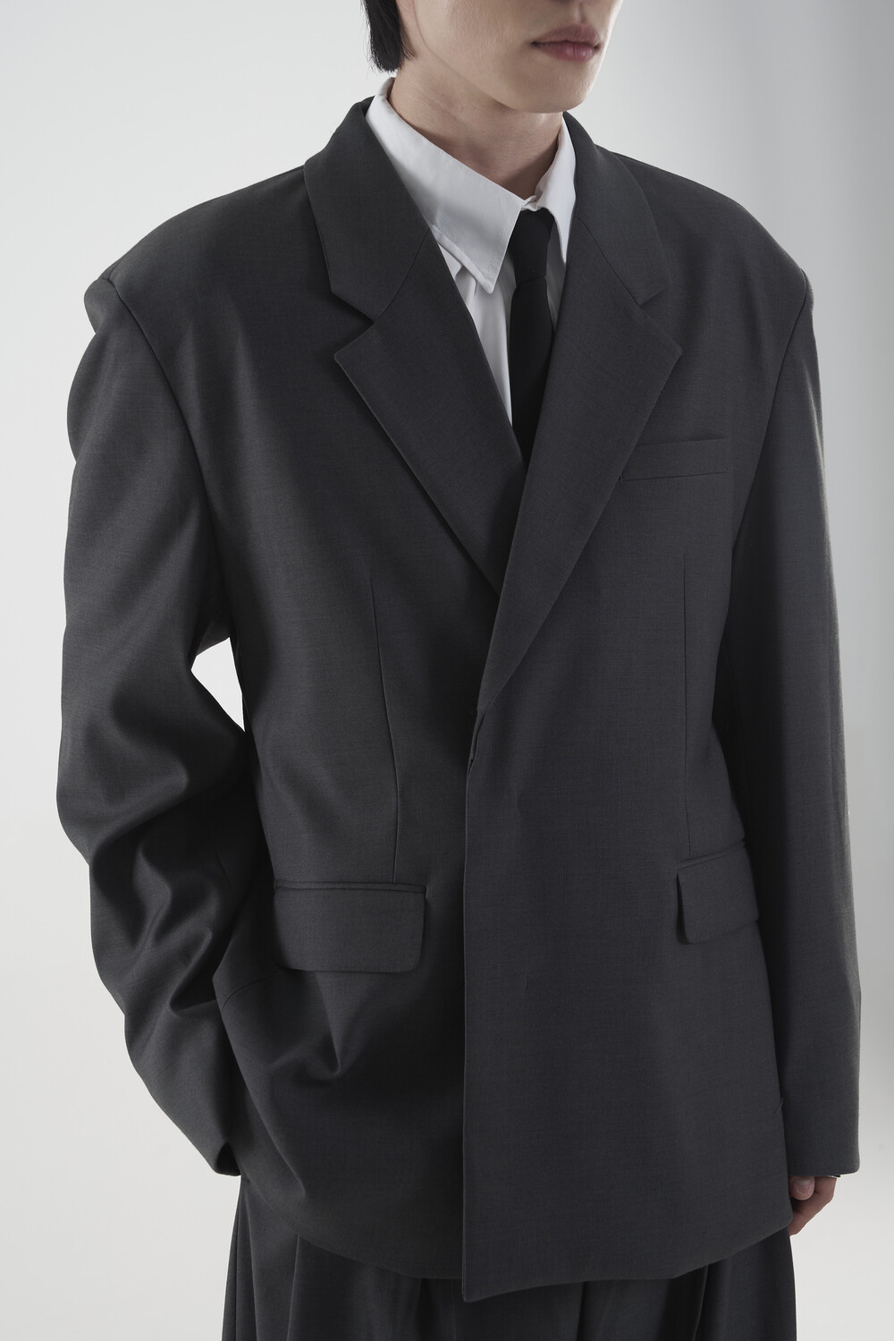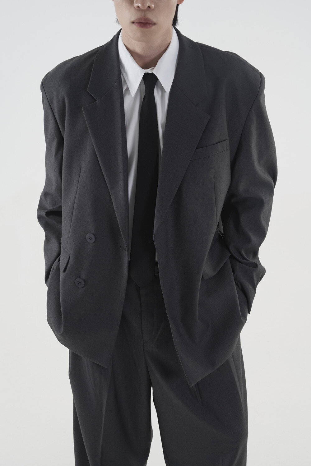 - 넓은 숄더 패드와 안정적인 오버핏 자켓 실루엣