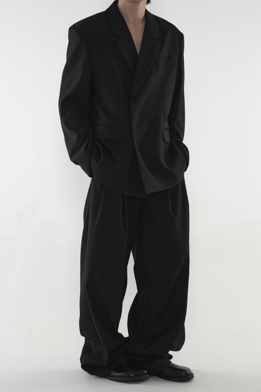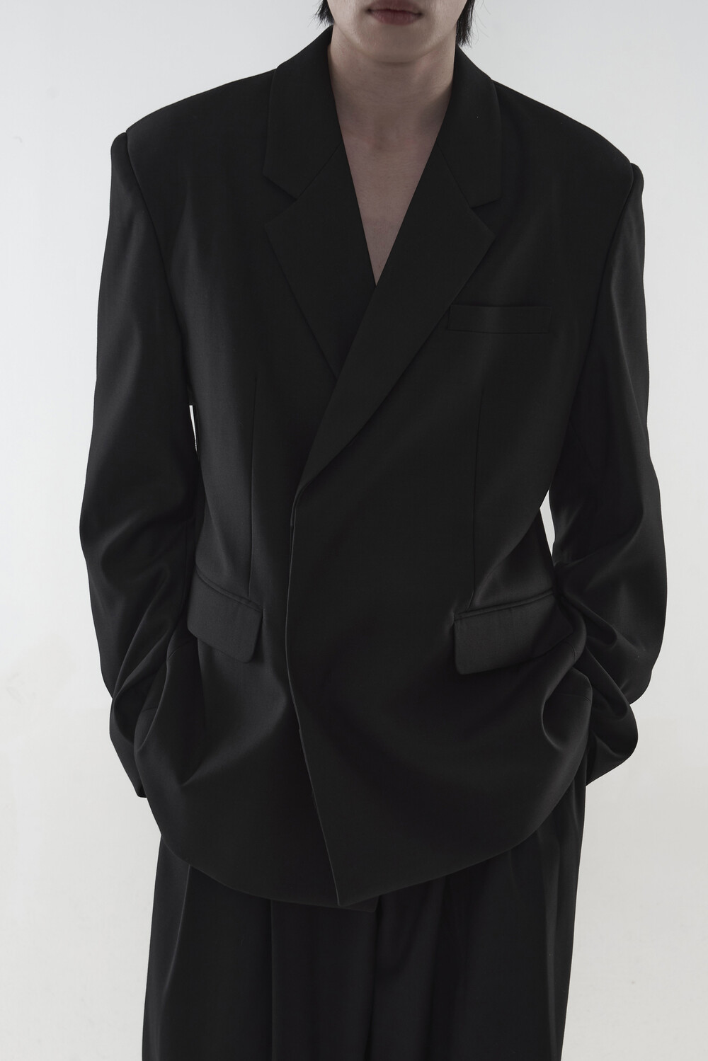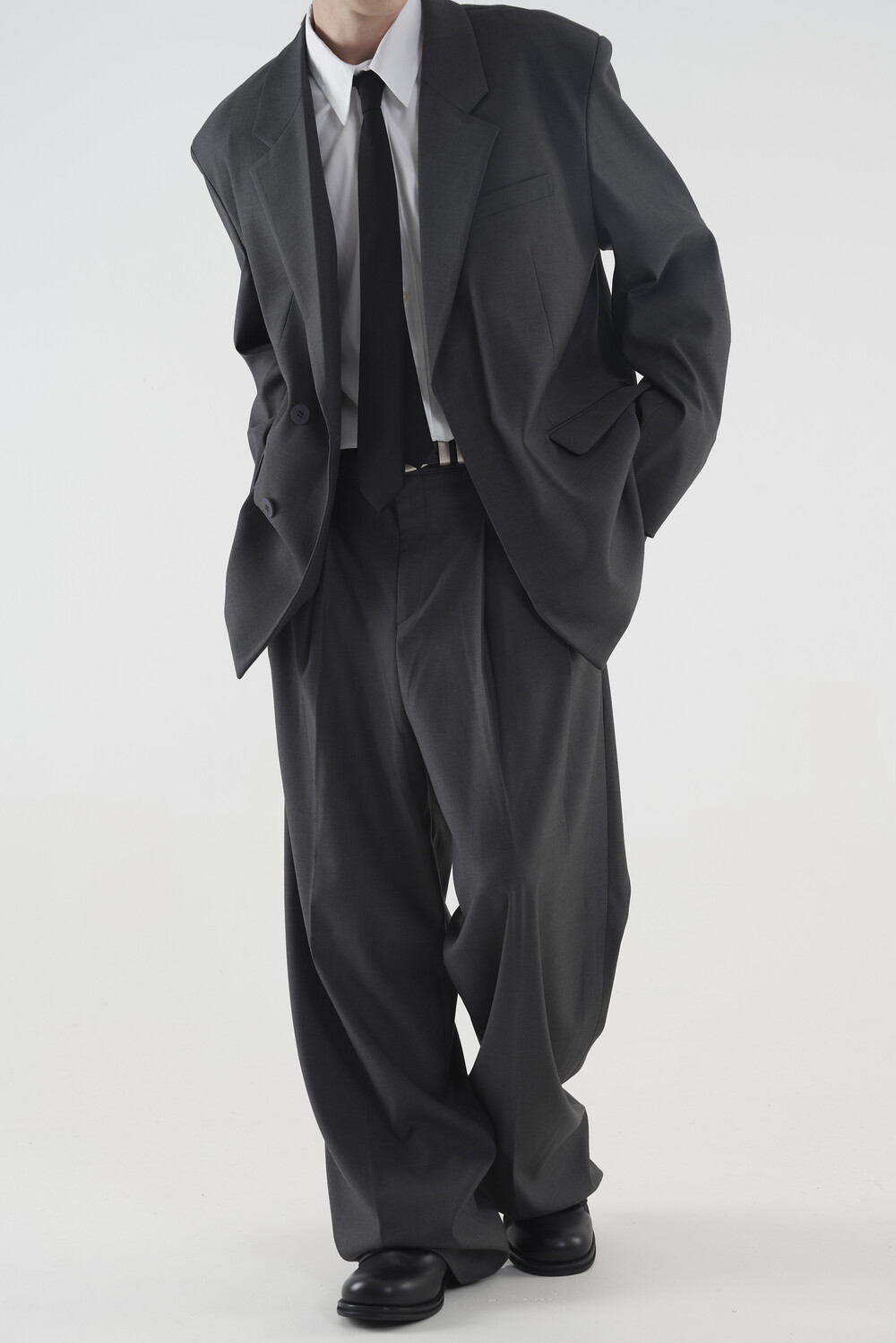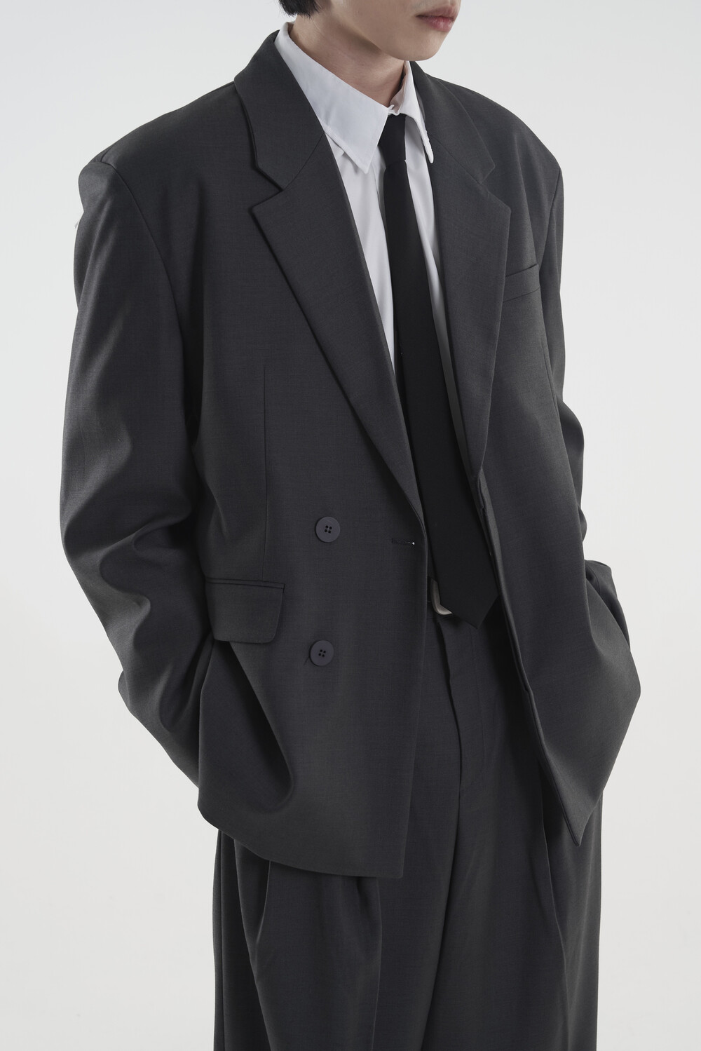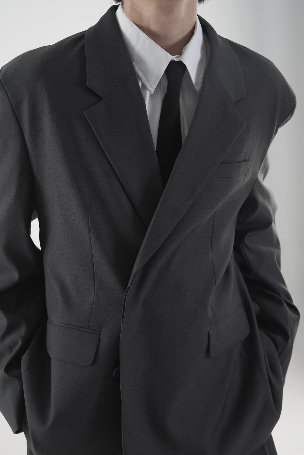 - 넓은 숄더 패드와 안정적인 오버핏 자켓 실루엣
