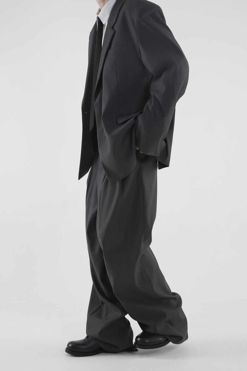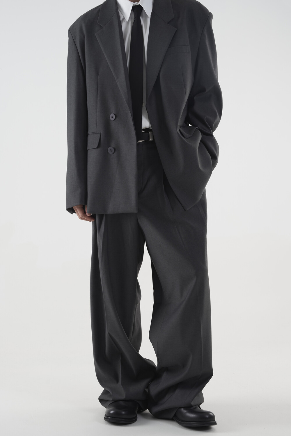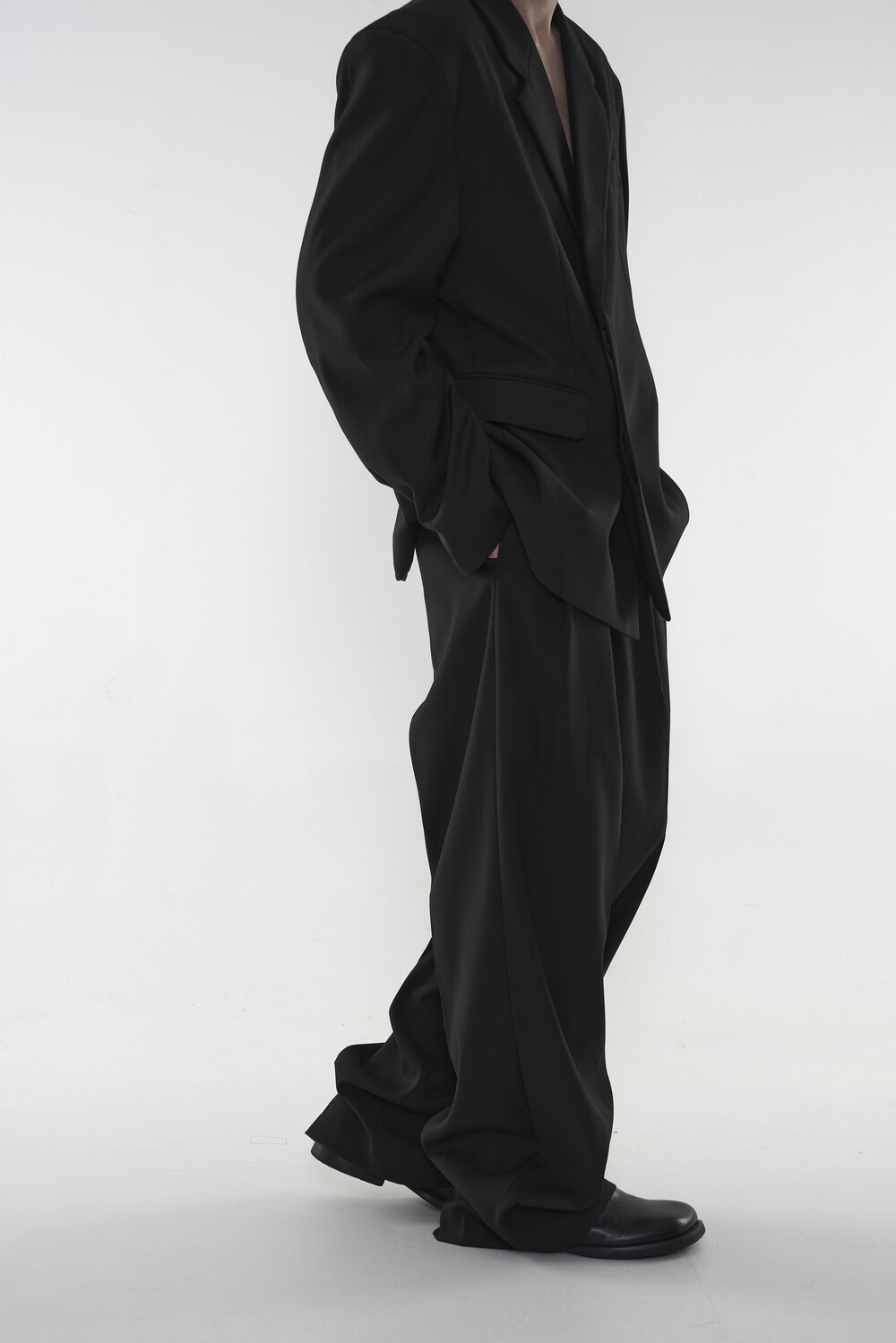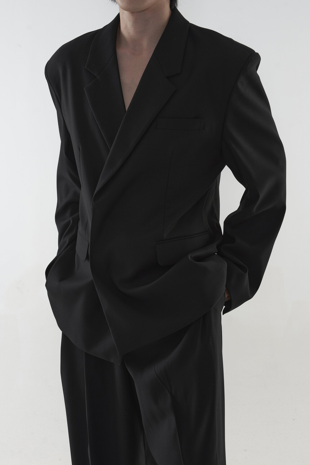 - 넓은 숄더 패드와 안정적인 오버핏 자켓 실루엣