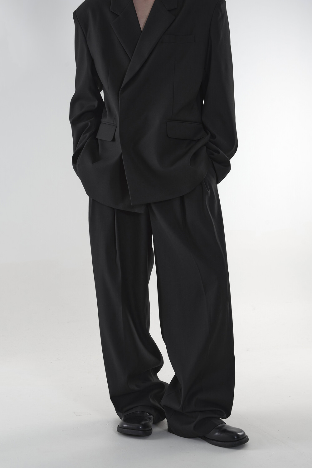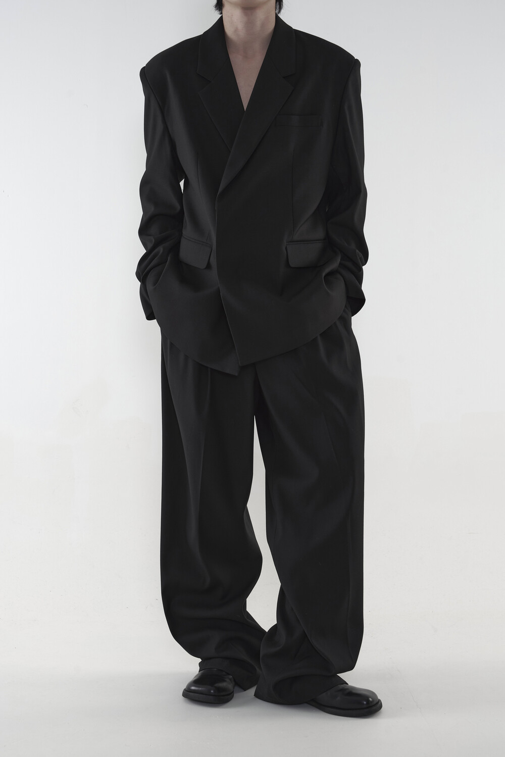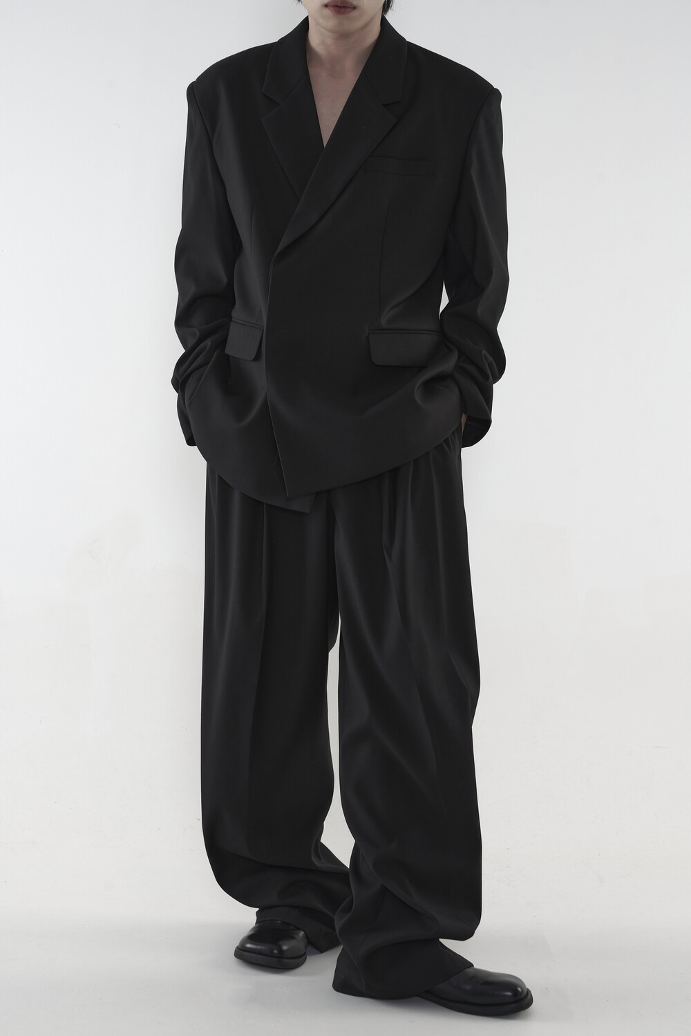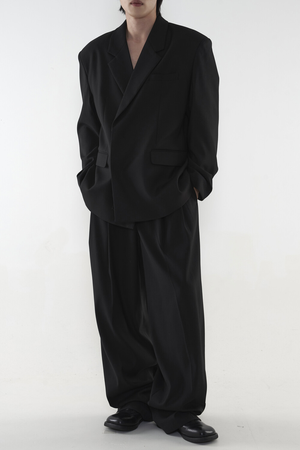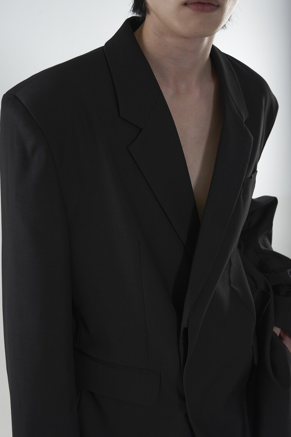 - 넓은 숄더 패드와 안정적인 오버핏 자켓 실루엣