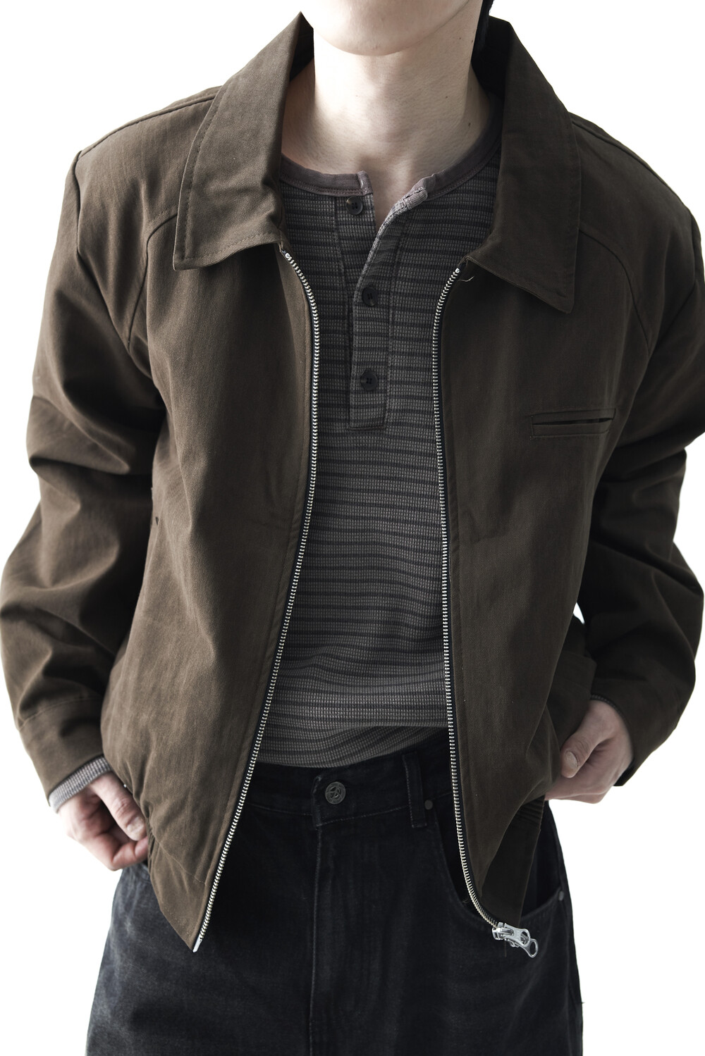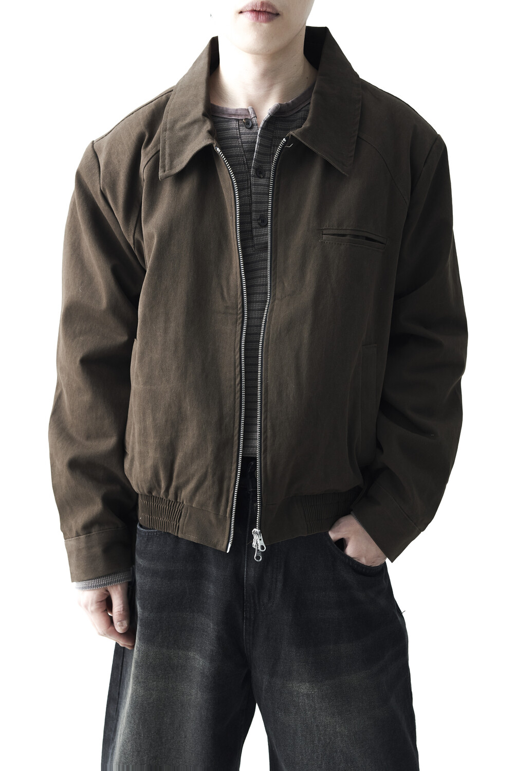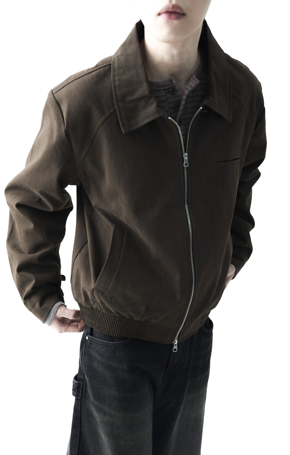 - 카치온 바이오 워싱 코튼 소재감의 미니멀한 자켓 제품입니다. 빈티지 무드의 워시드 브라운 컬러감으로 다운톤 코디에 효과적인 레이어드 코디감을 표현합니다. 하단 밴딩이 적용되어 활동성에도 뛰어난 착용감을 나타냅니다.