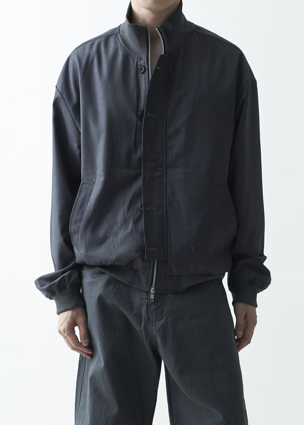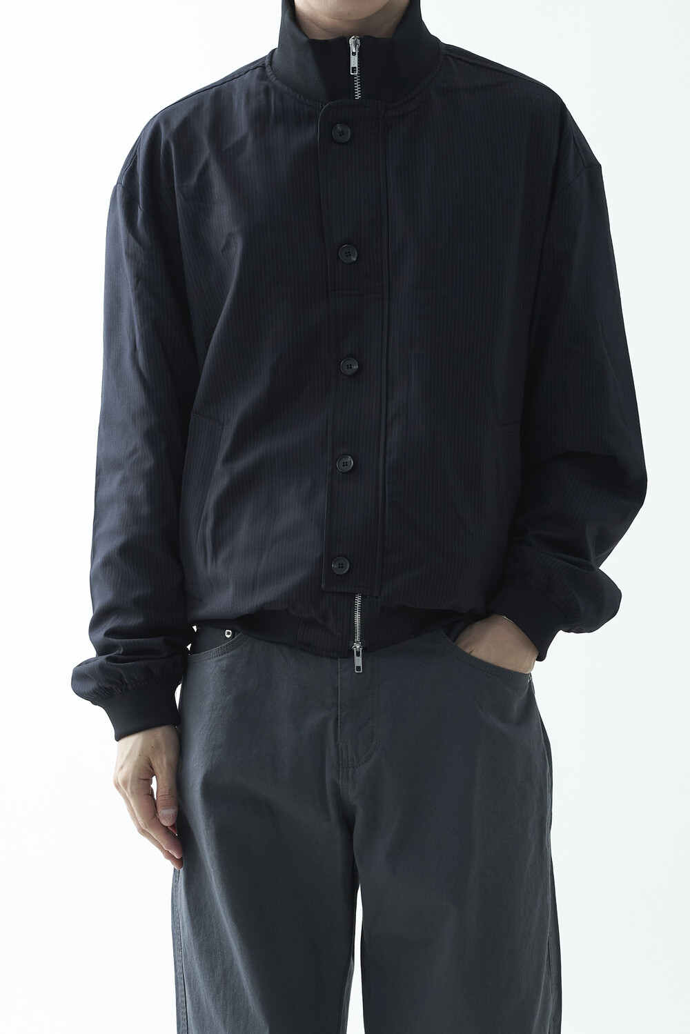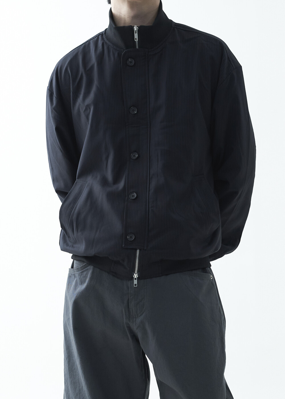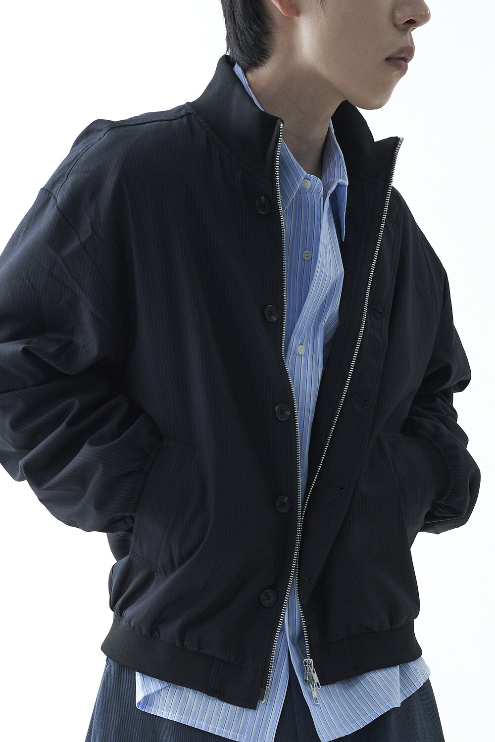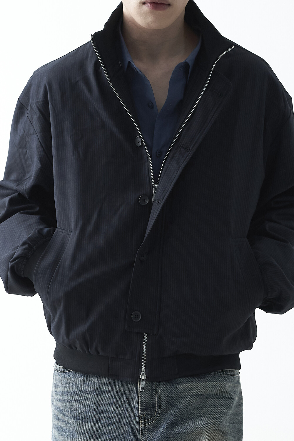 세밀한 스트라이프 패턴이 적용된 점퍼 자켓 제품입니다. 투웨이 지퍼와 외부 단추 디테일이 적용되었으며 와이드한 숄더라인에 비해 크롭한 기장감이 트렌디한 아우터 제품입니다.