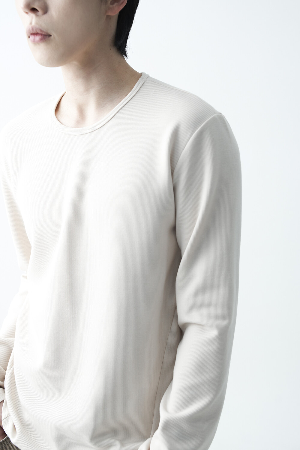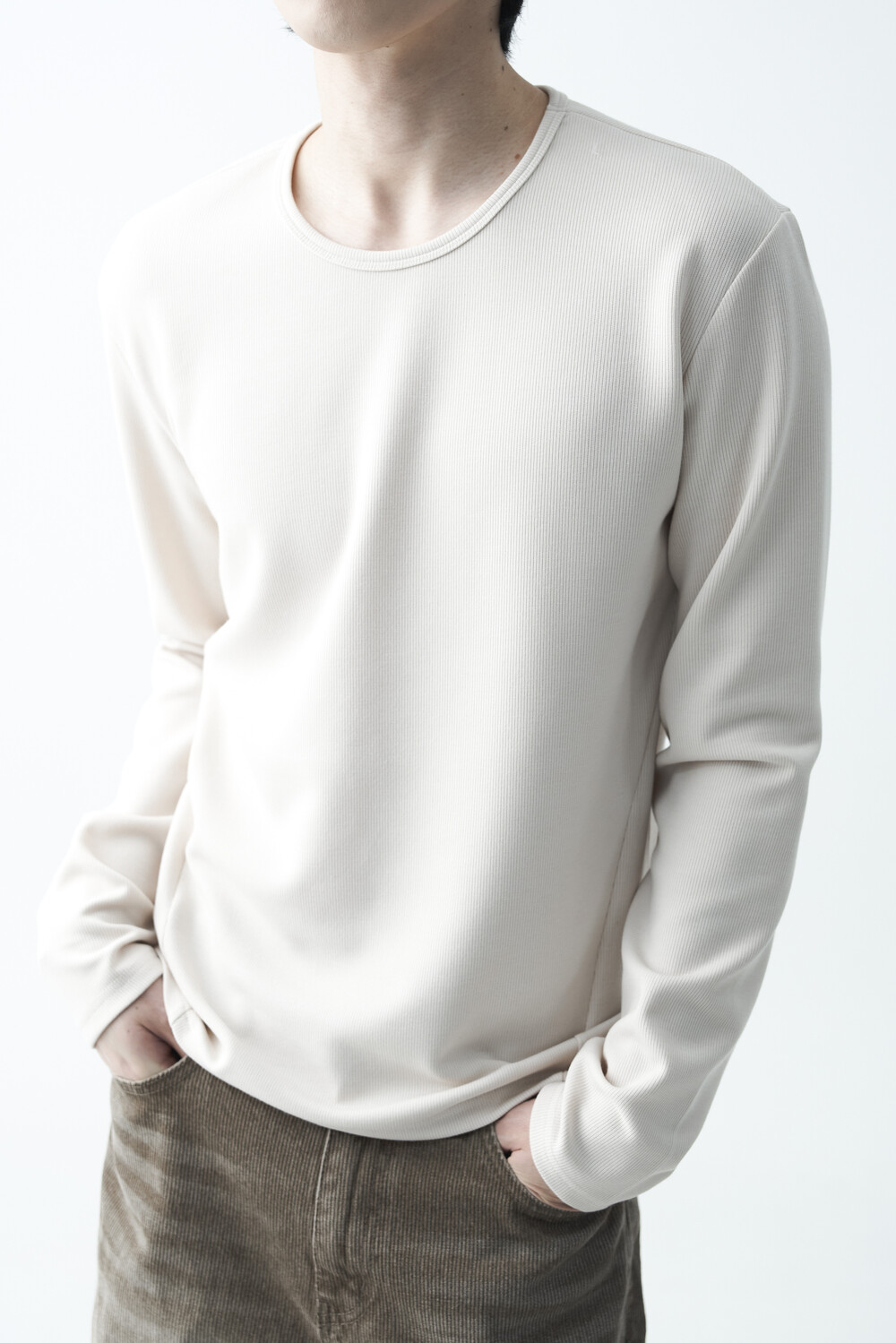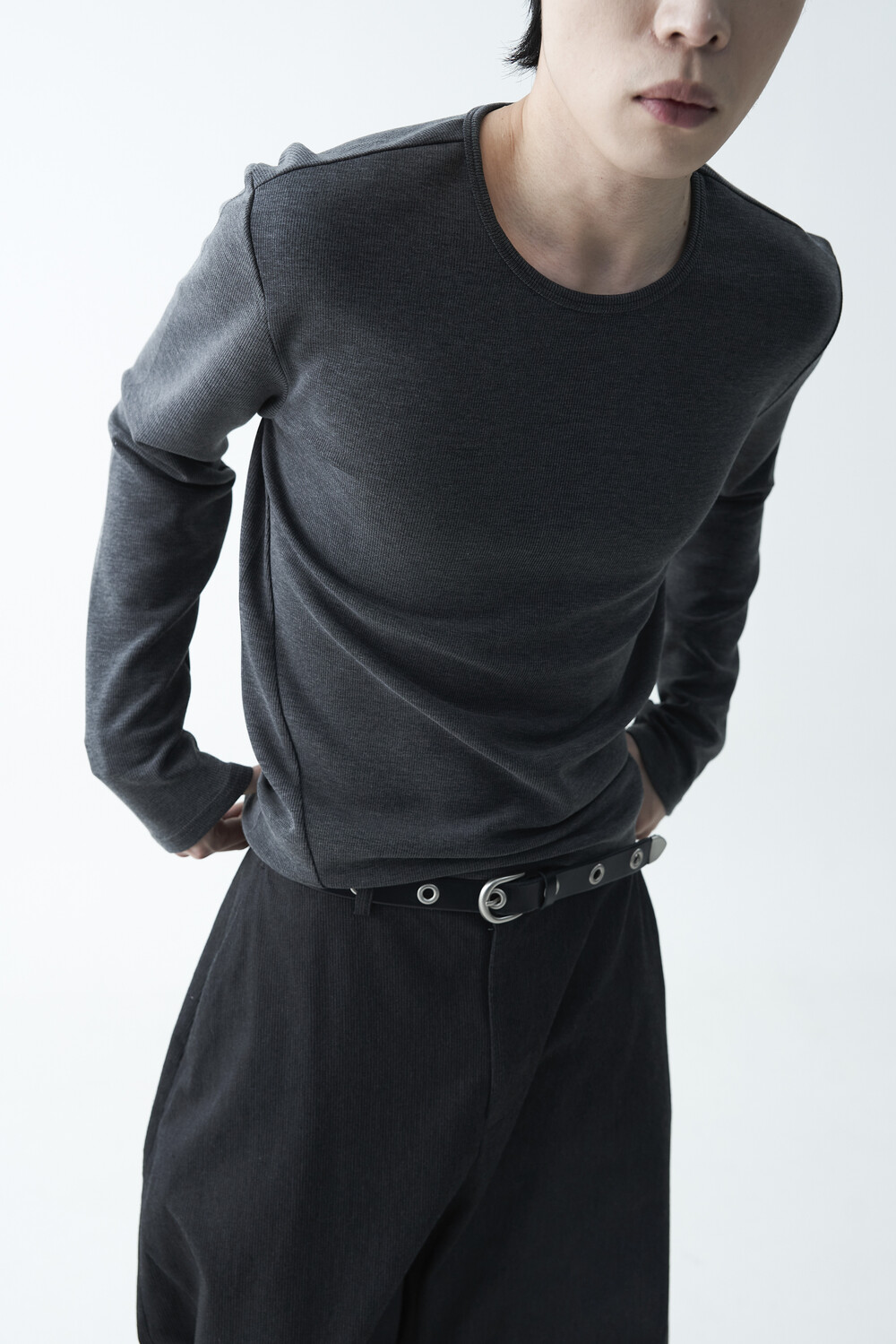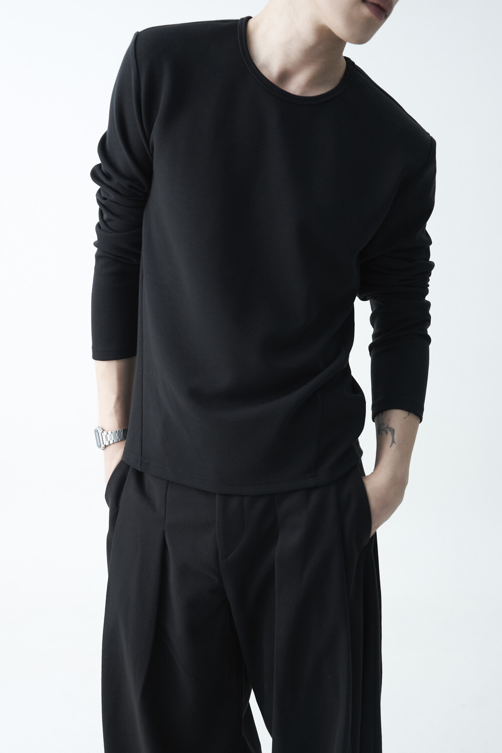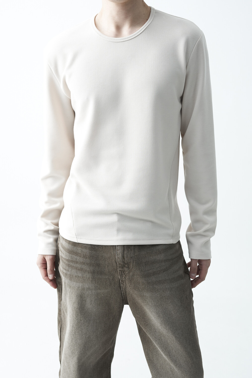 - 니트지 소재감으로 체형을 감싸주는 슬림라인의 롱슬리브 티셔츠 제품입니다. 유넥과 라운드넥의 중간 정도의 넥라인으로 단정한 목선을 표현하는 기본 이너티셔츠 제품이며, 자연스러운 스탠다드 실루엣을 나타냅니다. 하단으로 내려갈 수록 좁아지는 핏감으로 머슬핏으로 연출 또한 가능합니다.