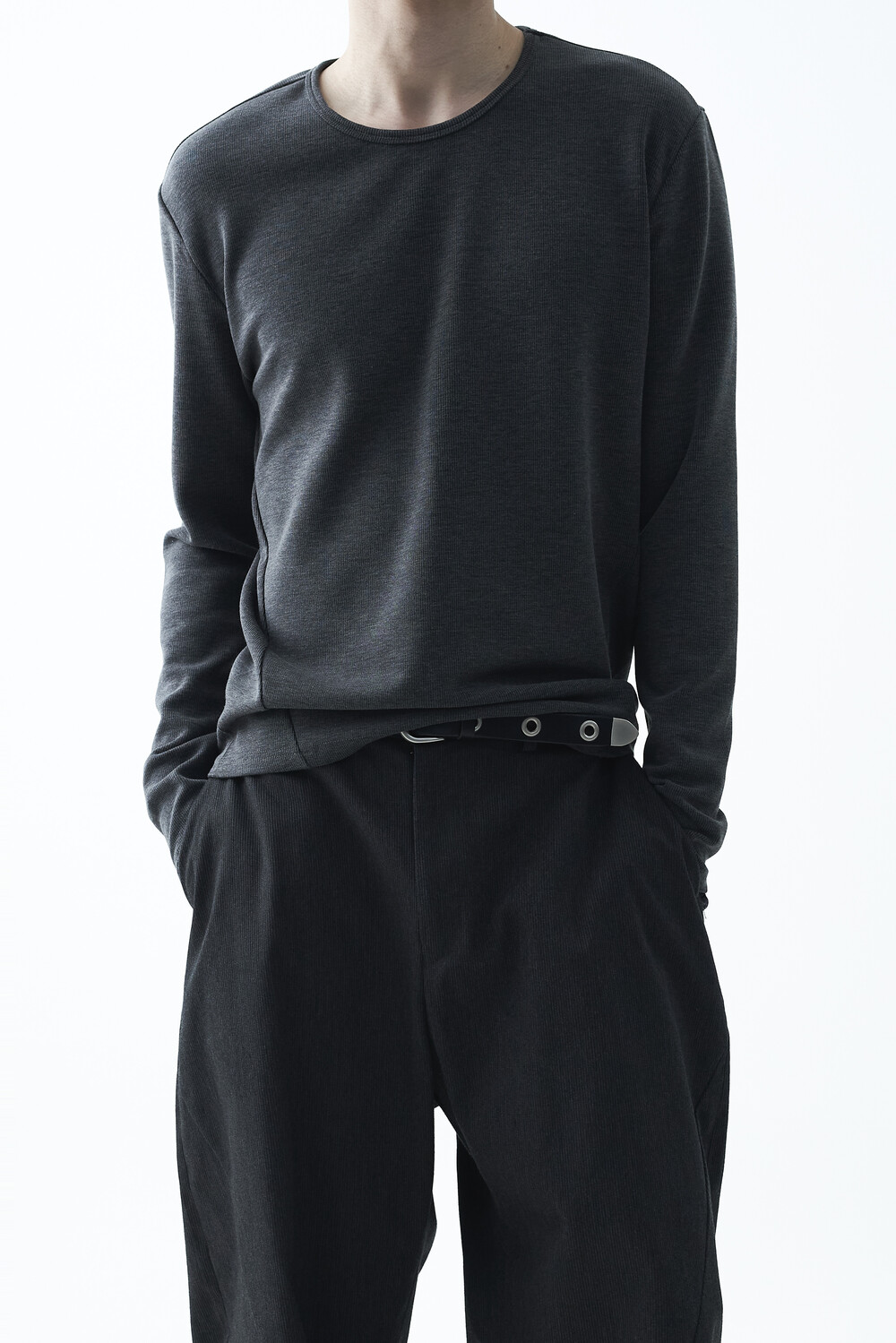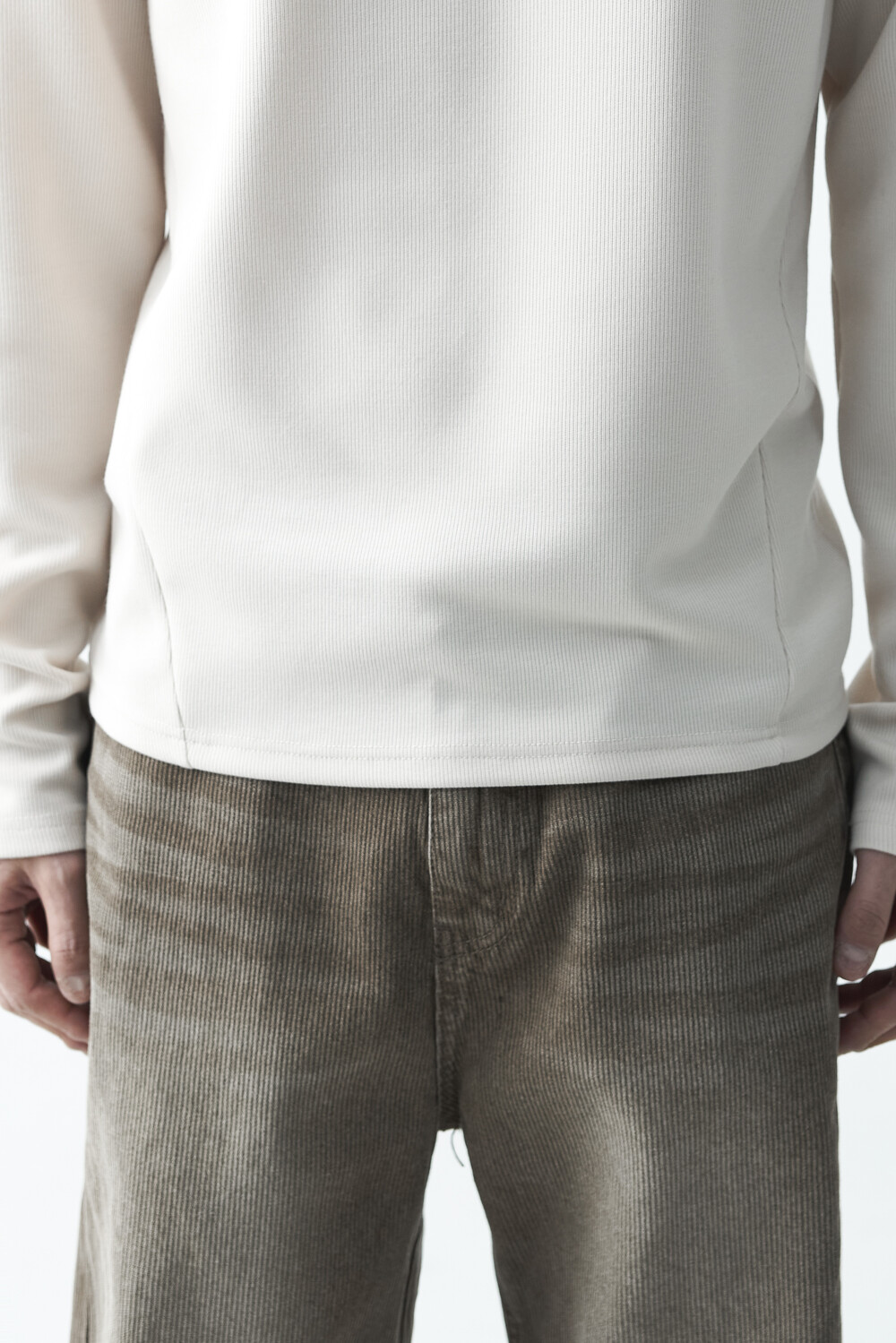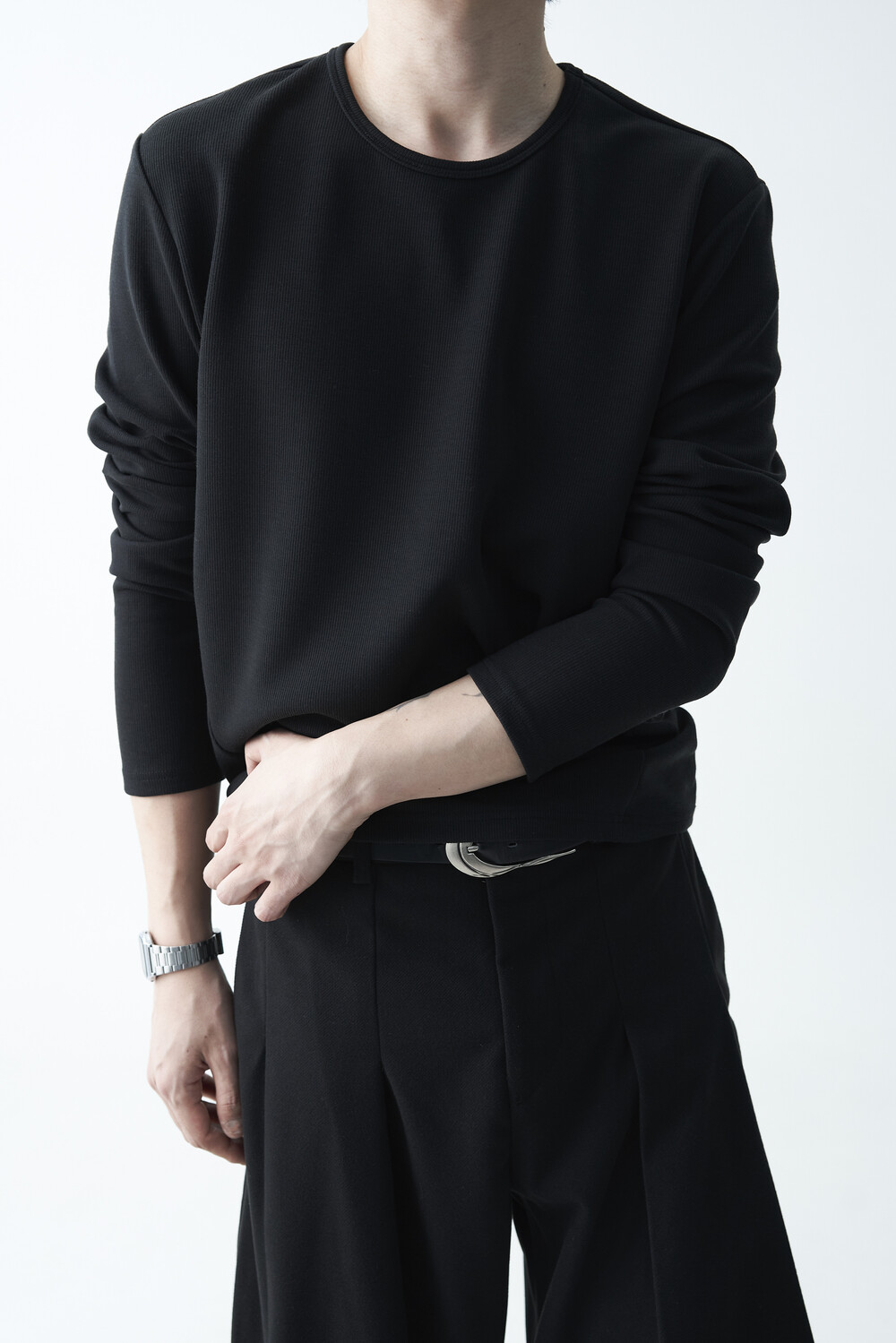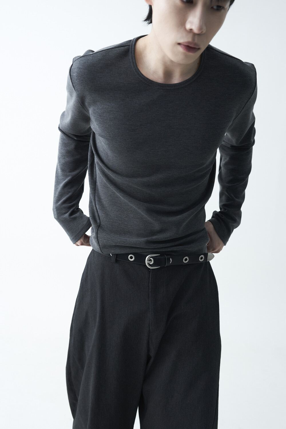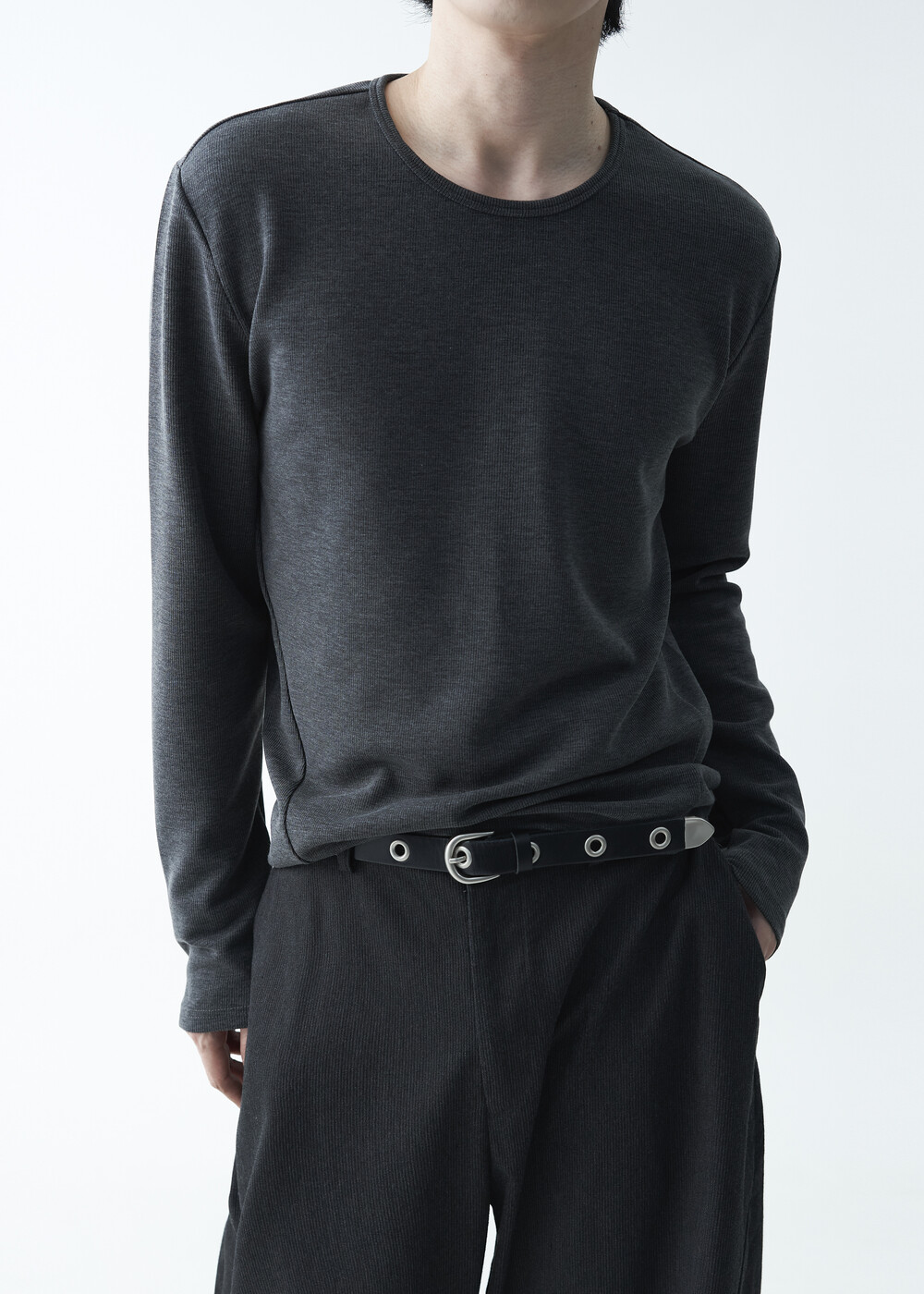 - 니트지 소재감으로 체형을 감싸주는 슬림라인의 롱슬리브 티셔츠 제품입니다. 유넥과 라운드넥의 중간 정도의 넥라인으로 단정한 목선을 표현하는 기본 이너티셔츠 제품이며, 자연스러운 스탠다드 실루엣을 나타냅니다. 하단으로 내려갈 수록 좁아지는 핏감으로 머슬핏으로 연출 또한 가능합니다.
