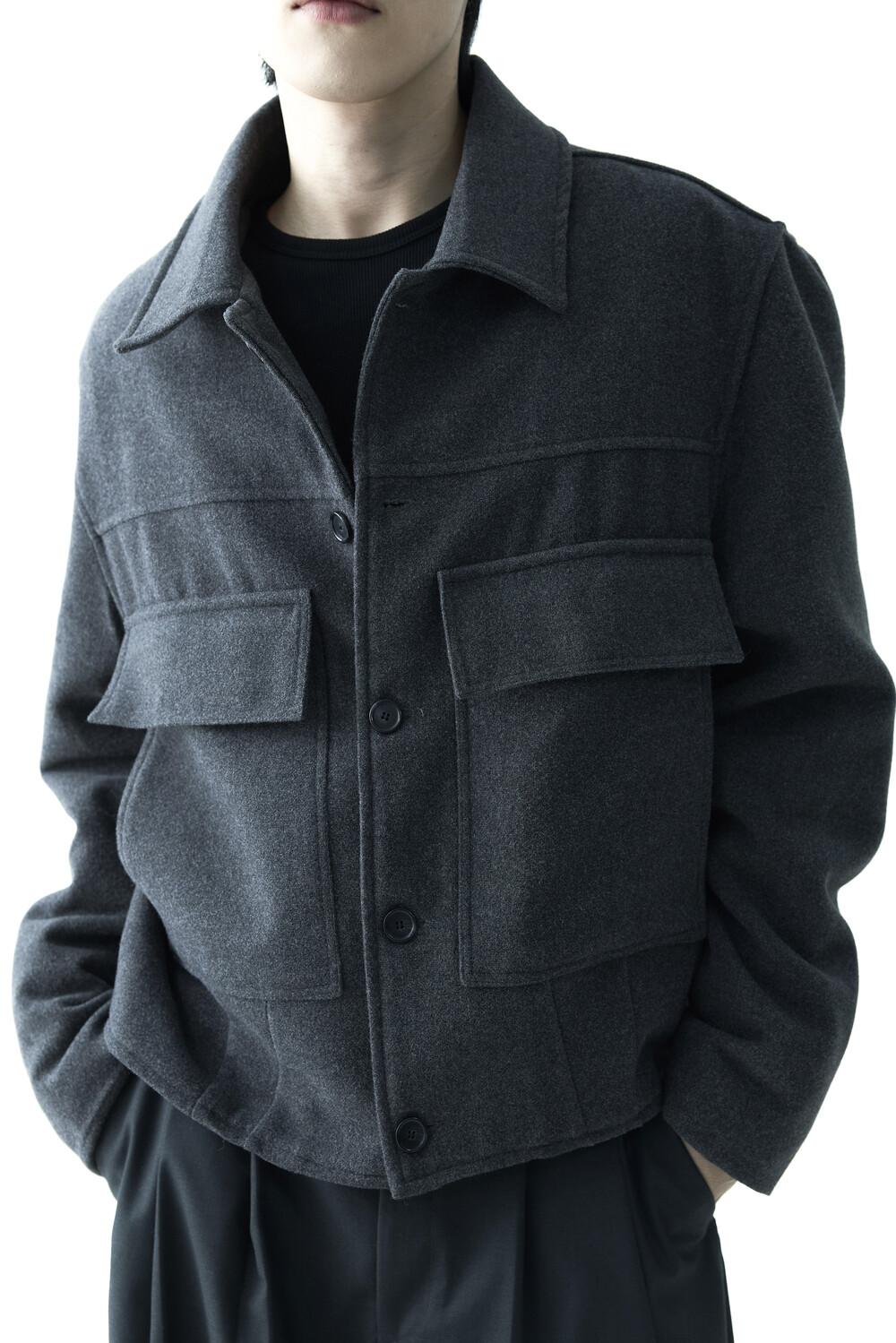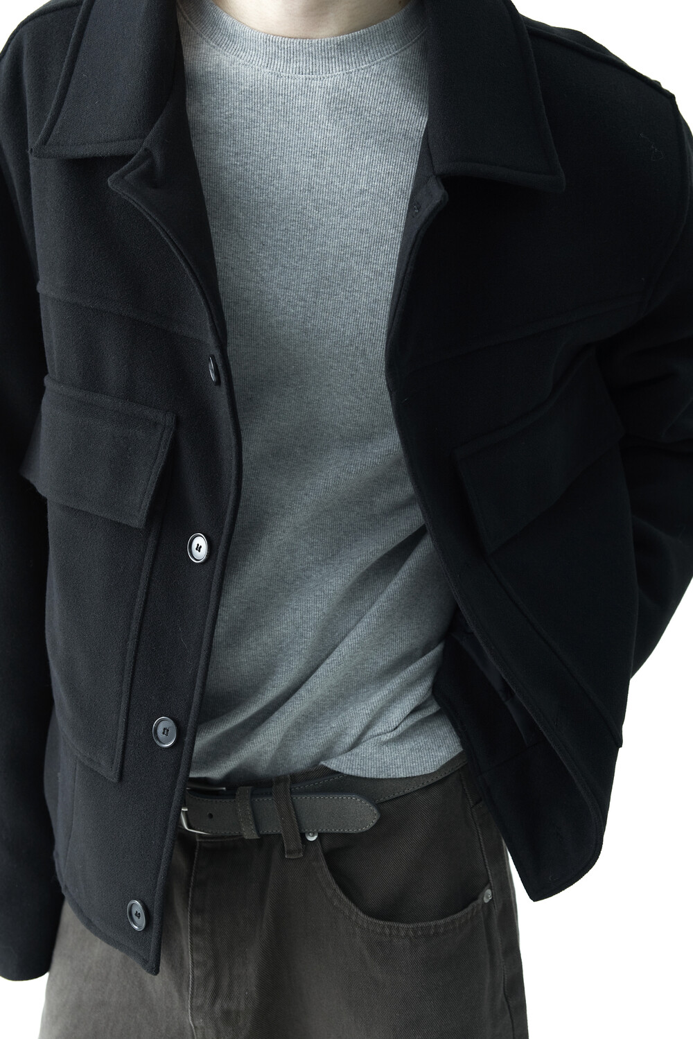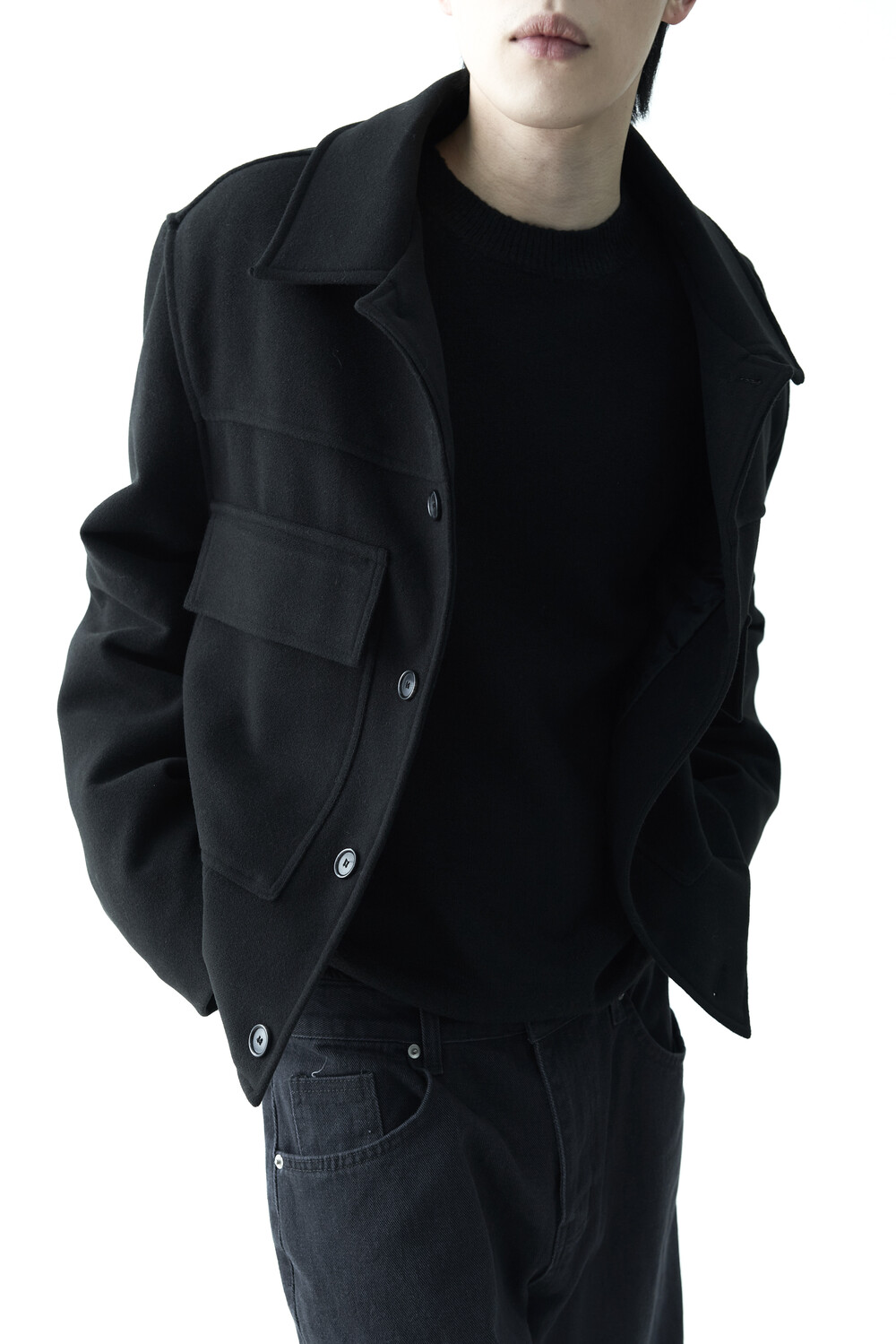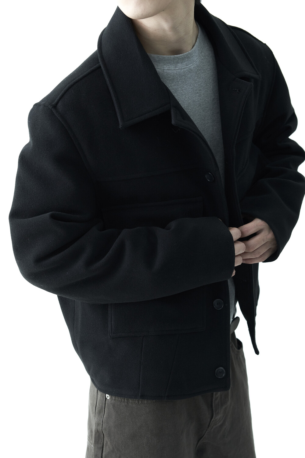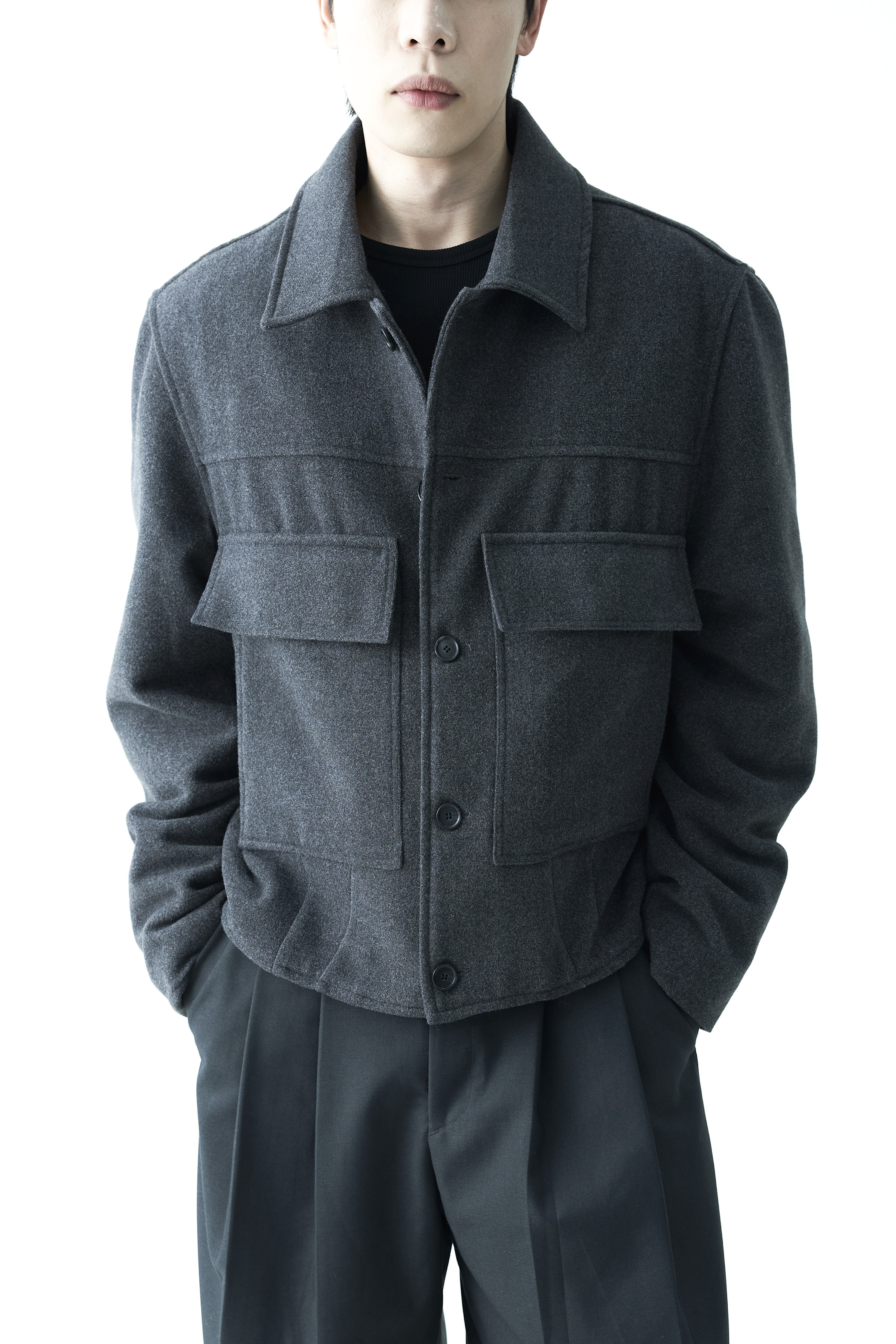 - 포멀한 싱글 자켓 스타일을 베이스로 오버한 투포켓과 전면부 절개 슬릿이 적용된 크롭 자켓 제품입니다.