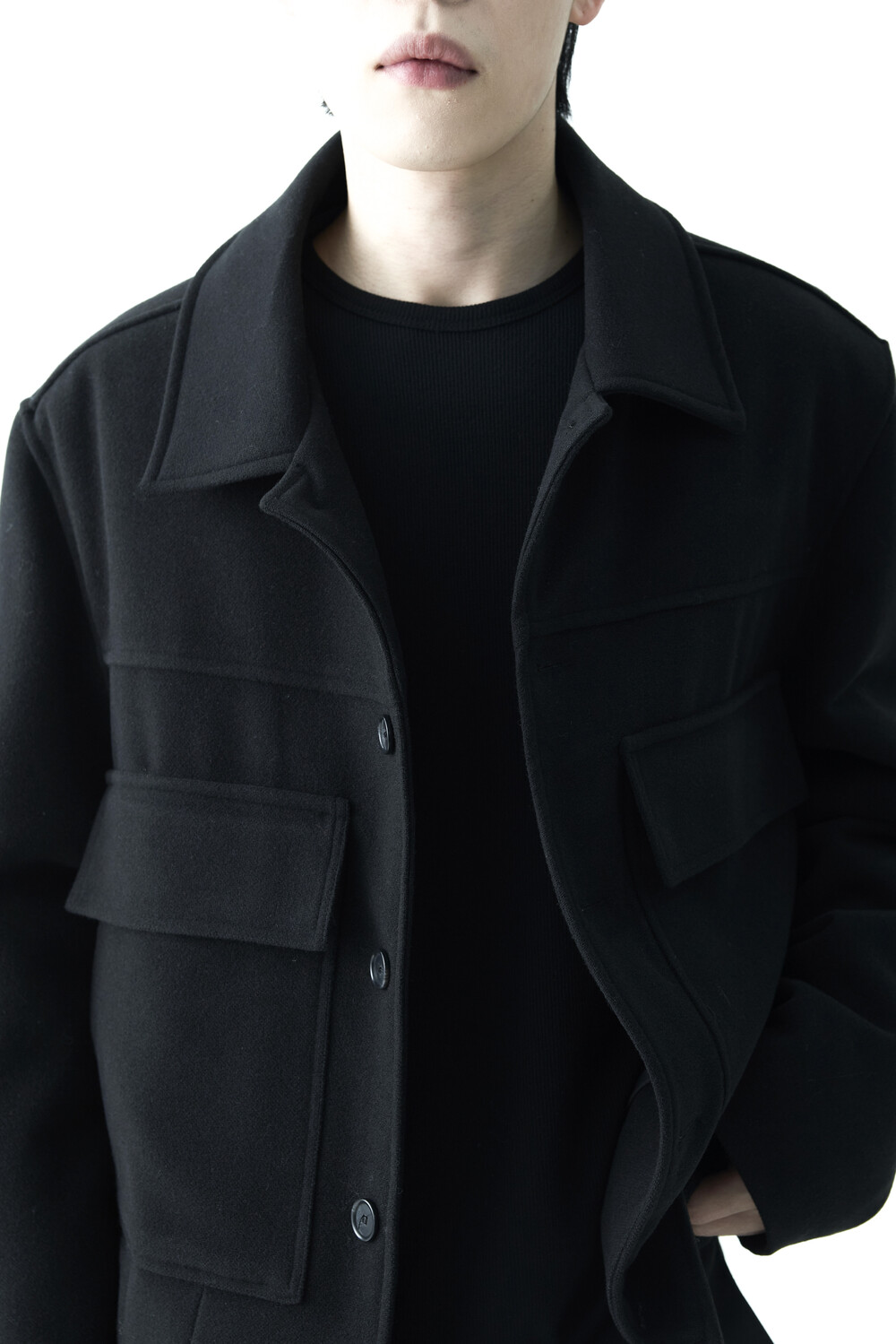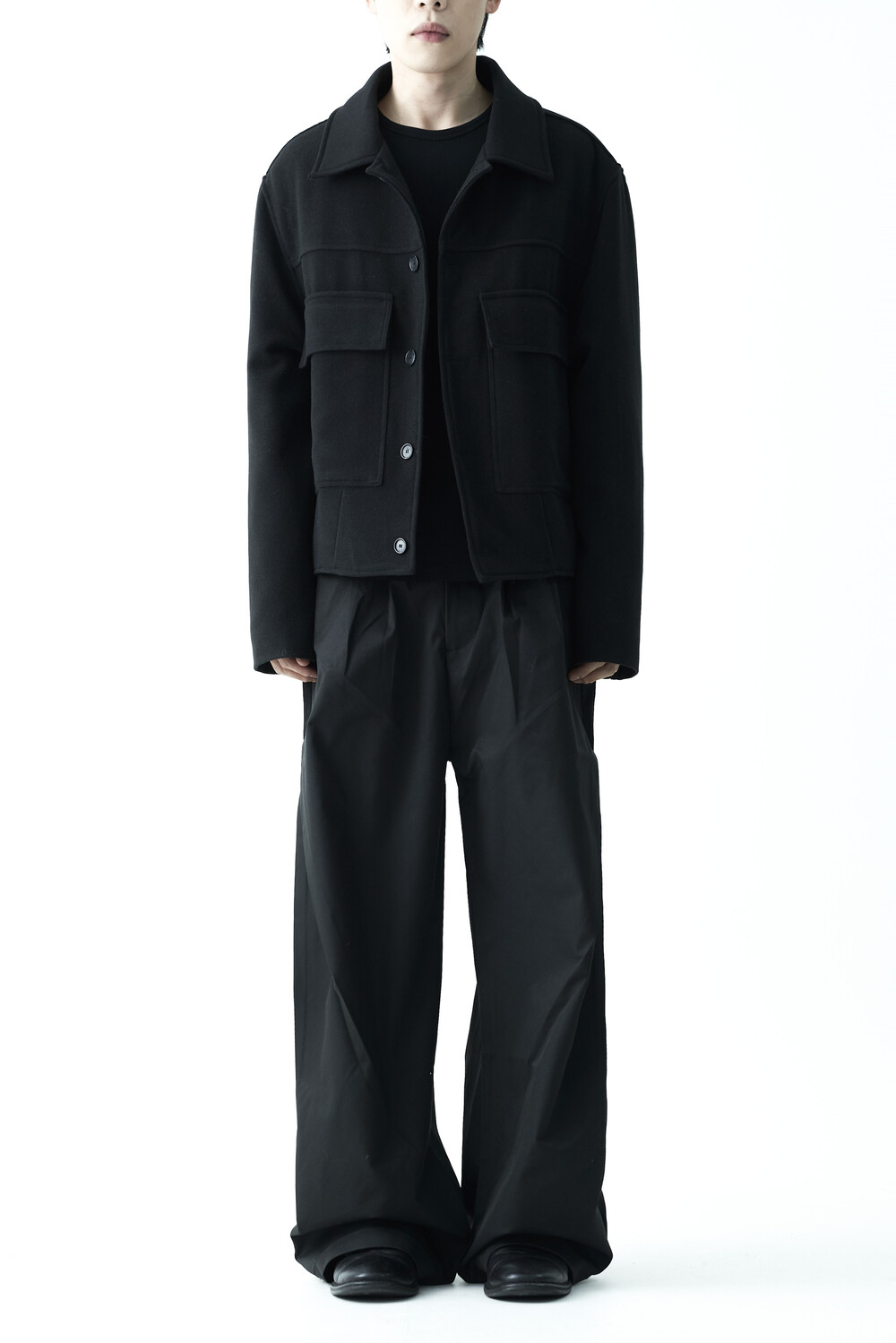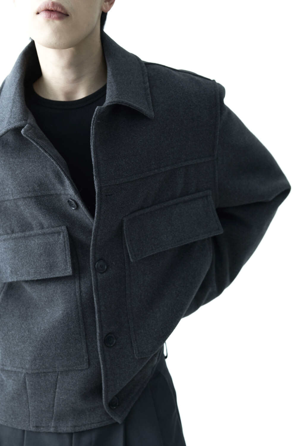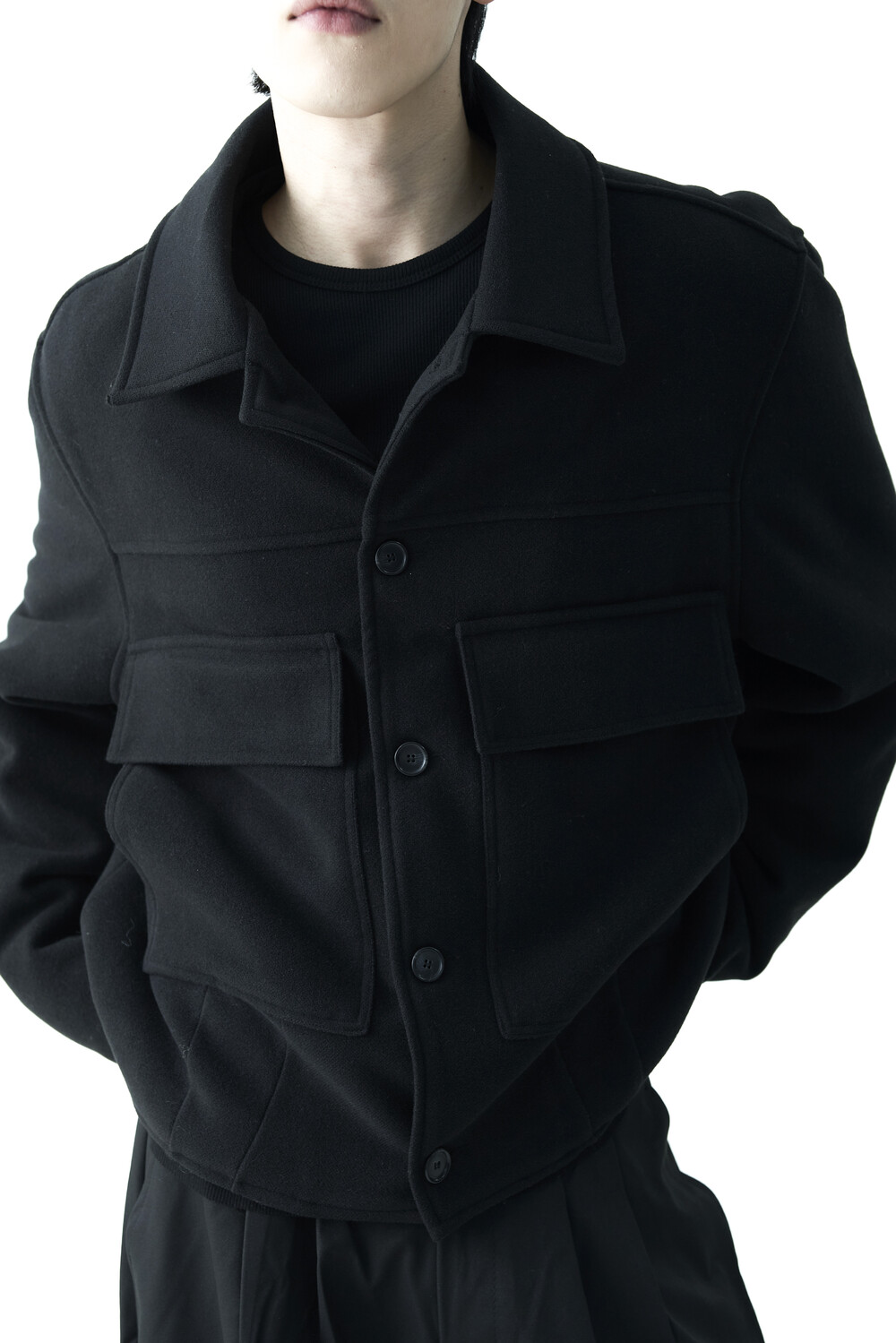 - 포멀한 싱글 자켓 스타일을 베이스로 오버한 투포켓과 전면부 절개 슬릿이 적용된 크롭 자켓 제품입니다.