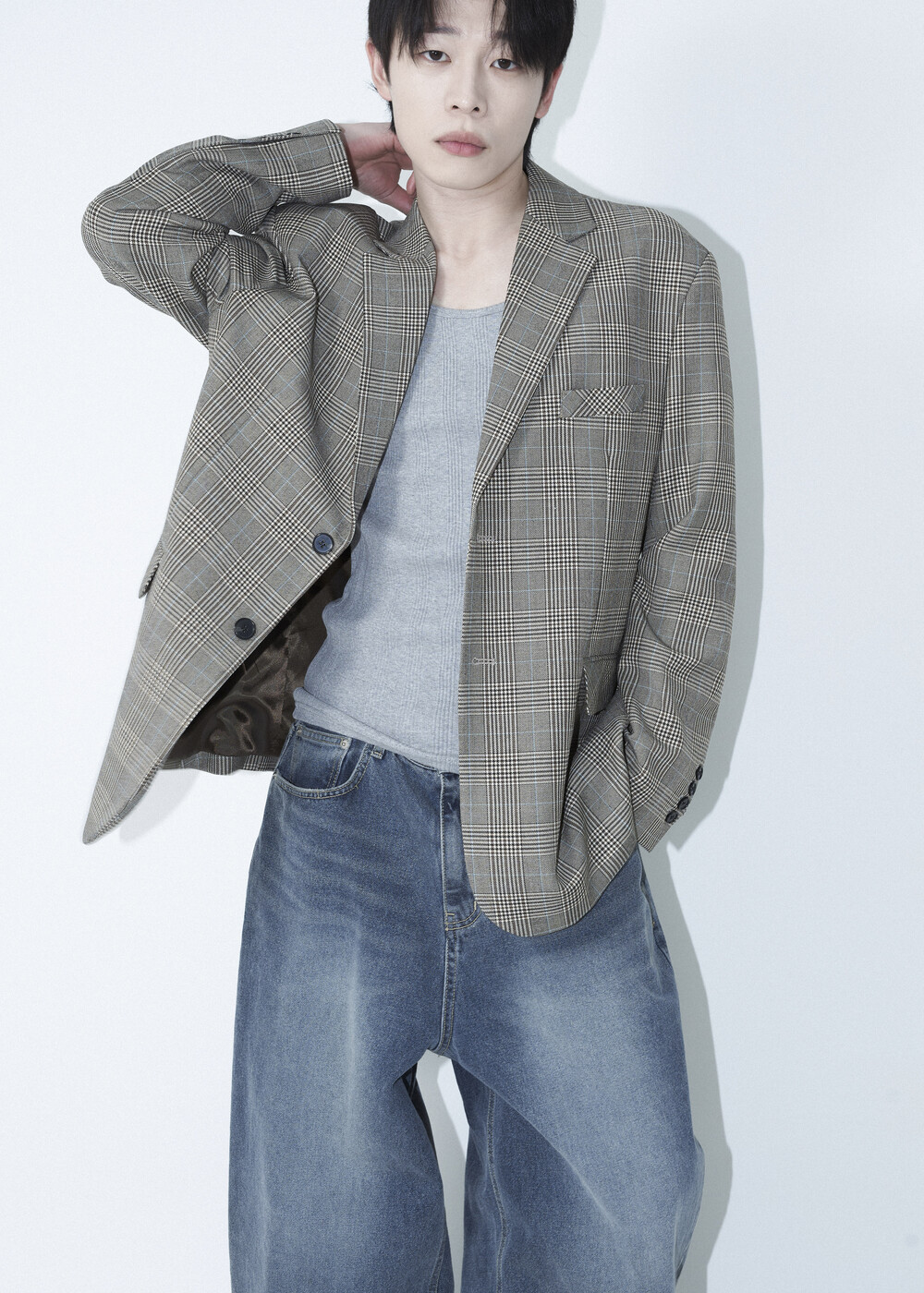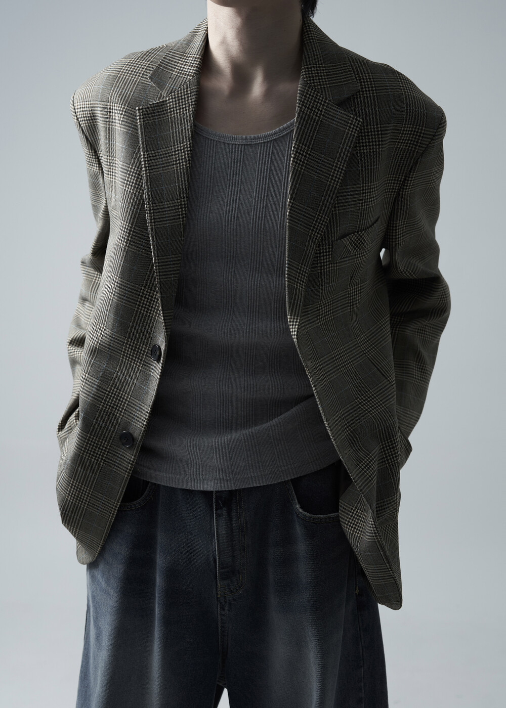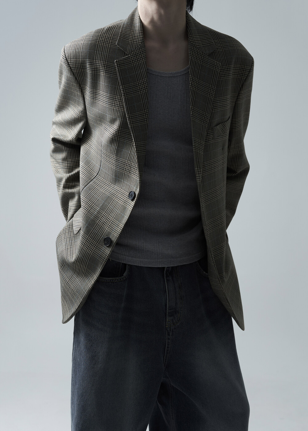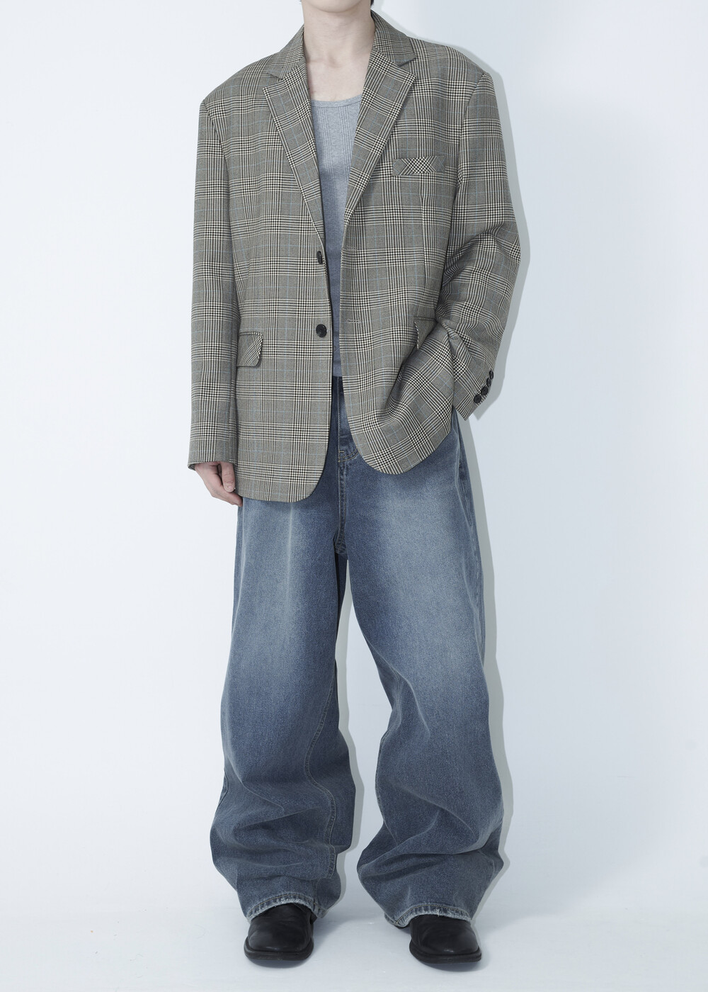 레트로 감성을 현대적인 느낌으로 재해석한 베이지 컬러감의 대디핏 체크 블레이져 자켓 제품입니다.