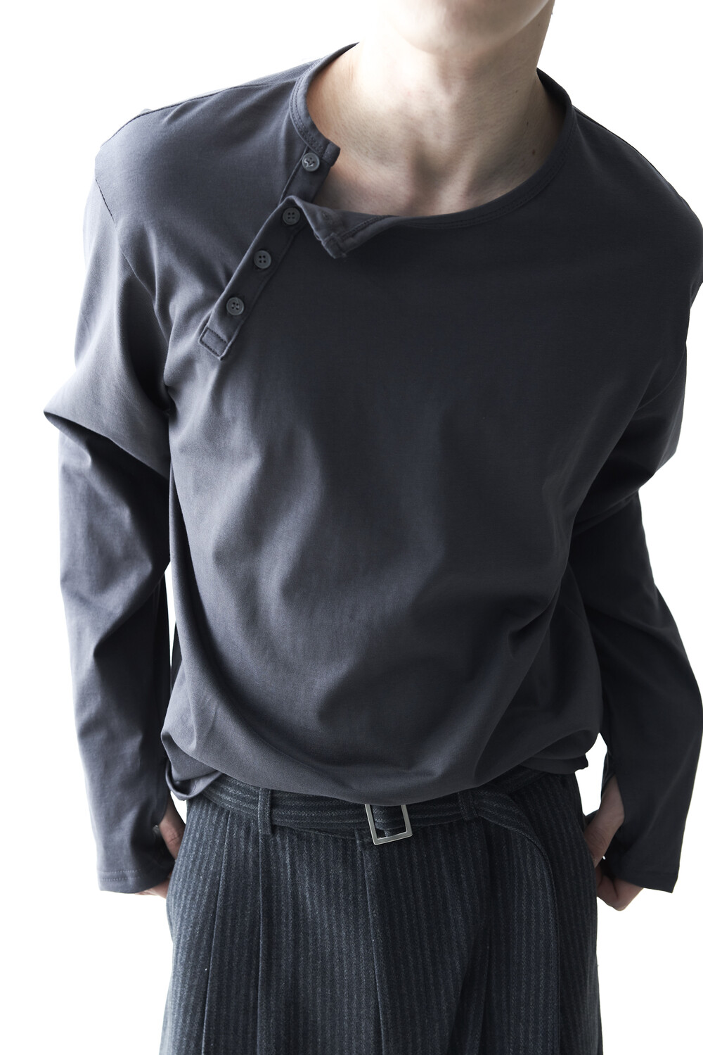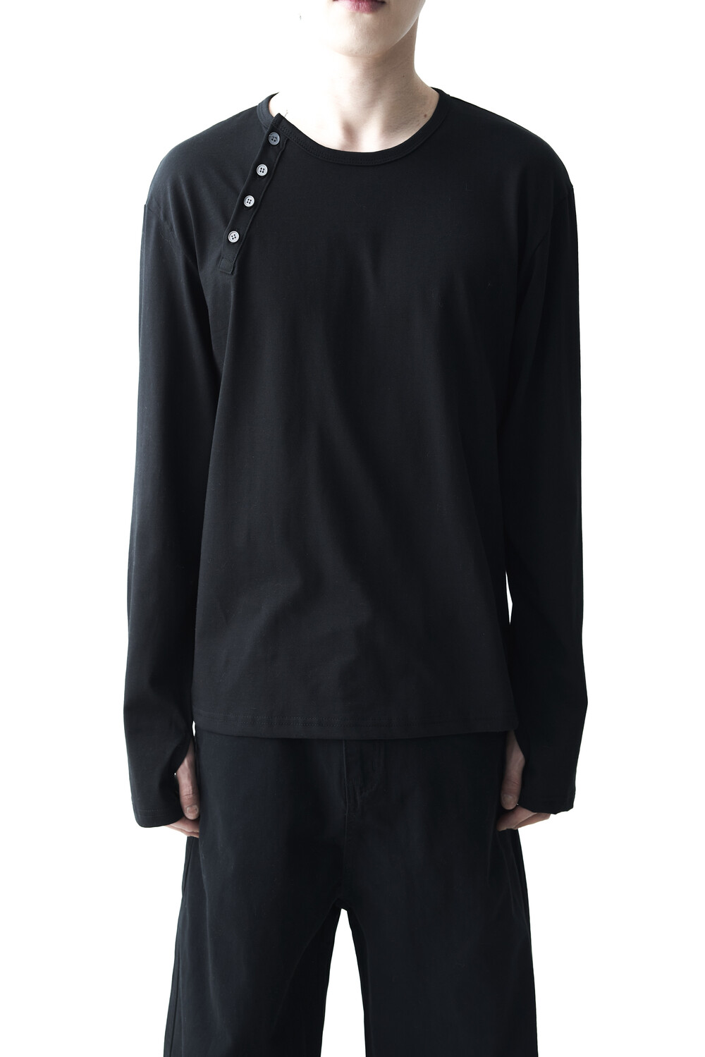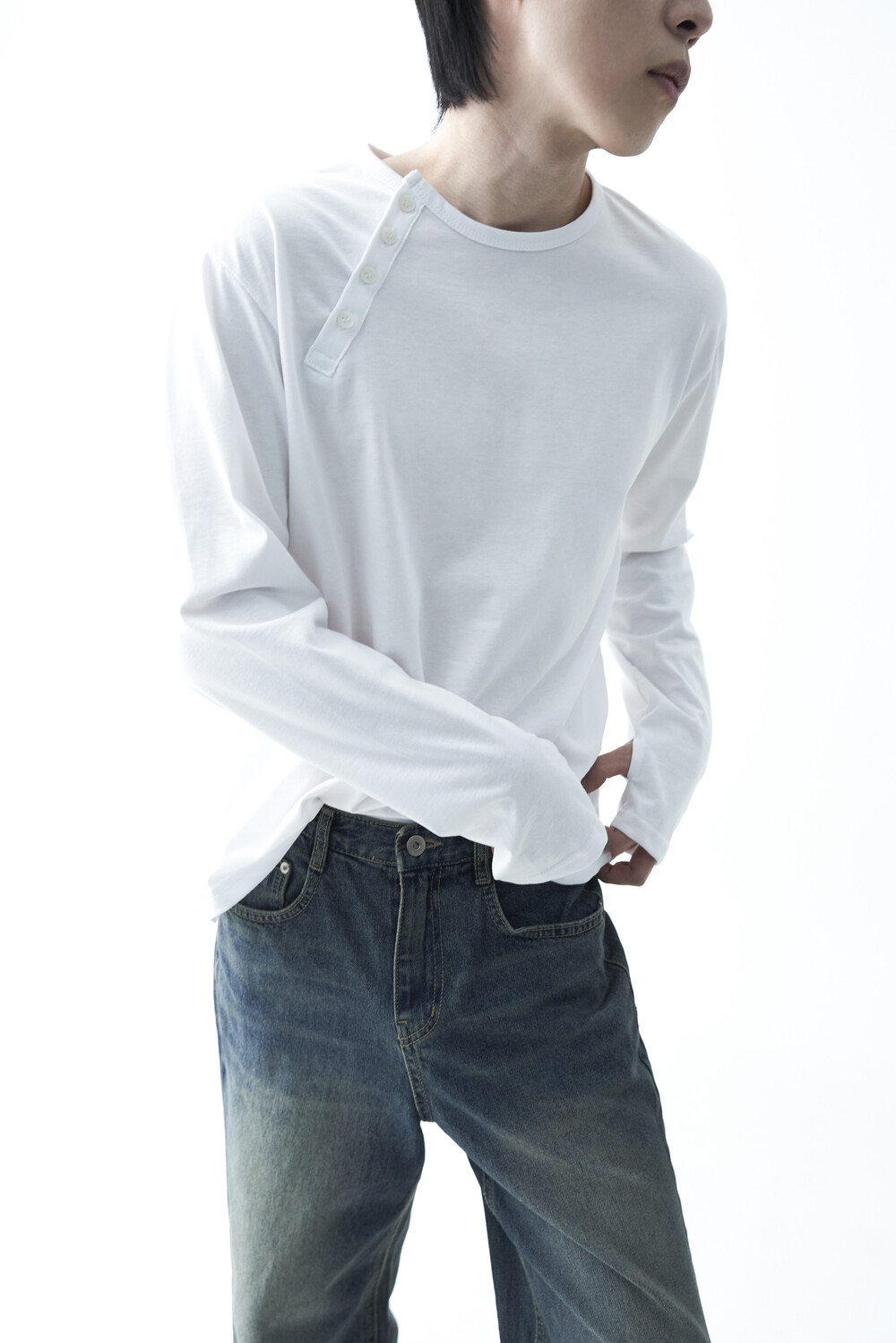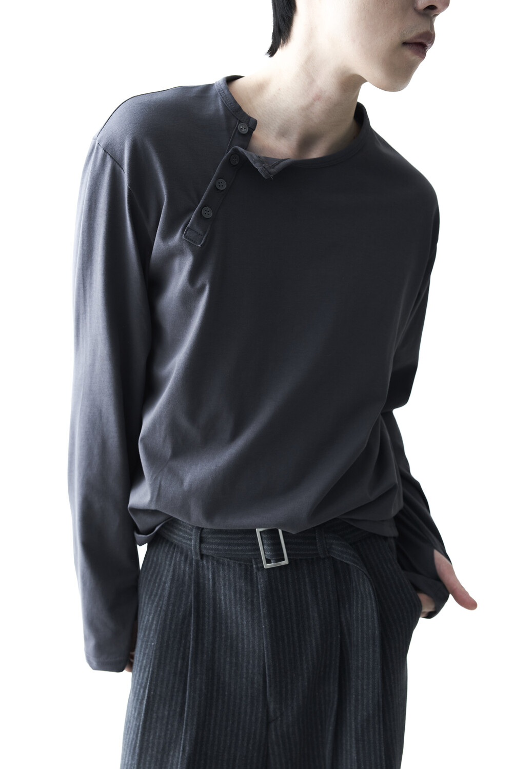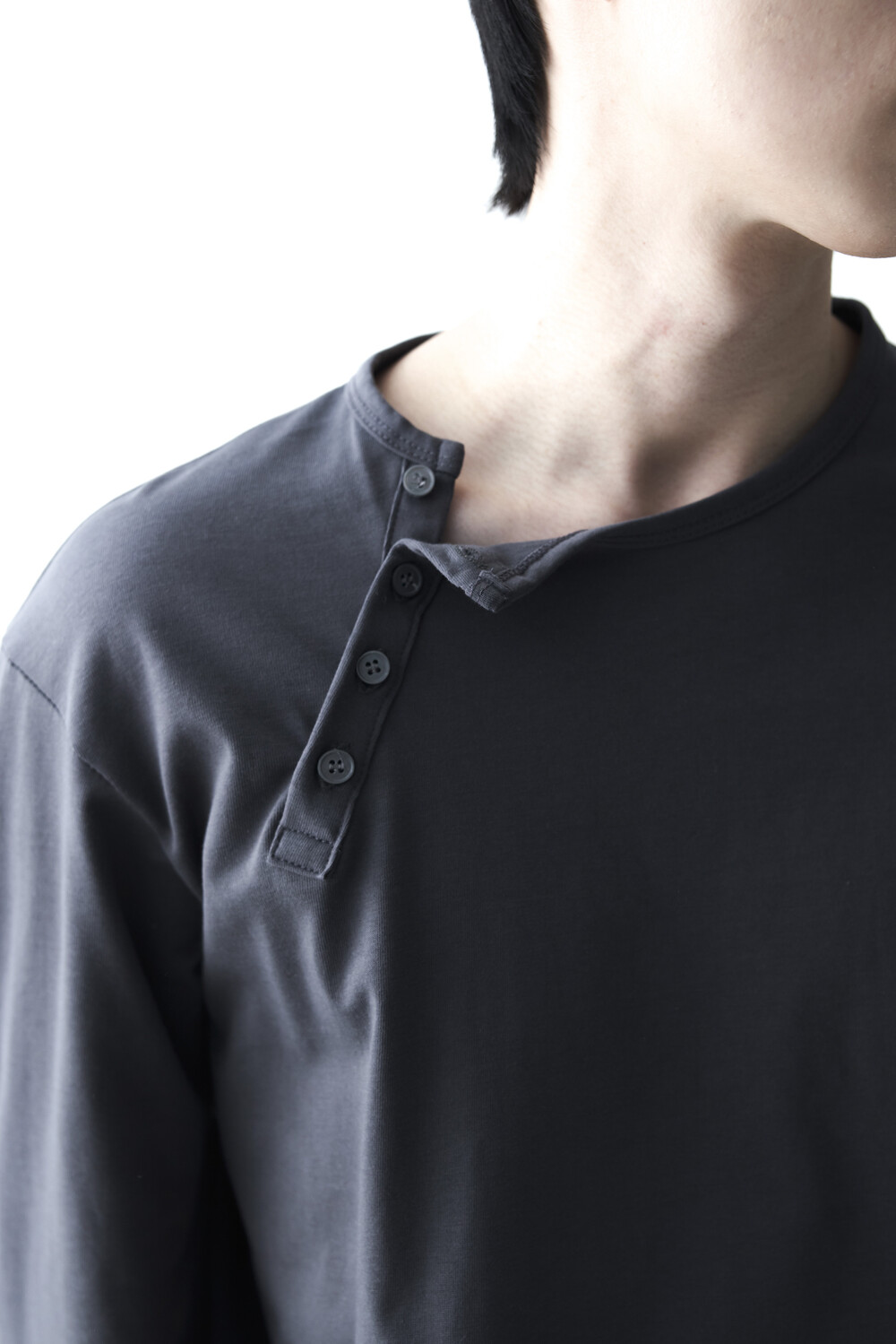 - 기존의 헨리넥 스타일이 아닌 사선 헨리넥 스타일이 적용된 롱슬리브 헨리넥 티셔츠 제품입니다. 크롭한 기장감과 가벼운 착용감으로 미니멀하면서도 캐쥬얼한 착용이 가능합니다.