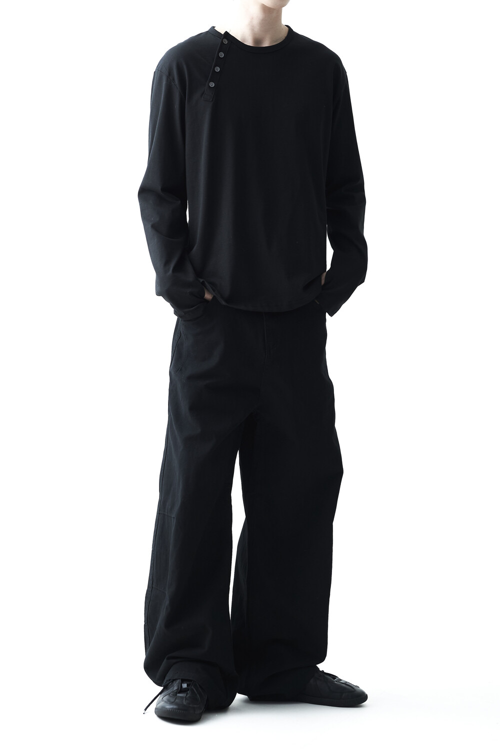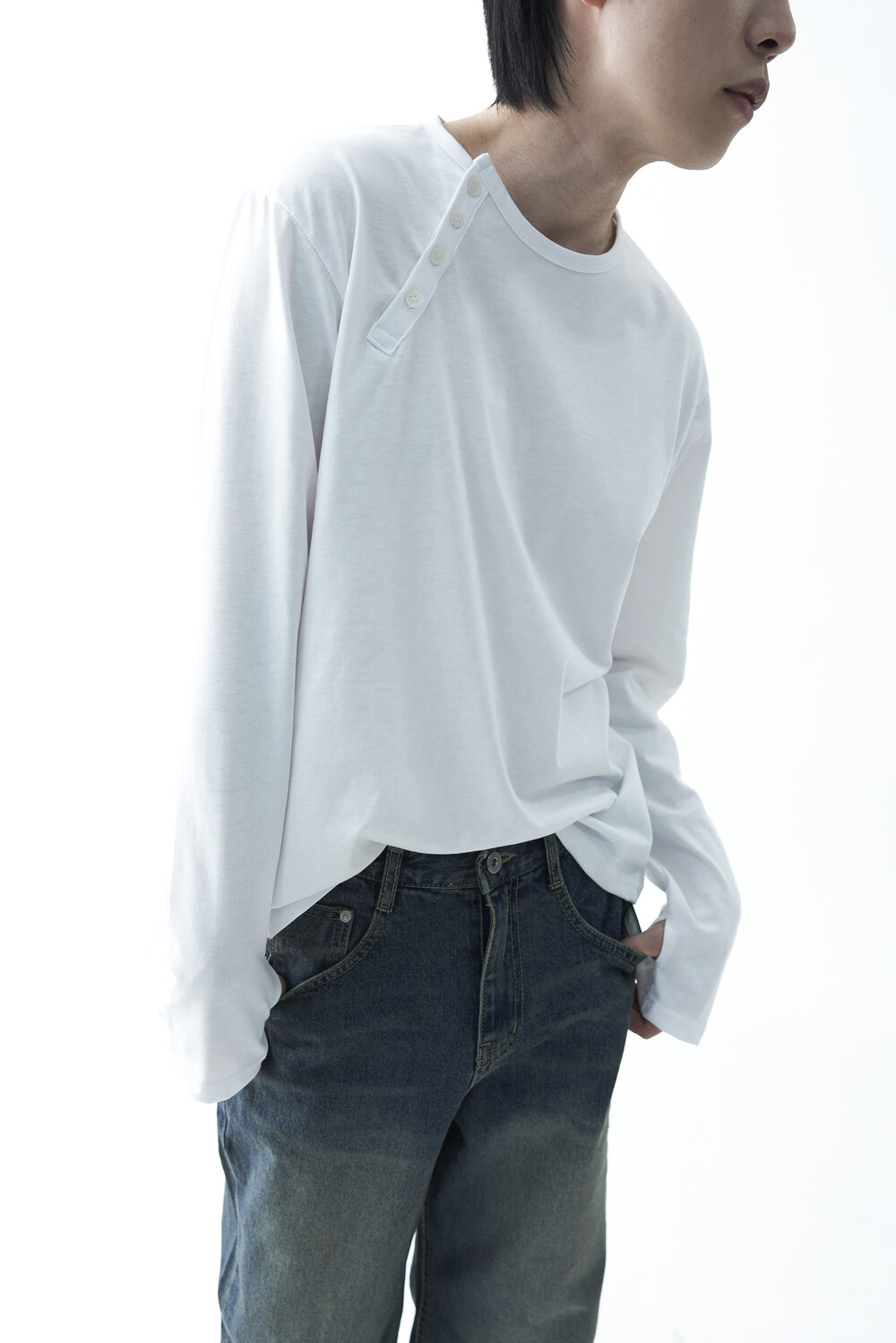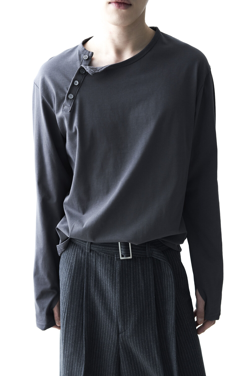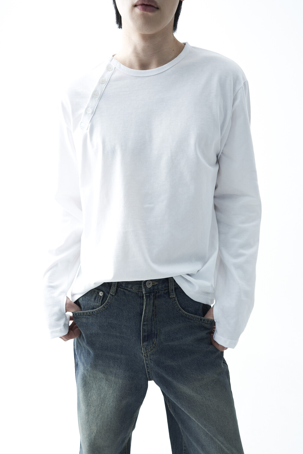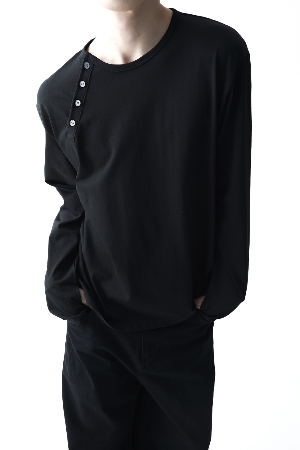 - 기존의 헨리넥 스타일이 아닌 사선 헨리넥 스타일이 적용된 롱슬리브 헨리넥 티셔츠 제품입니다. 크롭한 기장감과 가벼운 착용감으로 미니멀하면서도 캐쥬얼한 착용이 가능합니다.