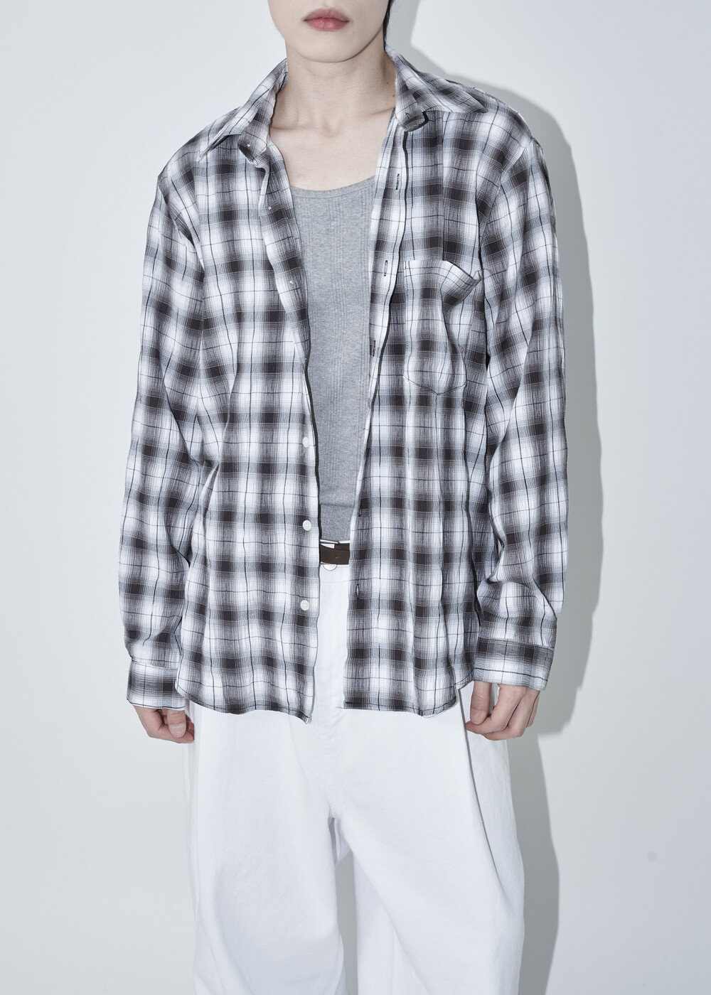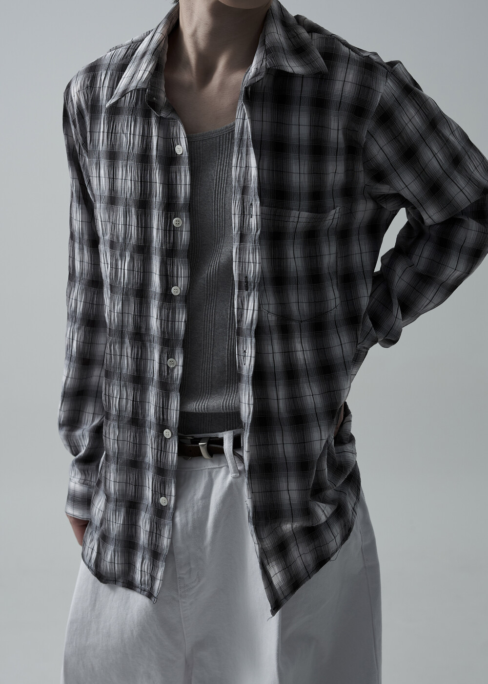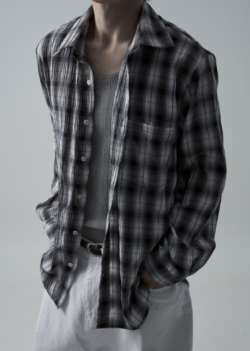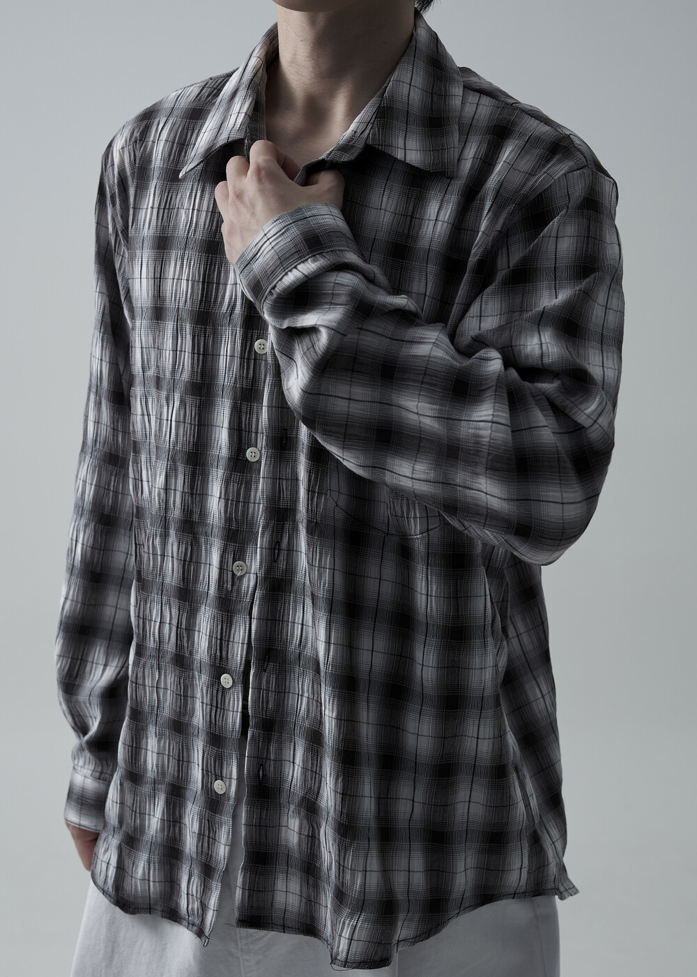 소프트한 폴리레이온 소재감의 링클 텍스쳐가 매력적인 체크 패턴 셔츠 제품으로 한여름에도 부담 없이 착용 가능한 캐쥬얼 셔츠 제품입니다.