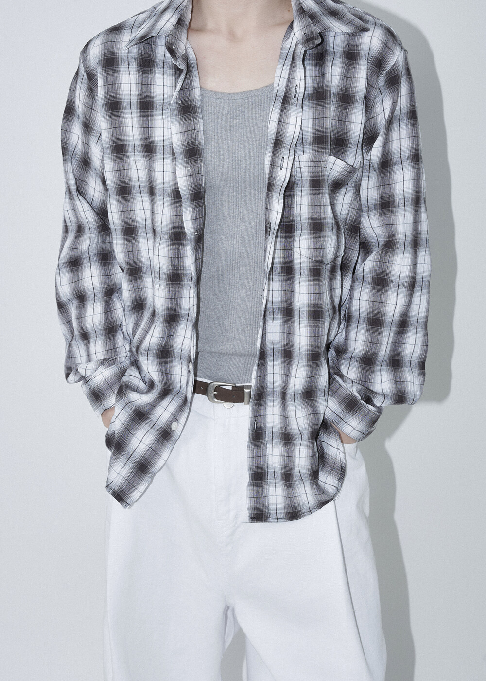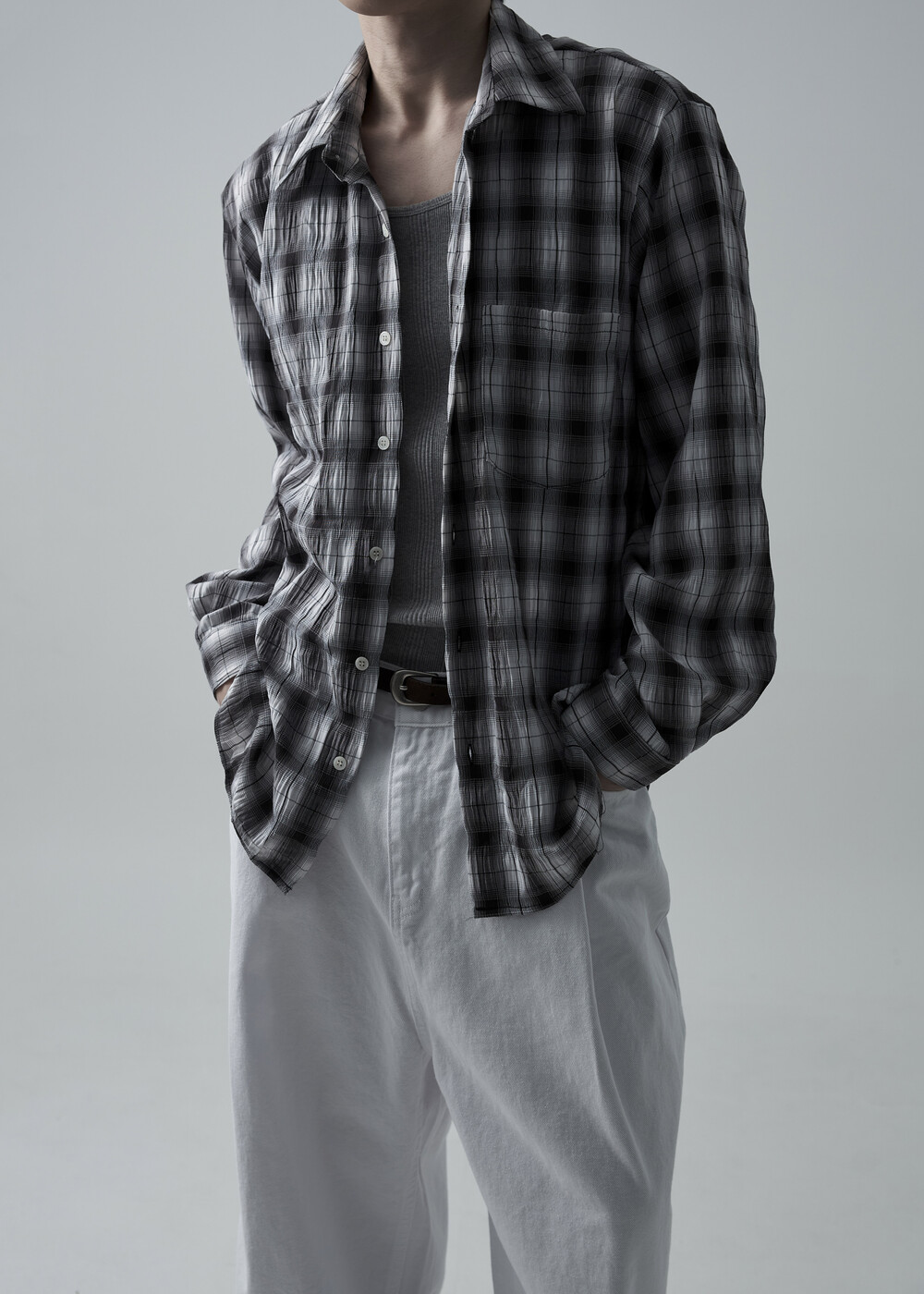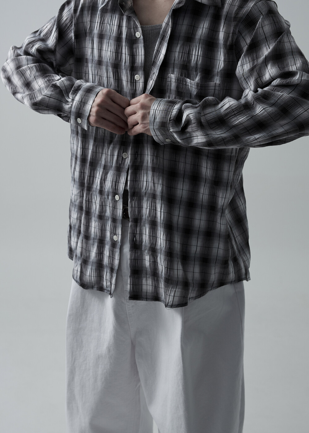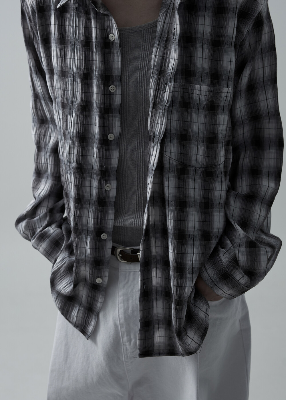 소프트한 폴리레이온 소재감의 링클 텍스쳐가 매력적인 체크 패턴 셔츠 제품으로 한여름에도 부담 없이 착용 가능한 캐쥬얼 셔츠 제품입니다.