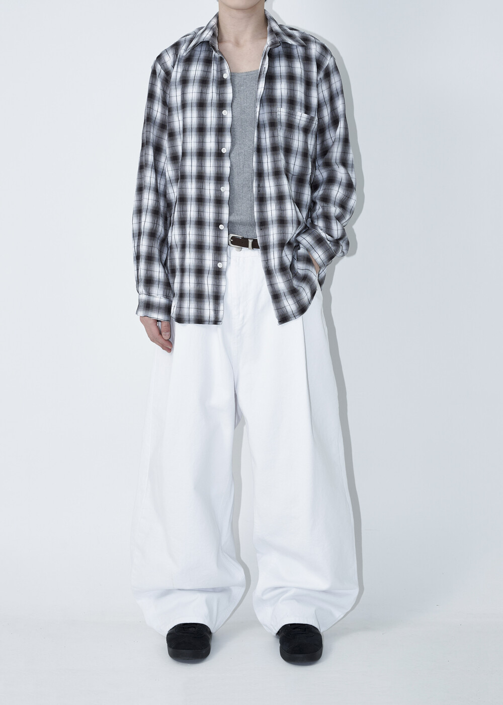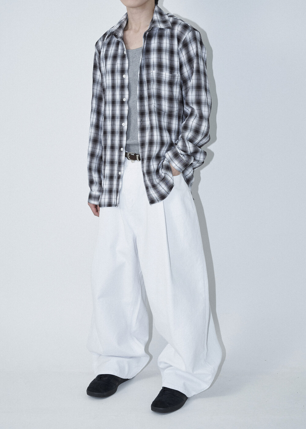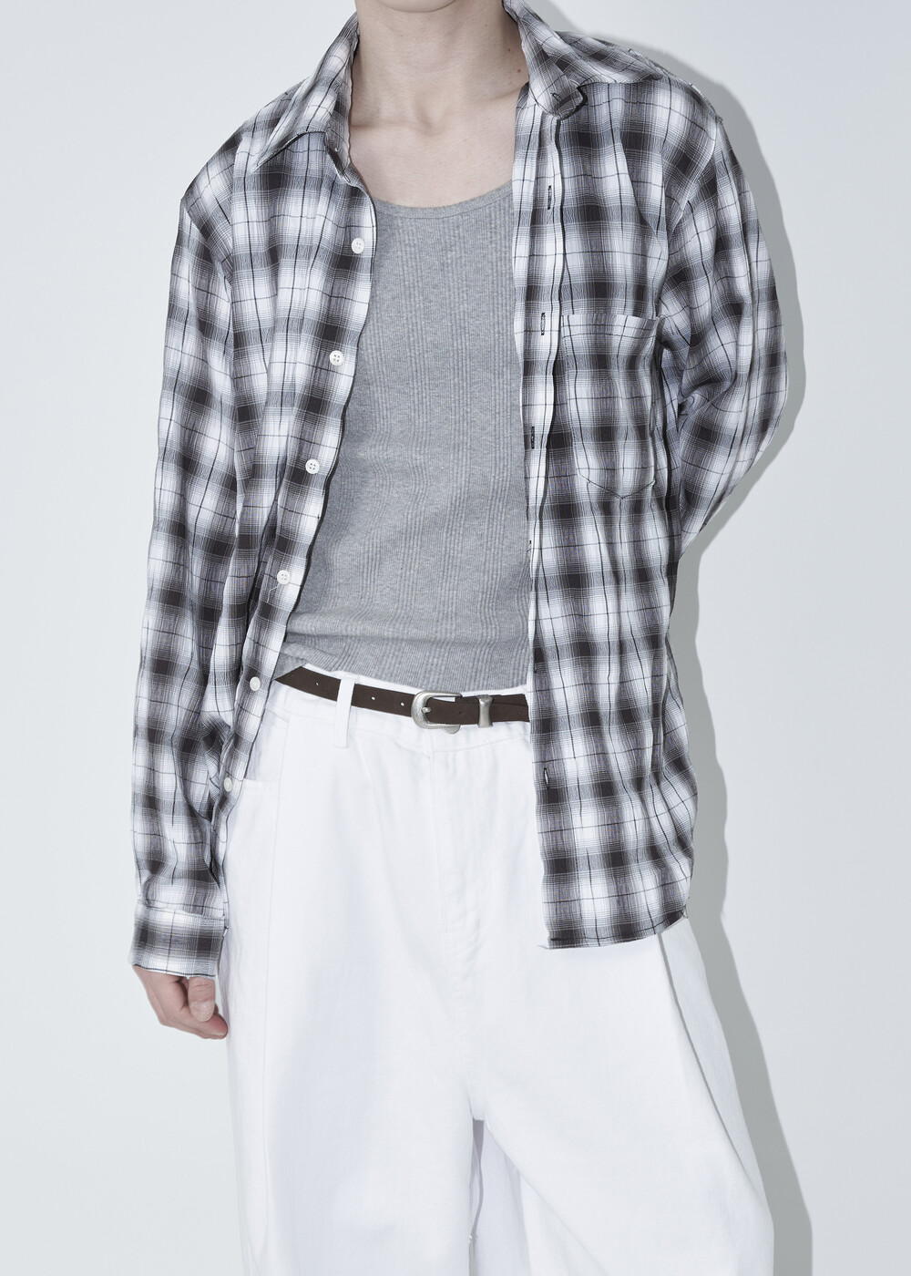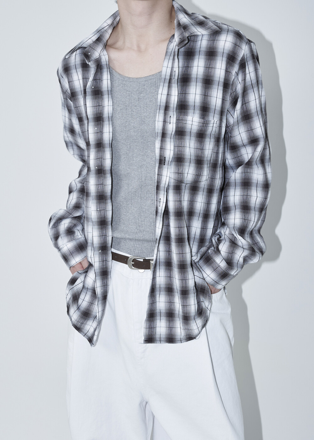 소프트한 폴리레이온 소재감의 링클 텍스쳐가 매력적인 체크 패턴 셔츠 제품으로 한여름에도 부담 없이 착용 가능한 캐쥬얼 셔츠 제품입니다.