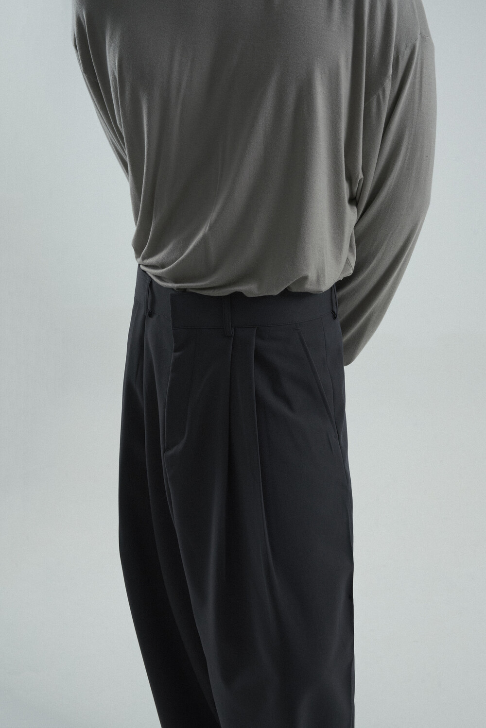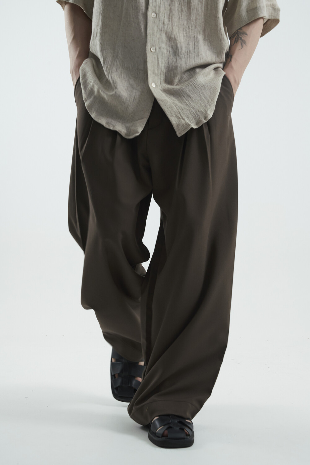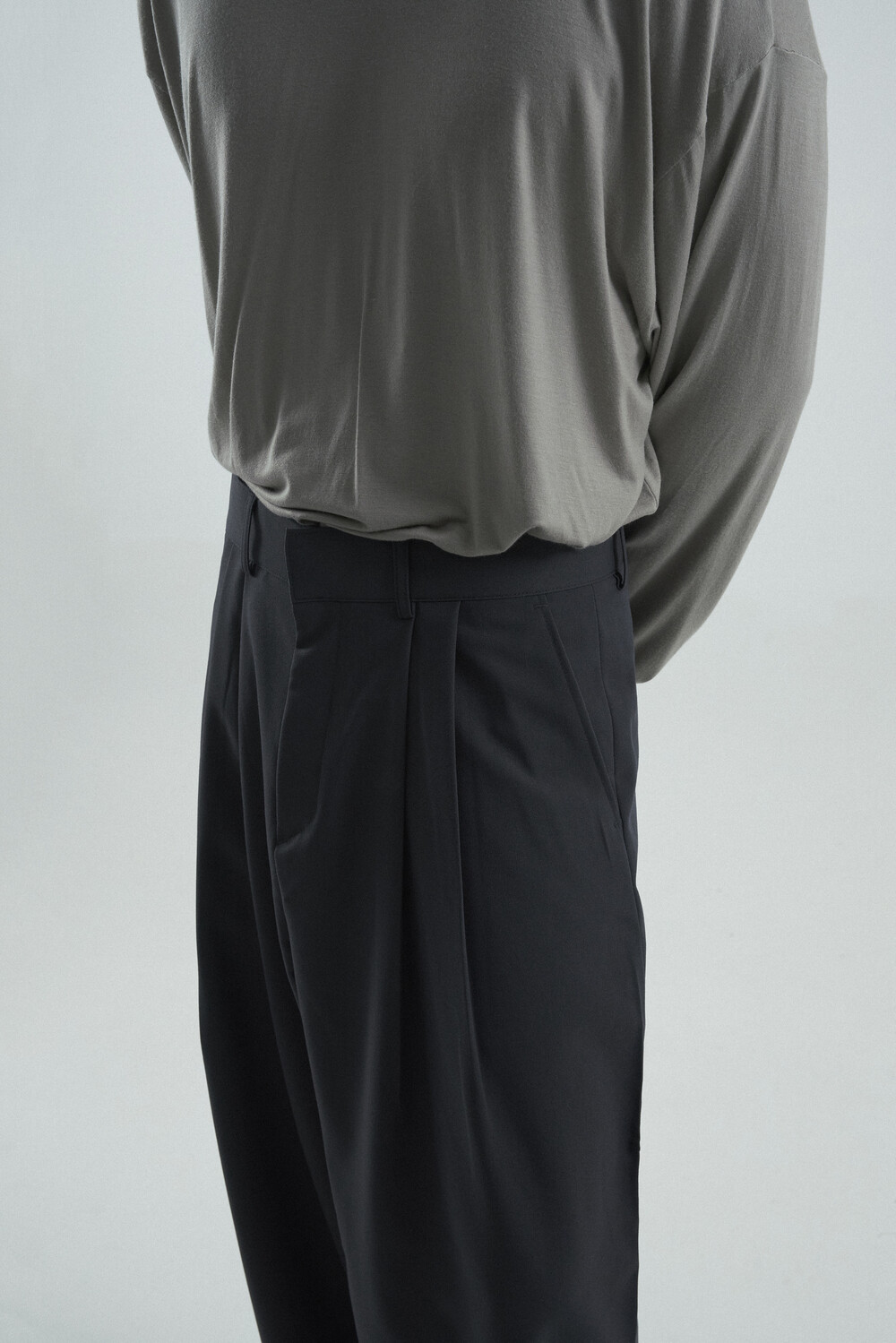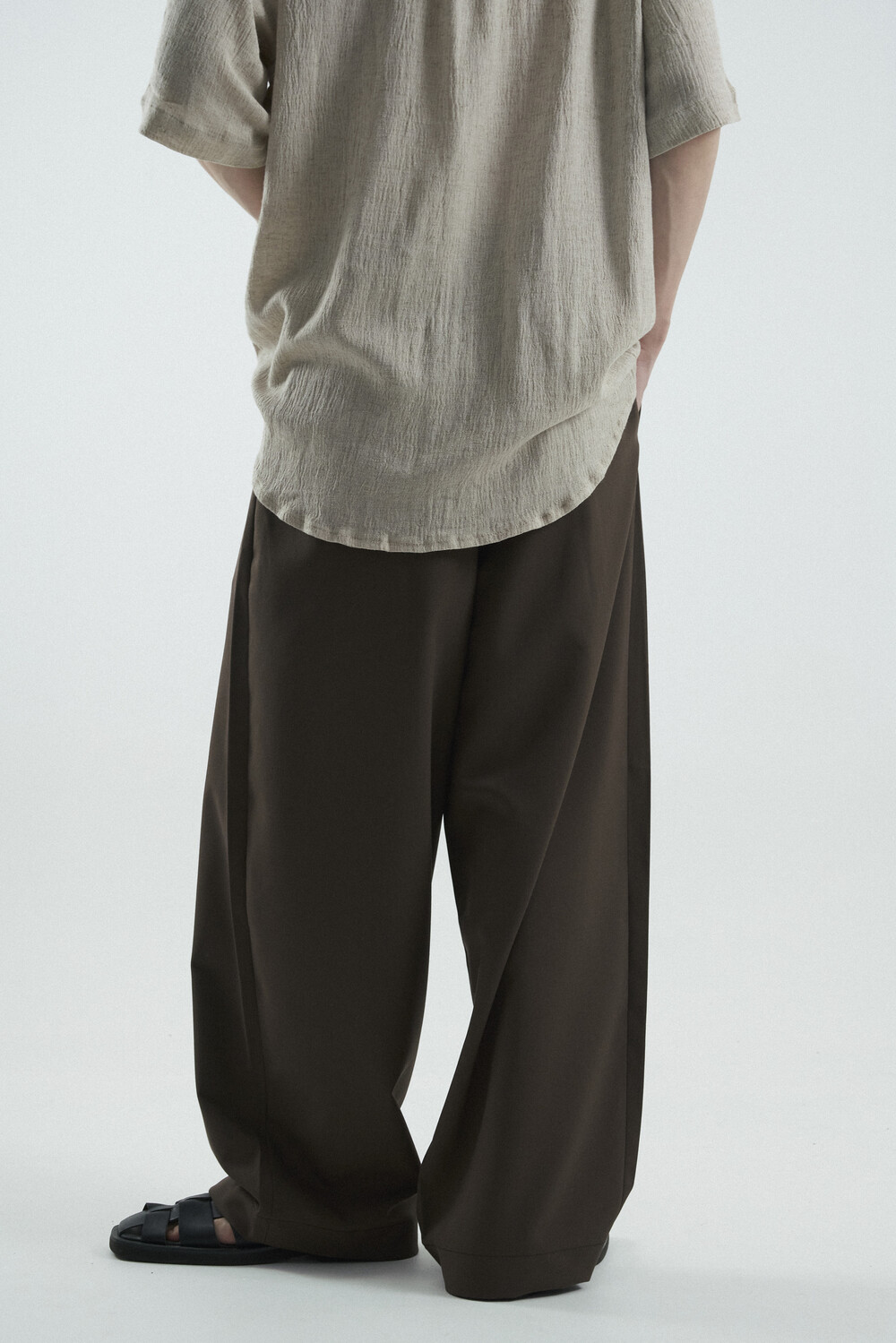 그동안의 무채색주의 오버와이드한 벌룬 와이드 팬츠들과 달리 세미 벌룬와이드 핏의 투핀턱 슬렉스 제품으로 크롭한 기장감을 보여주는 라인입니다. 전면부 날렵하게 자리잡은 투핀턱 디테일로 제작되었으며, 허리 비죠버튼 방식의 잠금방식이 아닌 히든으로 처리함으로서 더욱 미니멀한 무드가 연출됩니다. 레이온, 폴리 소재의 혼용과 더불러 스판 소재를 활용함으로서 더욱 활동시 편안한 착용감을 나타내는 제품입니다.