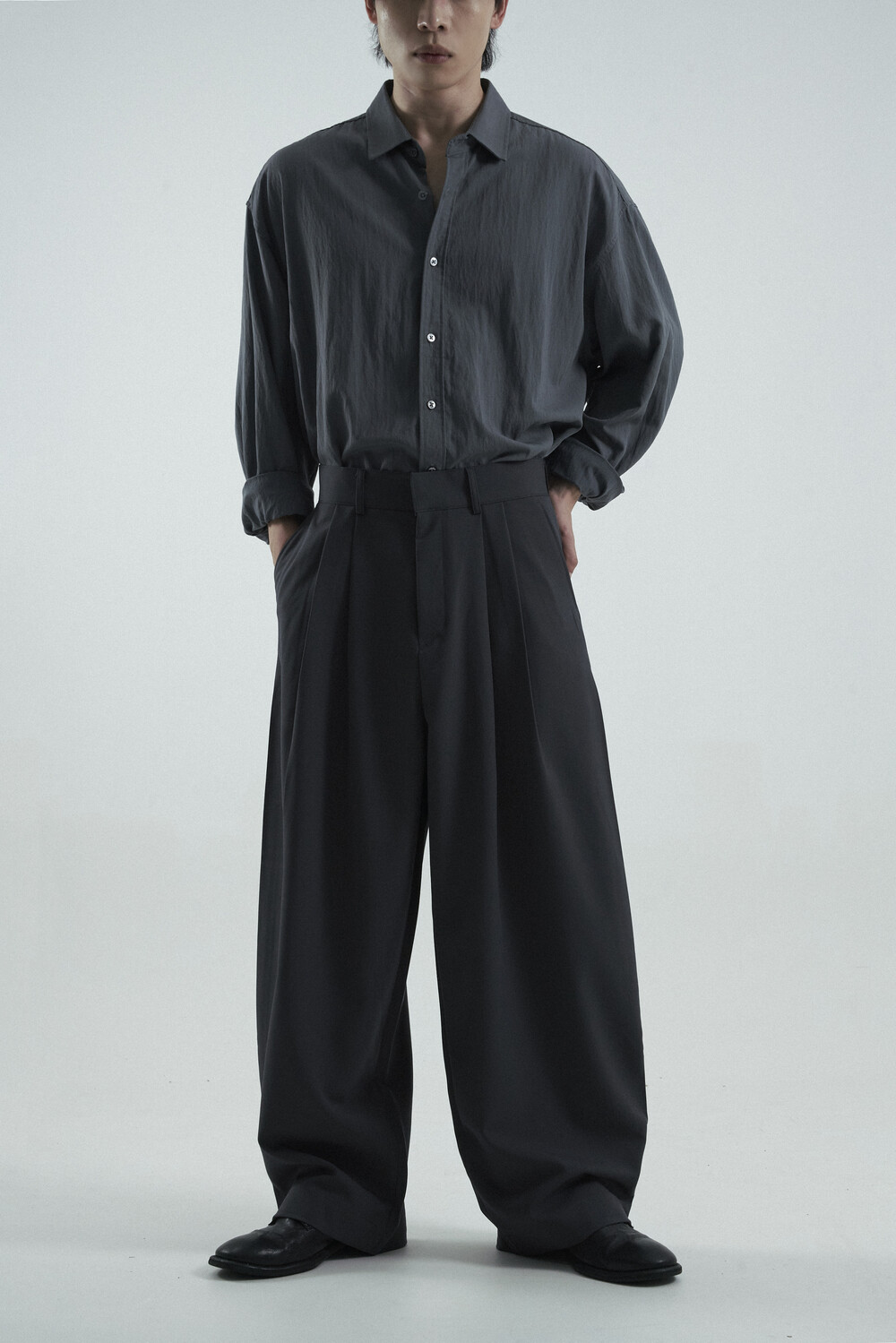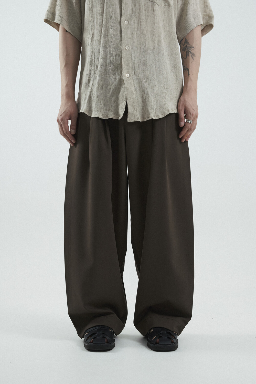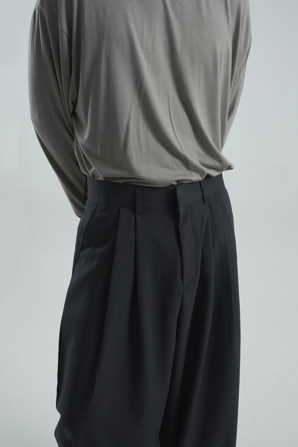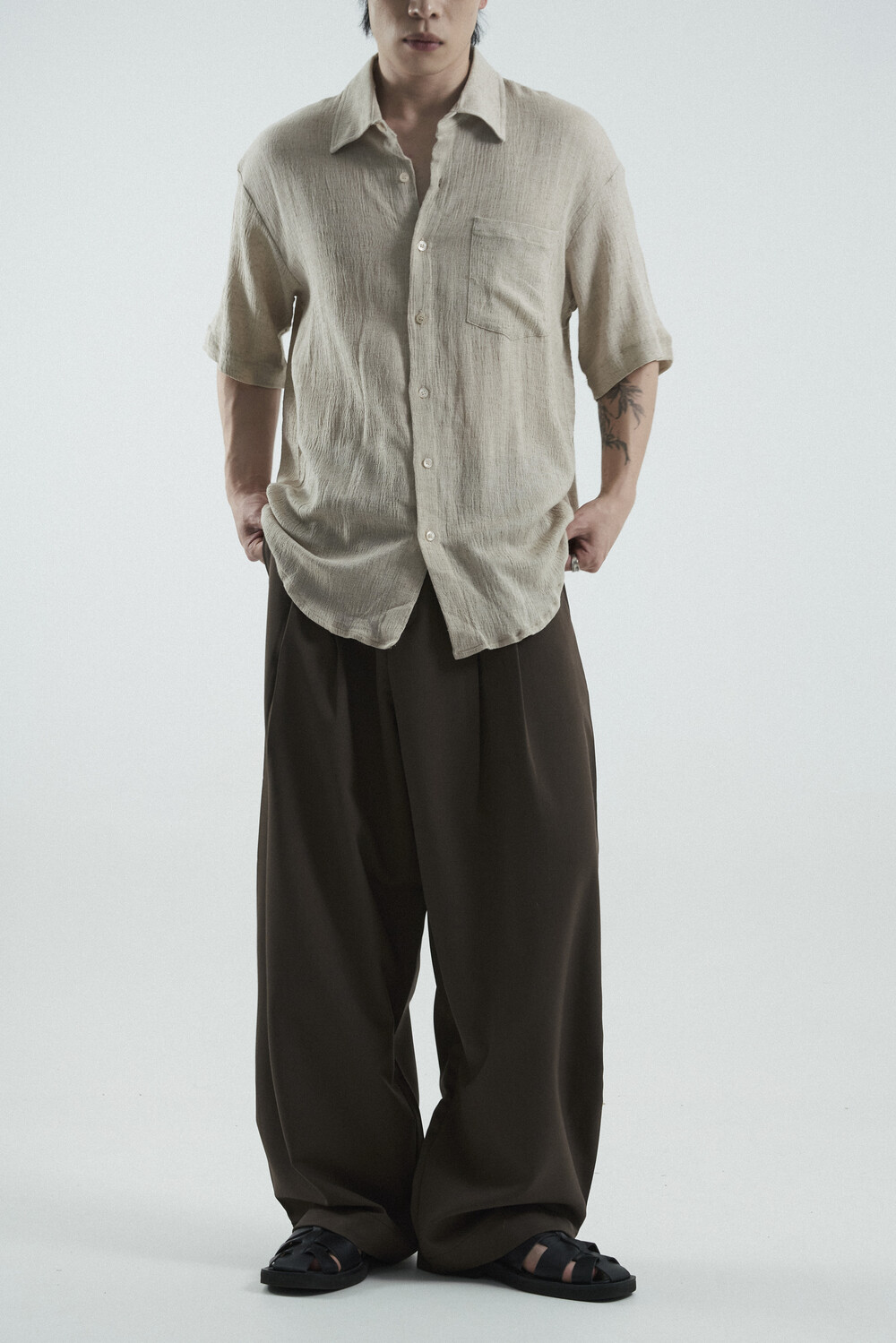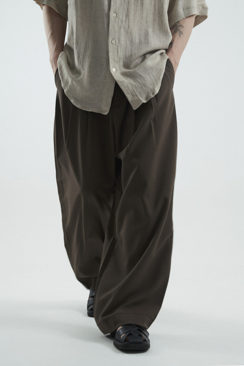 그동안의 무채색주의 오버와이드한 벌룬 와이드 팬츠들과 달리 세미 벌룬와이드 핏의 투핀턱 슬렉스 제품으로 크롭한 기장감을 보여주는 라인입니다. 전면부 날렵하게 자리잡은 투핀턱 디테일로 제작되었으며, 허리 비죠버튼 방식의 잠금방식이 아닌 히든으로 처리함으로서 더욱 미니멀한 무드가 연출됩니다. 레이온, 폴리 소재의 혼용과 더불러 스판 소재를 활용함으로서 더욱 활동시 편안한 착용감을 나타내는 제품입니다.