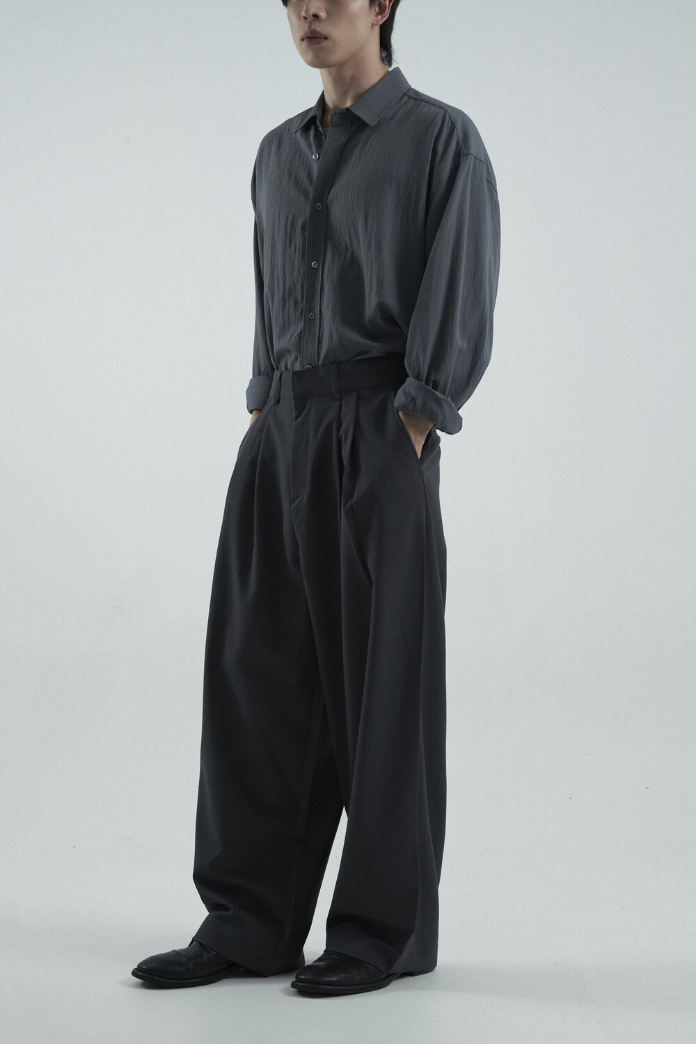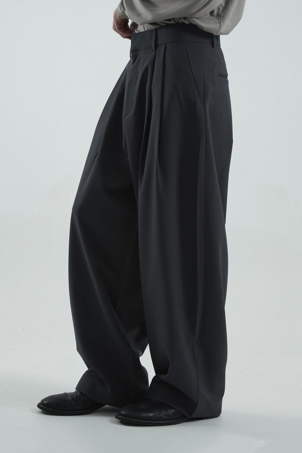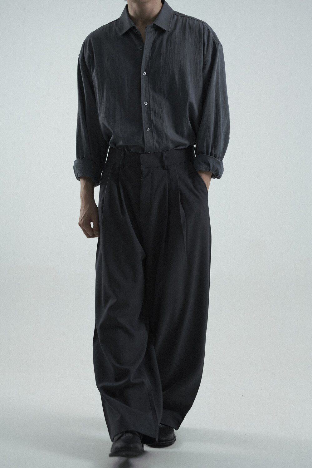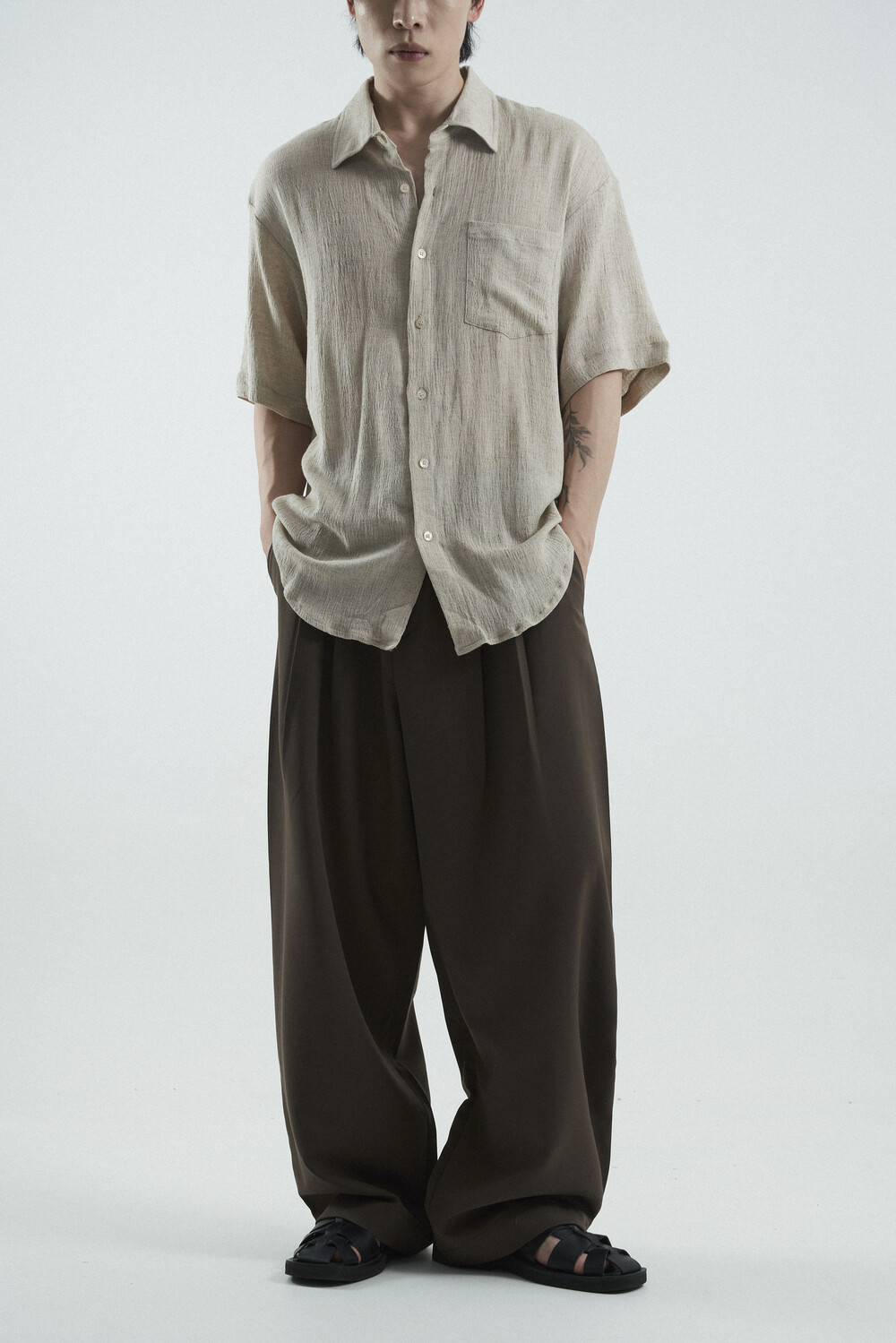 그동안의 무채색주의 오버와이드한 벌룬 와이드 팬츠들과 달리 세미 벌룬와이드 핏의 투핀턱 슬렉스 제품으로 크롭한 기장감을 보여주는 라인입니다. 전면부 날렵하게 자리잡은 투핀턱 디테일로 제작되었으며, 허리 비죠버튼 방식의 잠금방식이 아닌 히든으로 처리함으로서 더욱 미니멀한 무드가 연출됩니다. 레이온, 폴리 소재의 혼용과 더불러 스판 소재를 활용함으로서 더욱 활동시 편안한 착용감을 나타내는 제품입니다.