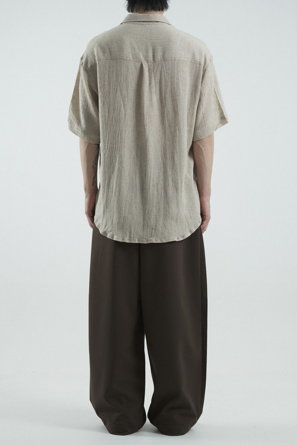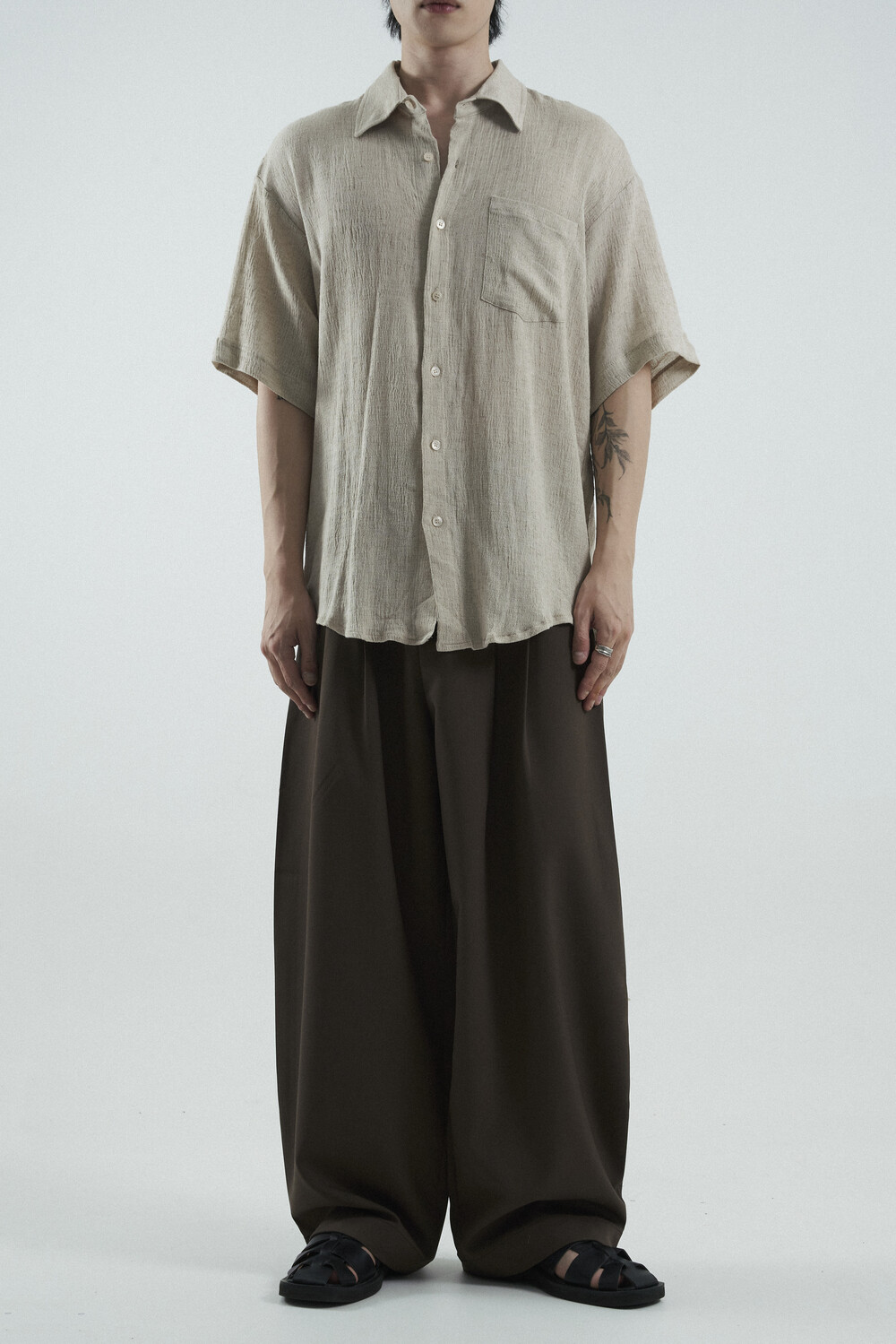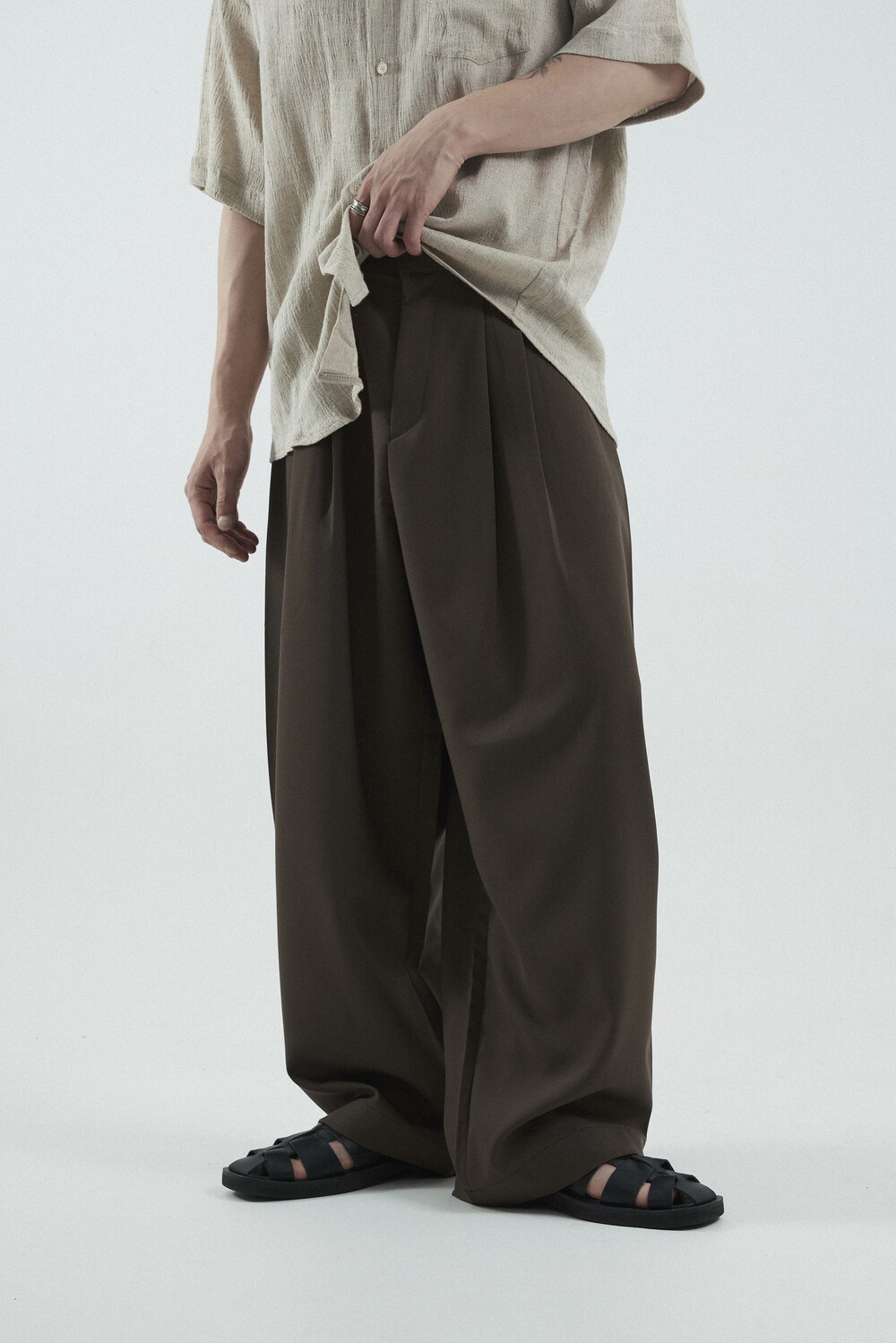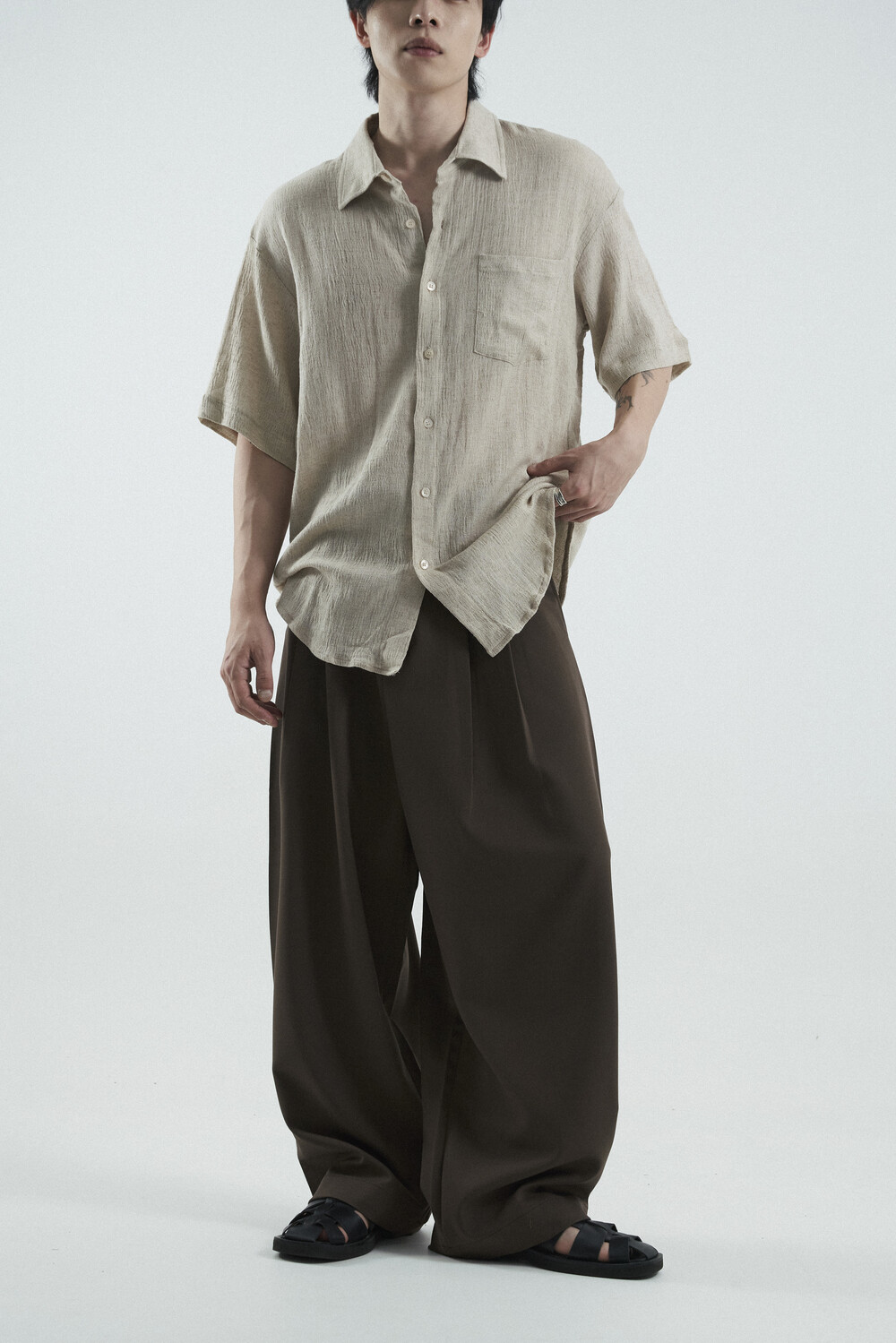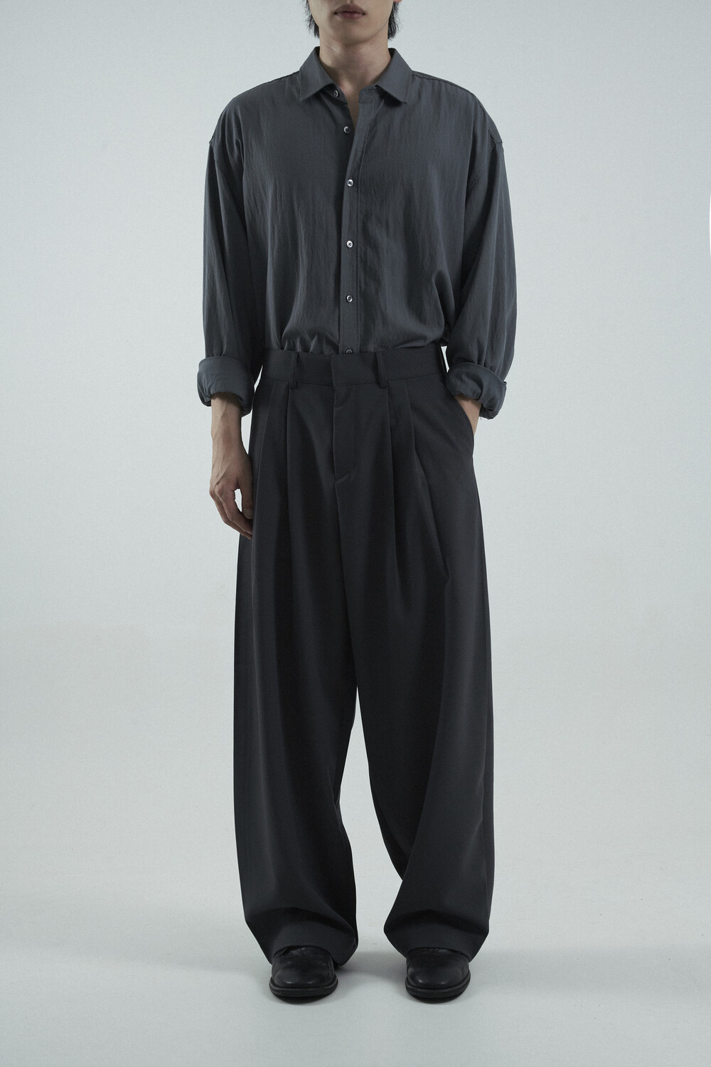 그동안의 무채색주의 오버와이드한 벌룬 와이드 팬츠들과 달리 세미 벌룬와이드 핏의 투핀턱 슬렉스 제품으로 크롭한 기장감을 보여주는 라인입니다. 전면부 날렵하게 자리잡은 투핀턱 디테일로 제작되었으며, 허리 비죠버튼 방식의 잠금방식이 아닌 히든으로 처리함으로서 더욱 미니멀한 무드가 연출됩니다. 레이온, 폴리 소재의 혼용과 더불러 스판 소재를 활용함으로서 더욱 활동시 편안한 착용감을 나타내는 제품입니다.
