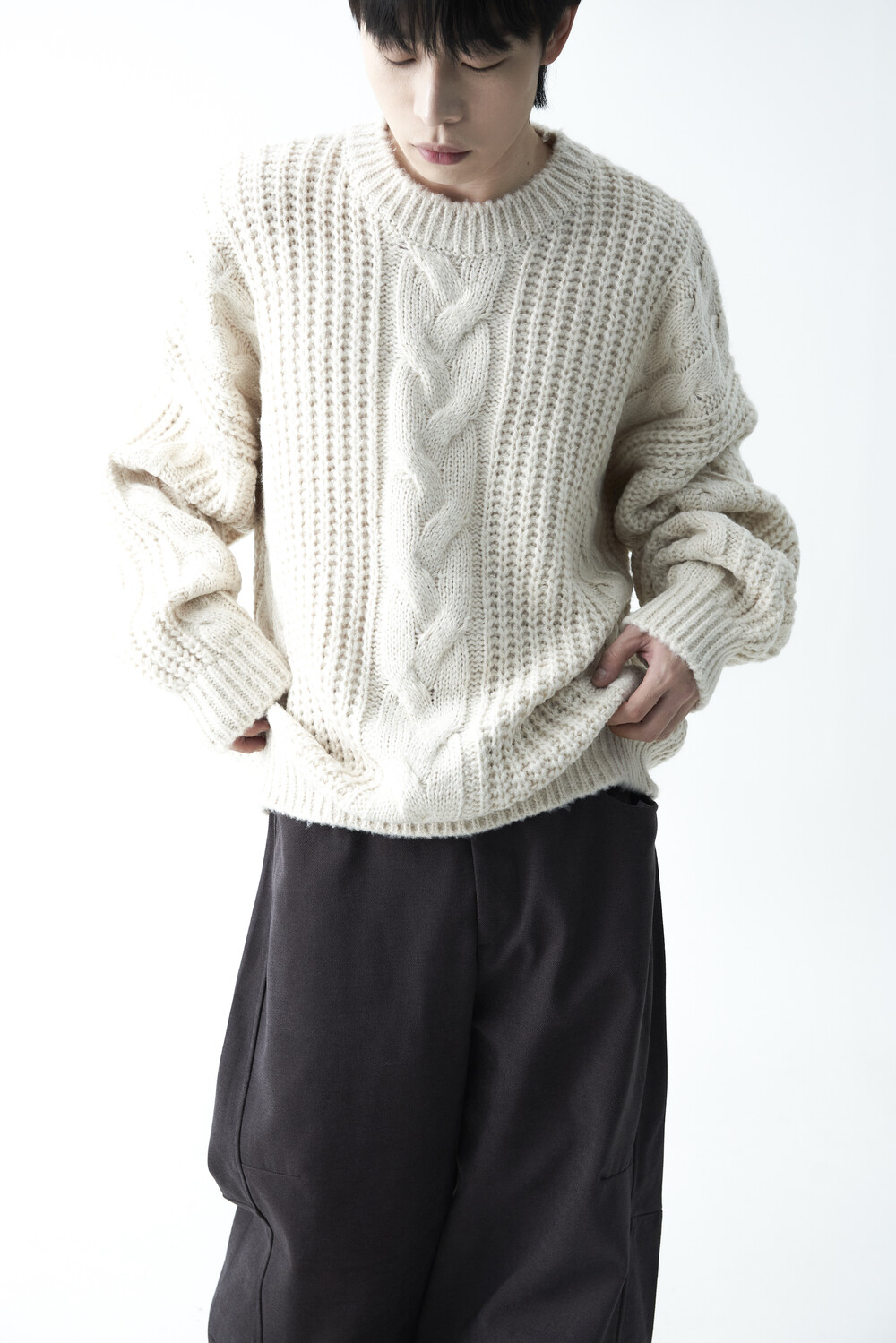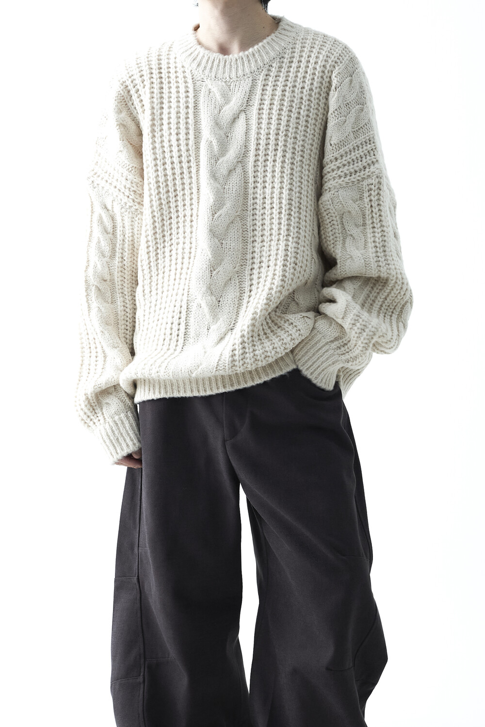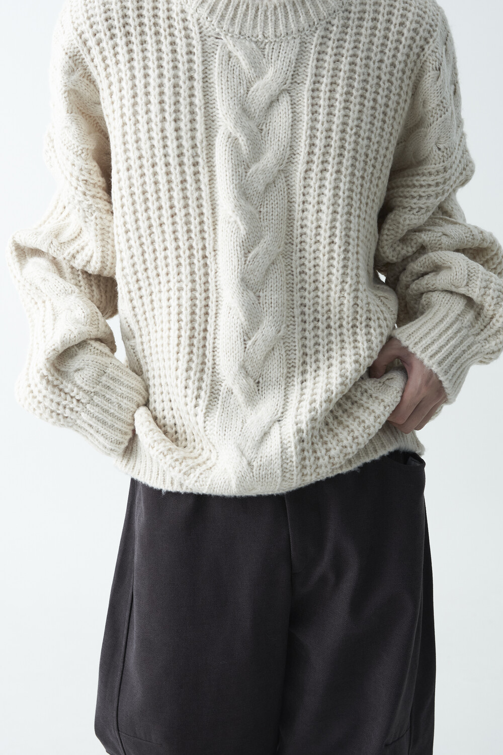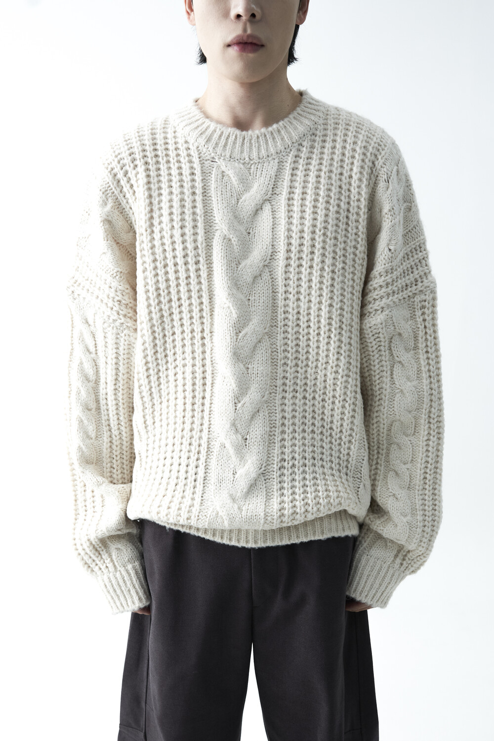 전면부 중앙 볼드한 꽈배기 패턴이 적용되었으며, 전체적으로 두께감이 확연하게 느껴지는 니트 제품으로 라운드 넥 스타일로 구성되었습니다. 롱한 소매와 와이드한 숄더라인의 기장감과 대비되는 크롭한 기장감으로 매력적인 아웃핏을 연출하실 수 있습니다.