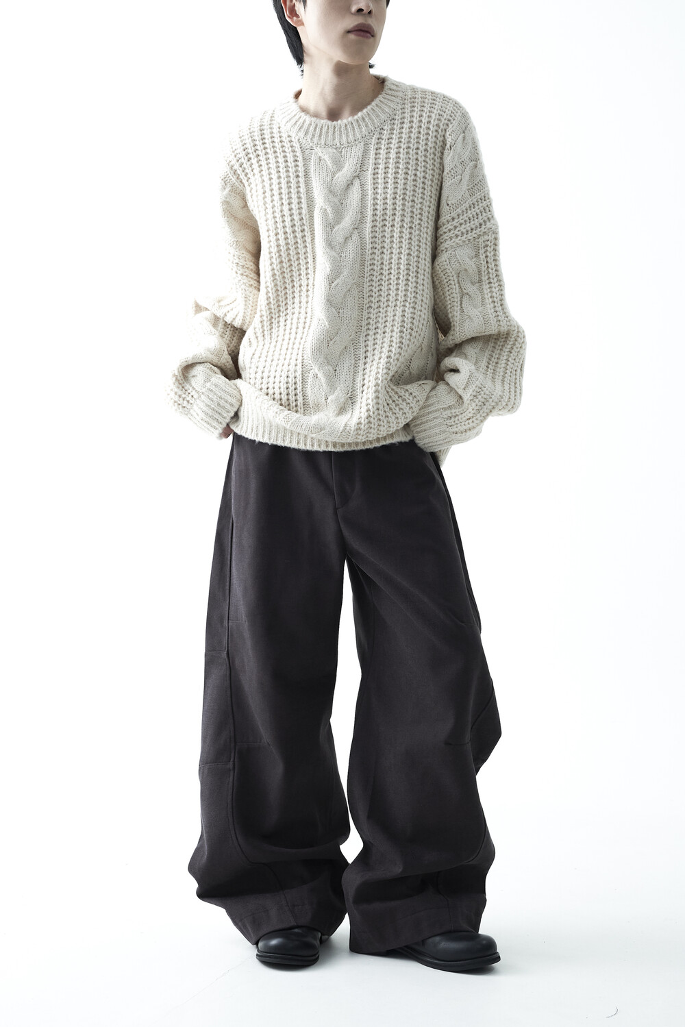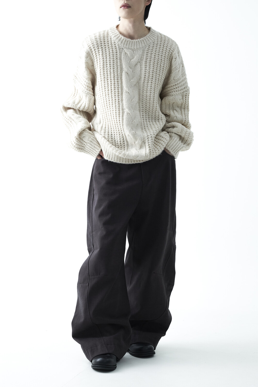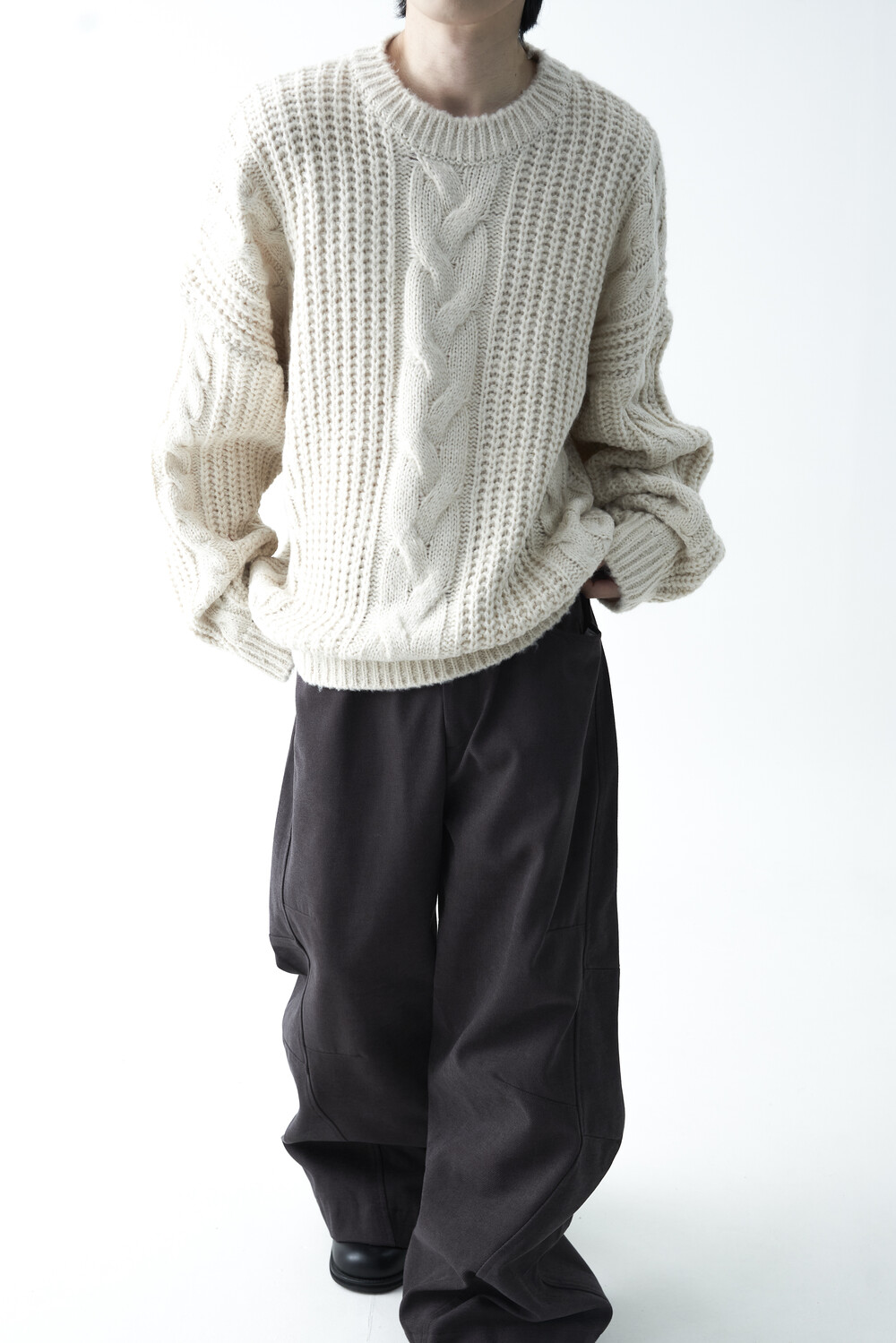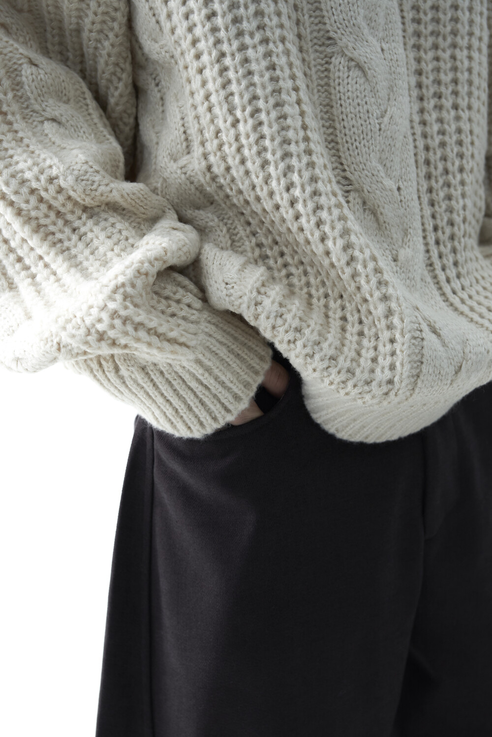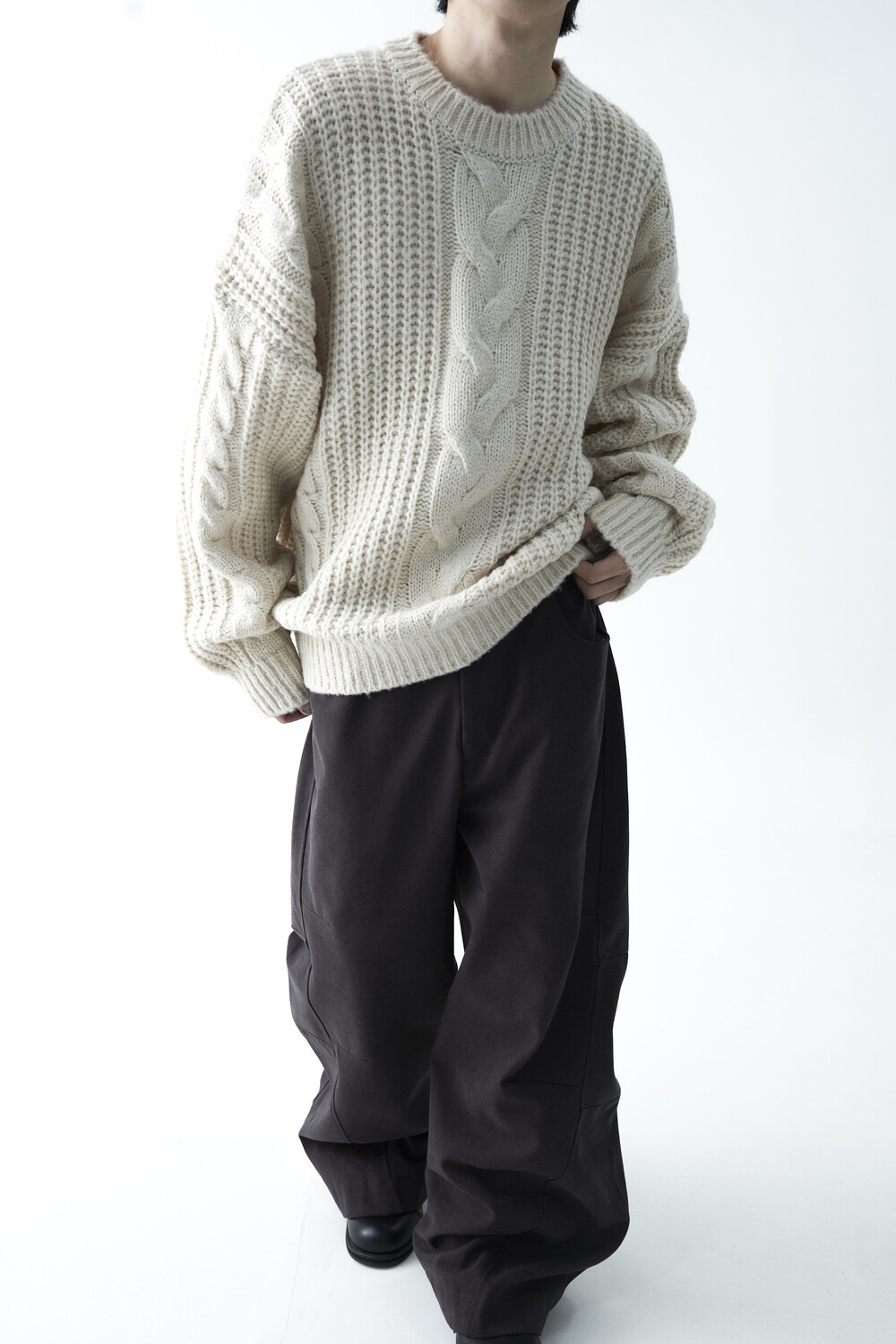 전면부 중앙 볼드한 꽈배기 패턴이 적용되었으며, 전체적으로 두께감이 확연하게 느껴지는 니트 제품으로 라운드 넥 스타일로 구성되었습니다. 롱한 소매와 와이드한 숄더라인의 기장감과 대비되는 크롭한 기장감으로 매력적인 아웃핏을 연출하실 수 있습니다.