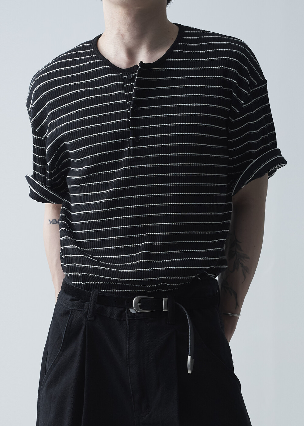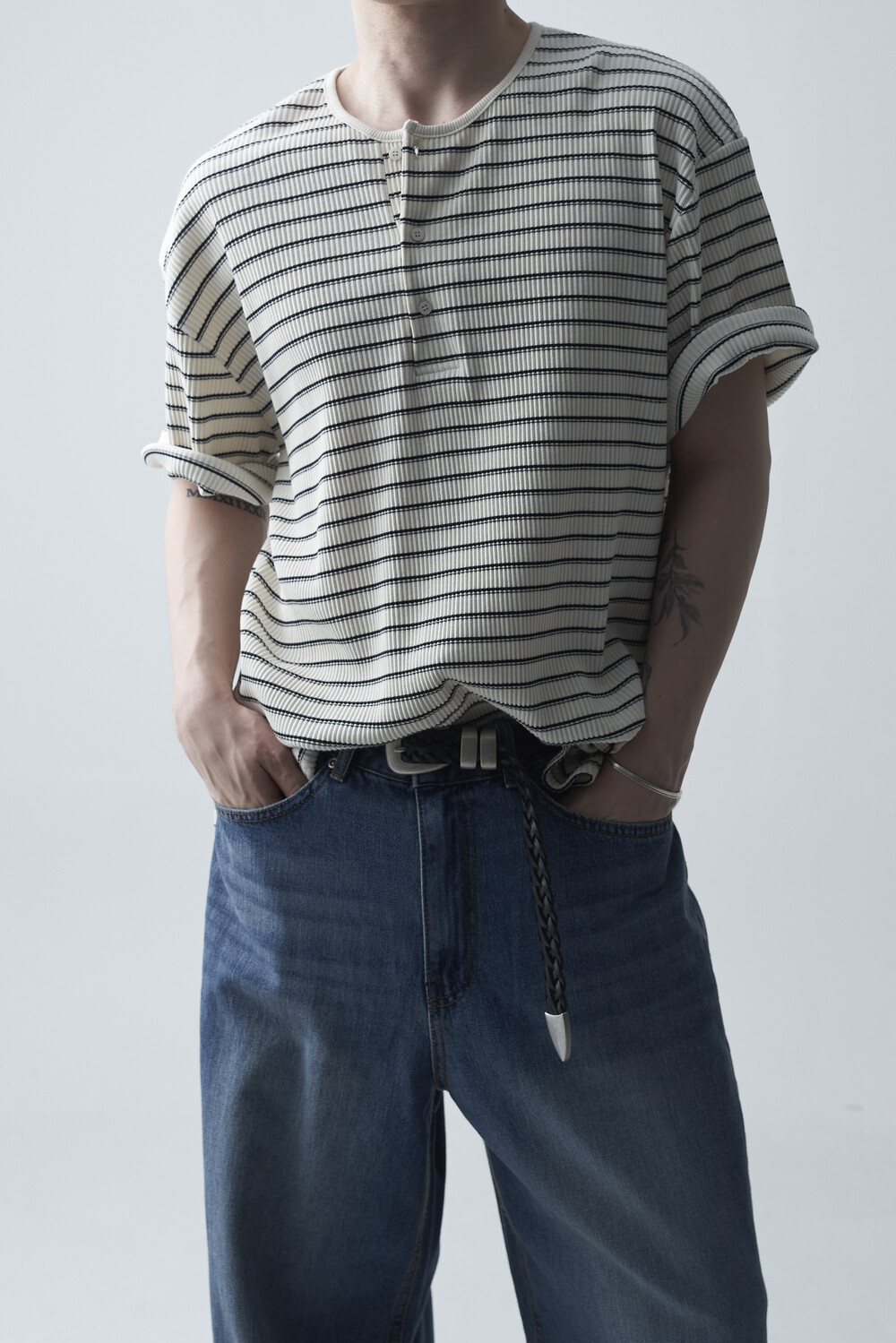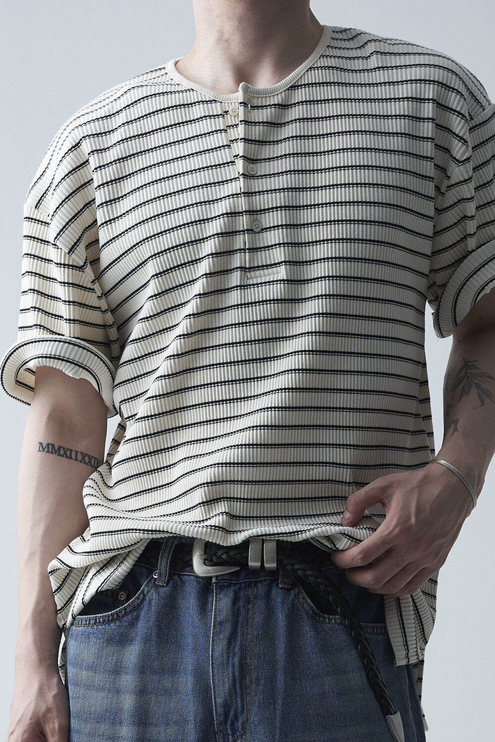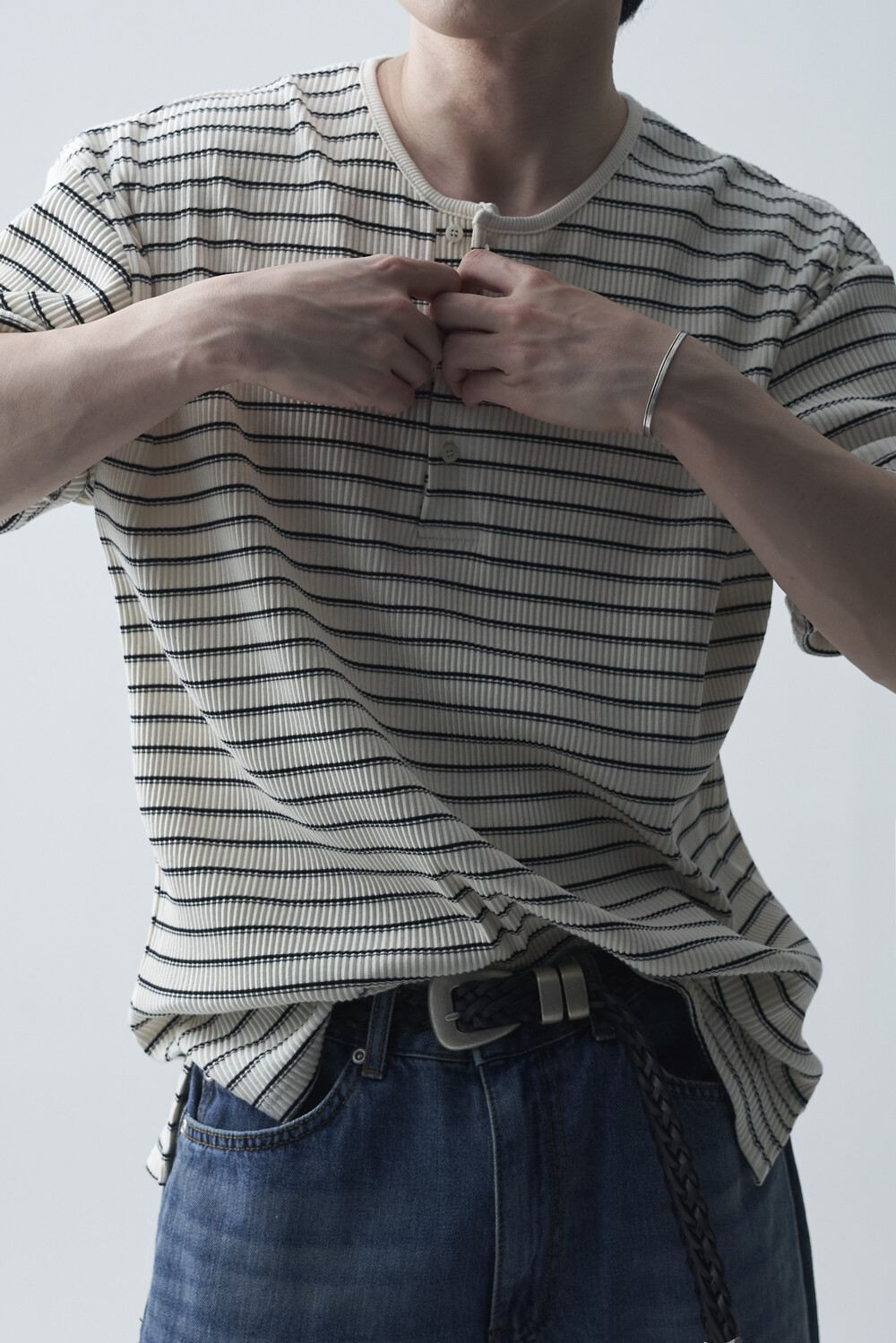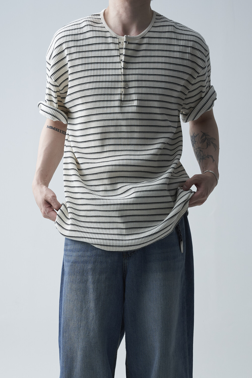 미니멀한 하프 헨리넥 티셔츠 제품으로 편안하면서도 모던한 스트라이프 패턴으로 깔끔한 아웃핏을 연출합니다.