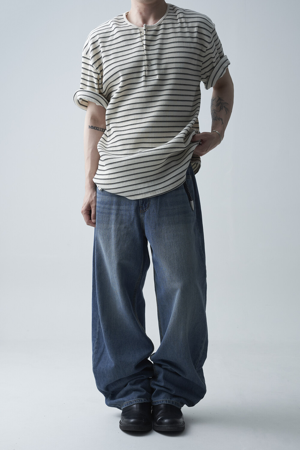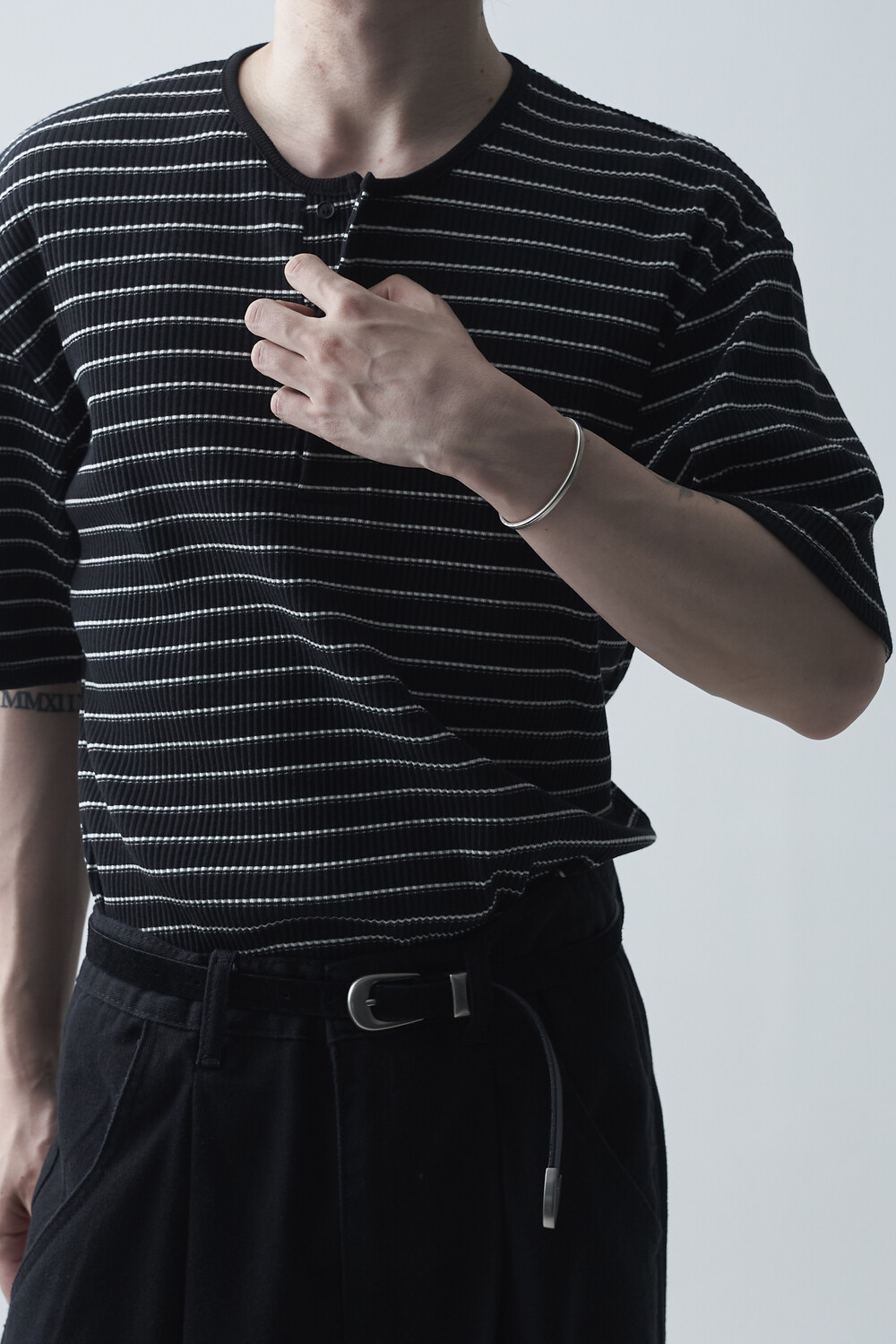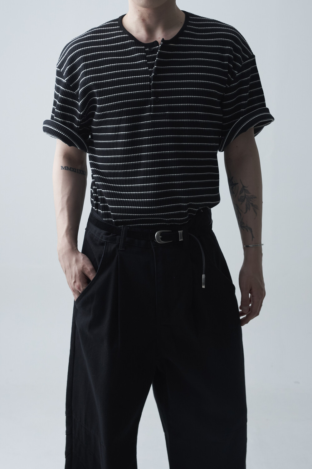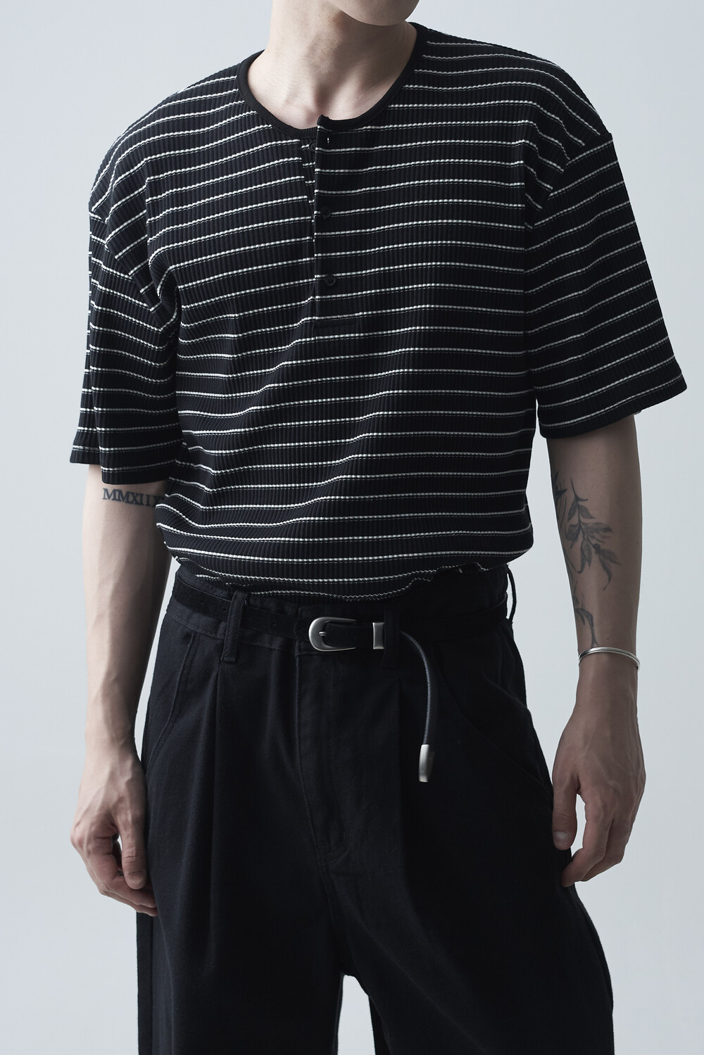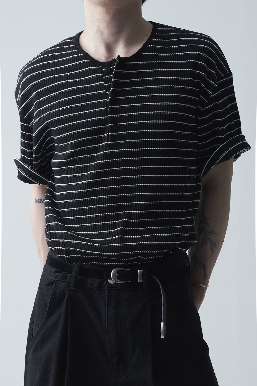미니멀한 하프 헨리넥 티셔츠 제품으로 편안하면서도 모던한 스트라이프 패턴으로 깔끔한 아웃핏을 연출합니다.